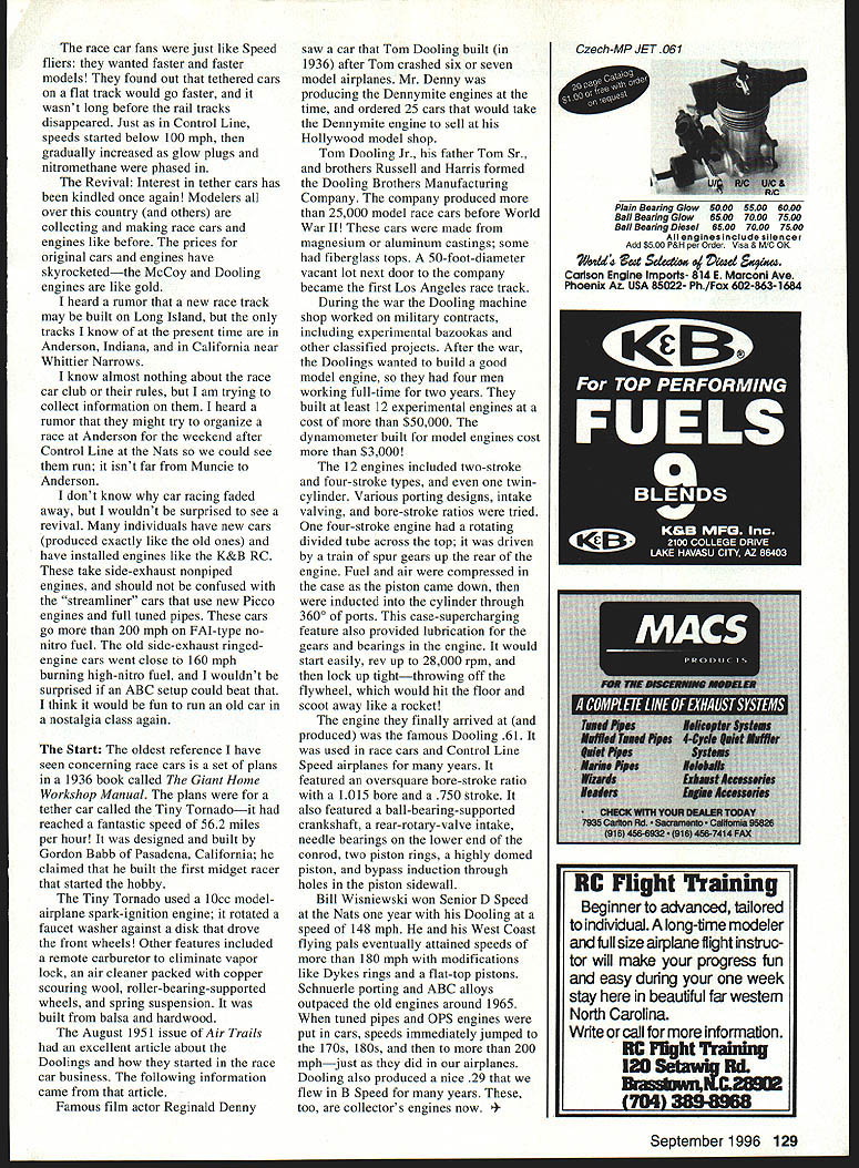 CONTROL LINE SPEED SPRING What wonderful word us living up long cold winters first Speed contest year two weeks away write early May As usual dont have airplanes ready should Ive working 21 29 40 65 engines Im rechroming some some getting new heads things like havent touched jets since last year want try suction fuel feed instead pressure year Lafayette Esquadrille Control Line Club St Louis has scheduled Speed Racing contest May 19 tried early last year spring flooding put six feet water flying field Buder Park very little snow winter maybe wont happen again Lapping My column about engine-lapping techniques May issue has generated lot interest among RC fliers Several have talked said Gee really works couple picked up 1000 rpm flying prop after removing shiny spots lower part sleeve flier improved Cox engine 23000 rpm 27000 drawings made internal external laps models use theyre necessarily types will work Commercial laps available can purchased industrial-supply firms kind has split-bronze sleeve tapered arbor screw end expands bronze buy oversize turn down outside diameter OD fit sleeve diameter type lap works very well hop-up procedures have facilities make own laps look around check machine-tool supply companies areayou may able find what need Ellipses Speed flyers building 21 Proto models should have quite turnout Nats Im building forgot much work isthe last Proto built old SuperTigre 29-powered model back 60s Im using same elliptical planform wing stabilizer used original Since must have 125 square inches area wing important draw build accurate ellipse can accurately calculate its area area true elliptical wing stab pi 314 multiplied one-half wingspan multiplied one-half chord An approximate method can used check calculations measure chord location 1/6 wingspan wingtip multiply dimension wingspan give area Race Cars may remember gas-powered model race cars popular 40s SOs went fast made lot noise just like airplanes now Some best engines D Speed came race car modelers such Dick McCoy Dooling brothers model cars popular race tracks over country Most think rail tracks vertical- slanted-board tracks flanged rails bolted rails retained guided cars Pairs ball bearings front rear car ran against rails Some tracks allowed six cars race against other Can imagine five six snorting roaring smoke-belching 60-powered cars going against other same time must have wild early Rat Racing would fly four airplanes circle US FAI Speed Team standing L-R Will Naemura Tommy Jerry Thomas test stand measures jet-engine thrust Engine Brown Billy Hughes Junior Bobby Fogg front compresses spring thrust indicated dial 128 Model Aviation Hanbeck built model elliptical wing stab 21 Sport Speed K&B 21 turns 65 x 6 APC prop race car fans just like Speed fliers wanted faster faster models found out tethered cars flat track would go faster wasnt long before rail tracks disappeared Just Control Line speeds started below 100 mph gradually increased glow plugs nitromethane phased Revival Interest tether cars has kindled once again Modelers over country others collecting making race cars engines like before prices original cars engines have skyrocketedthe McCoy Dooling engines like gold heard rumor new race track may built Long Island tracks know present time Anderson Indiana California near Whittier Narrows know almost nothing about race car club rules am trying collect information heard rumor might try organize race Anderson weekend after Control Line Nats could see run isnt far Muncie Anderson dont know car racing faded away wouldnt surprised see revival individuals have new cars produced exactly like old ones have installed engines like K&B RC take side-exhaust nonpiped engines should confused streamliner cars use new Picco engines full tuned pipes cars go 200 mph FAI-type no nitro fuel old side-exhaust ringedengine cars went close 160 mph burning high-nitro fuel wouldnt surprised ABC setup could beat think would fun run old car nostalgia class again Start oldest reference have seen concerning race cars set plans 1936 book called Giant Home Workshop Manual plans tether car called Tiny Tornadoit reached fantastic speed 562 miles per hour designed built Gordon Babb Pasadena California claimed built first midget racer started hobby Tiny Tornado used 10cc modelairplane spark-ignition engine rotated faucet washer against disk drove front wheels Other features included remote carburetor eliminate vapor lock air cleaner packed copper scouring wool roller-bearing-supported wheels spring suspension built balsa hardwood August 1951 issue Air Trails excellent article about Doolings started race car business following information came article Famous film actor Reginald Denny saw car Tom Dooling built 1936 after Tom crashed six seven model airplanes Mr Denny producing Dennymite engines time ordered 25 cars would take Dennymite engine sell Hollywood model shop Tom Dooling Jr father Tom Sr brothers Russell Harris formed Dooling Brothers Manufacturing Company company produced 25000 model race cars before World War II cars made magnesium aluminum castings some fiberglass tops 50-foot-diameter vacant lot next door company became first Los Angeles race track During war Dooling machine shop worked military contracts including experimental bazookas other classified projects After war Doolings wanted build good model engine four men working full-time two years built least 12 experimental engines cost $50000 dynamometer built model engines cost $3000 12 engines included two-stroke four-stroke types twincylinder Various porting designs intake valving bore-stroke ratios tried four-stroke engine rotating divided tube across top driven train spur gears up rear engine Fuel air compressed case piston came down inducted cylinder through 3600 ports case-supercharging feature also provided lubrication gears bearings engine would start easily rev up 28000 rpm lock up tightthrowing off flywheel would hit floor scoot away like rocket engine finally ar