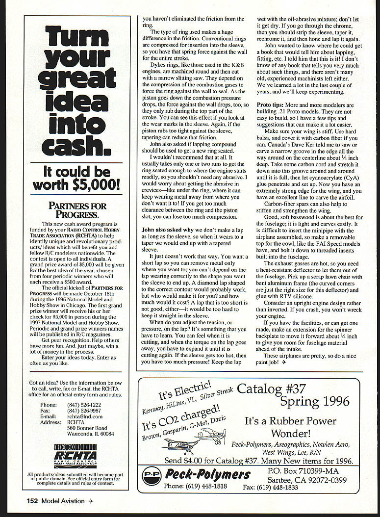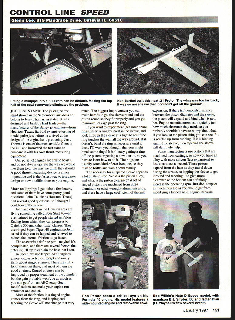 CONTROL LINE SPEED JET TEST STAND jet engine test stand shown September issue does belong Jerry Thomas stated designed built Earl Baileythe manufacturer Bailey jet enginesfrom Houston Texas Earl did extensive testing model pulse jets before arrived design engine producing Jerry Thomas avid Jet fliers US borrowed test stand compare own thrust-measuring equipment pulse jet engines erratic beasts always operate way would like way think should good thrust-measuring device almost imperative fastest way test new design new modifications engine lapping get quite few letters some have some pretty good questions John Callahan Houston Texas several good questions thought could cover John others Houston area flying something called Four Start 40an event aimed get people started Pylon Racing can progress Quickie 500 other faster classes use nnged Super Tiger 40 engines John asked can lapped relieved reduce internal friction go faster answer definite yesmaybe Its complicated several factors enter Ill try explain best can Speed use lapped ABC engines almost exclusively forget rarely think about ringed engines still lot out good engines Ringed engines can improved proper treatment cylinder gain probably wont much can get ABC setup Such modifications can make engine run smoother cooler Most friction ringed engine comes ring lapping tapering sleeve will change very much biggest improvement can make get sleeve round piston round fit properly get minimum leakage past ring want experiment get some spare rings insert ring itself sleeve look through sleeve light see ring touches wall way around doesnt bend ring necessary until does Ill warn though might break some rings isnt easy getting ring off piston getting new have learn rings usually some kind cast iron too may brittle wont bend readily necessity tapered sleeve depends lot piston What piston alloy what piston clearance lot ringed pistons machined 2024 aluminum other wrought-aluminum alloy have large coefficient thermal expansion isnt enough clearance between piston diameter sleeve piston will expand bind gets hot Engine manufacturers learn quickly just much clearance need probably shouldnt have worry about look piston sldrt can see scuffed up rubbing binding against sleeve tapering sleeve will definitely help Some manufacturers use pistons machined castings now have alloy silicon less expansion less clearance needed pistons expand heat travel down during stroke lapping sleeve get round tapering give clearance bottom can definitely increase operating rpm Just dont expect much increase would get modifying lapped ABC engine because January1997 151 Fining minipipe 21 Proto can difficult Making top Ken Barthel built neat 21 Proto wing too far back half cowl removable eliminates problem noseheavy couldnt get off ground Ron Peters casts critical eye Bob Wilkies Nats D Speed model Formula 40 engine model features grandson BJ Snyder BJ father Blair side-mounted engine removable cowl Ft Wayne IN flew several events Turn great idea cash could worth $5000 PARThERS FOR PROGRESS new cash award program funded RADIO CONTROL HOBBY TRADE ASSOCIADON RCHTA help identify unique revolutionary prod ucts ideas will benefit fellow R/C modelers nationwide contest open individuals grand prize award $5000 will given best idea year chosen four periodic winners will receive $500 award official kickoff PARThERS FOR PROGarss will made October 18th during 1996 National Model Hobby Show Chicago first grand prize winner will receive check $5000 person during 1997 National Model Hobby Show Periodic grand prize winners names will published R/C magazines Get peer recognition Help others have fun just maybe win lot money process Enter ideas today Enter often like Got idea Use information below call write fax E-mail RCHTA office official entry form rules Phone Fax E-mail Address 847 526-1222 847 526-9987 rchta@lndcom RCHTA 560 Bonner Road Wauconda IL 60084 EUUEANI mm roducts/ideas submitted will become part o public domain See official entry form complete details rules contest havent eliminated friction ring type ring used makes huge difference friction Conventional rings compressed insertion sleeve have spring force against wall entire stroke Dykes rings like used K&B engines machined round cut narrow slitting saw depend compression combustion gases force ring against wall seal As piston goes down combustion pressure drops force against wall drops too rub during top part stroke can see effect look wear marks sleeve Again piston rubs too tight against sleeve tapering can reduce friction John also asked lapping compound should used get new ring seated wouldnt recommend usually takes two runs get ring seated enough engine starts readily shouldnt need abrasive would worry about getting abrasive creviceslike under ring can keep wearing metal away dont want get too much clearance between ring piston slot can lose too much compression John also asked dont make lap long sleeve wears taper would end up tapered sleeve just doesnt work way want short lap can remove metal want cant depend lap wearing correctly shape want sleeve end up diamond lap shaped correct contour would probably work would make much would cost lap too short good eitherit would too hard keep straight sleeve adjust tension pressure lap Its something have learn can feel cutting torque lap goes away have expand until cutting again sleeve gets too hot have too much pressure Keep lap wet oil-abrasive mixture dont let get dry go through chrome should strip sleeve taper rechrome hone lap again John wanted know could get book would tell him about lapping fitting etc told him thai dont know book tells very much about such things arent old experienced machinists left either Weve learned lot last couple years well keep experimenting Proto tips modelers building 21 Proto models easy build have few tips suggestions can make lot easier Make sure wing stiff Use hard balsa cover carbon fiber can Canadas Dave Ker told saw carve narrow groove edge wa