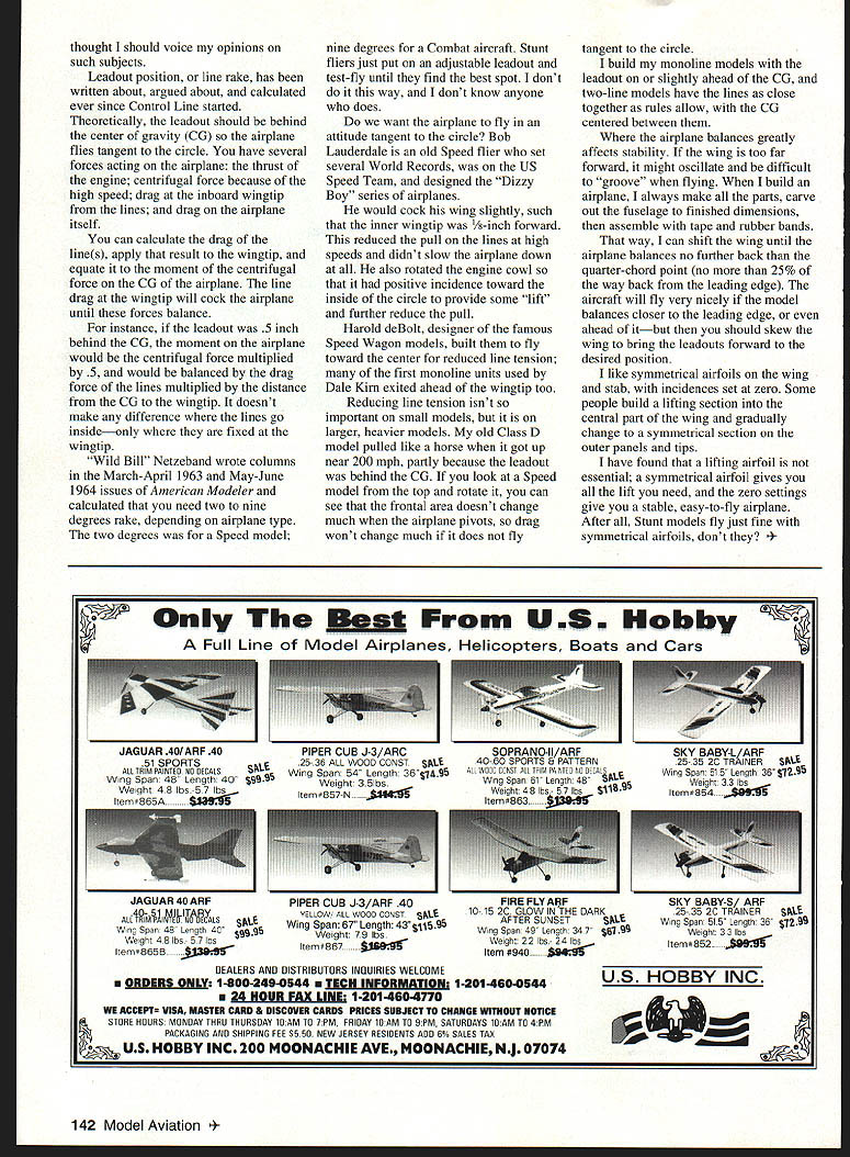 CONTROL LINE SPEED TURBOJETS Most have probably seen write-ups advertisements maybe demonstrations small turbojet engines modelers have trying RC Scale airplanes what have read early engines required rather complicated starting system other problems such fuel fuel tanks safety concerns took crew several persons start just like full-scale jet engines Newer versions have improved simplified until can started operated person saw demonstration flight Nats impressive say least sound just like full-scale jet thrust speed outstanding Some us Speed fliers wondered would fly Control Line realized might little too large too powerful Theres new turbojet engine available 43 inches diameter weighs just 265 ounces puts out 75 lb thrust rotor speed 100000 rpm enough fly Control Line-size models Can fly Turbojet Speed might awhile can seriously think using such engine CL Scale now tiny turbojet built company called Golden West Models based Kurt Schrecklings design model aircraft put production Schneider-Sanchez Austria Recently Engineering News magazine short write-up several engines put out 75 100 lb thrust range 265 oz 16 lb Golden West Models FD 3/67 LS engine small made exotic metals such Inconel titanium stainless steel has punched blades curvature instead machined- welded-turbines patented electronic control regulates fuel flow depending input exhaust gas temperature sensor engine tachometer throttle setting second patent covers fuel vaporization system carries kerosene-Coleman gas through /I6inch-diameter Inconel tubing combustion chamber engine cost reported $2995 can just see future nowJet Carrier Jet Aerobatics Jet Racing Jet Combat Talk about Top Gun Cold Cash Speed Bash Last September competed 50th Anniversary Speed Contest hosted Dayton Buzzin Buzzards Harry Roe avid Speed flier has around forever found flyers very first Dayton contest held 1947 Control Line modeling still new rules still formative stage Speed consisted five classes starting engines 10 maximum displacement progressing 20 30 40 50 60 Soon settled down Class 19s Class B 29s Class C 49s Class D 60s someone found out 60-size engines little over 60 size limit Class D size raised 65 weve stuck ever since Dayton contest always scheduled second weekend September usually blessed excellent weather hurricane came up Florida headed straight Dayton year veered east just enough miss us Heavy rains fell just east north Dayton Cleveland clobbered flew Speed hearts content day Saturday Sunday Some fliers didnt come because thought storm would hit turnout good anyway 32 contestants 74 entries 125 official flights turned attempts averaged out flight attempt five minutes 42 seconds Frank Puleo drove way Denver Colorado figured worth set new 21 Sport Speed Record 15484 mph Class record fell three times Tommy Brown flew sidewinder monoline past old record Billy Hughes flew faster Tommy went up again new mark 18665 mph Billy went through three engines bearings couldnt hold up test flight 196 mph Thats moving 15-size airplane Speed Model Design Bob Whitney Florida flies Racing Speed events suggested some good topics column Design parameters such leadout position airfoil shape balance always apparent beginners March 1997 141 Junior King operates starter brother Ed holds 21 Proto Flies backward clockwise lines kept tight torque Denvers Frank Puleo set 21 Sport Speed Bob Whitney drove Dayton Florida record 15484 mph Dayton fly Speedconverted AMA number Indy 21 Ned Morris Indianapolis letters Prowler 21 Proto thought should voice opinions such subjects Leadout position line rake has written about argued about calculated ever since Control Line started Theoretically leadout should behind center gravity CC airplane flies tangent circle have several forces acting airplane thrust engine centrifugal force because high speed drag inboard wingtip lines drag airplane itself can calculate drag lines apply result wingtip equate moment centrifugal force CC airplane line drag wingtip will cock airplane until forces balance instance leadout 5 inch behind CG moment airplane would centrifugal force multiplied 5 would balanced drag force lines multiplied distance CC wingtip doesnt make difference lines go insideonly fixed wingtip Wild Bill Netzeband wrote columns March-April 1963 May-June 1964 issues American Modeler calculated need two nine degrees rake depending airplane type two degrees Speed model nine degrees Combat aircraft Stunt fliers just put adjustable leadout test-fly until find best spot dont way dont know anyone does want airplane fly attitude tangent circle Bob Lauderdale old Speed flier set several World Records US Speed Team designed Dizzy Boy series airplanes would cock wing slightly such inner wingtip 1/a-inch forward reduced pull lines high speeds didnt slow airplane down also rotated engine cowl positive incidence toward inside circle provide some lift further reduce pull Harold deBolt designer famous Speed Wagon models built fly toward center reduced line tension first monoline units used Dale Kim exited ahead wingtip too Reducing line tension isnt important small models larger heavier models old Class D model pulled like horse got up near 200 mph partly because leadout behind CC look Speed model top rotate can see frontal area doesnt change much airplane pivots drag wont change much does fly tangent circle build monoline models leadout slightly ahead CC two-line models have lines close together rules allow CC centered between airplane balances greatly affects stability wing too far forward might oscillate difficult groove flying build airplane always make parts carve out fuselage finished dimensions assemble tape rubber bands way can shift wing until airplane balances no further back quarter-chord point no 25% way back leading edge aircraft will fly very nicely model balances closer leading edge ahead itbut should skew wing bring leadouts forward desired position like symmetrical airfoils wing stab incidences set zero Some people build lifting s