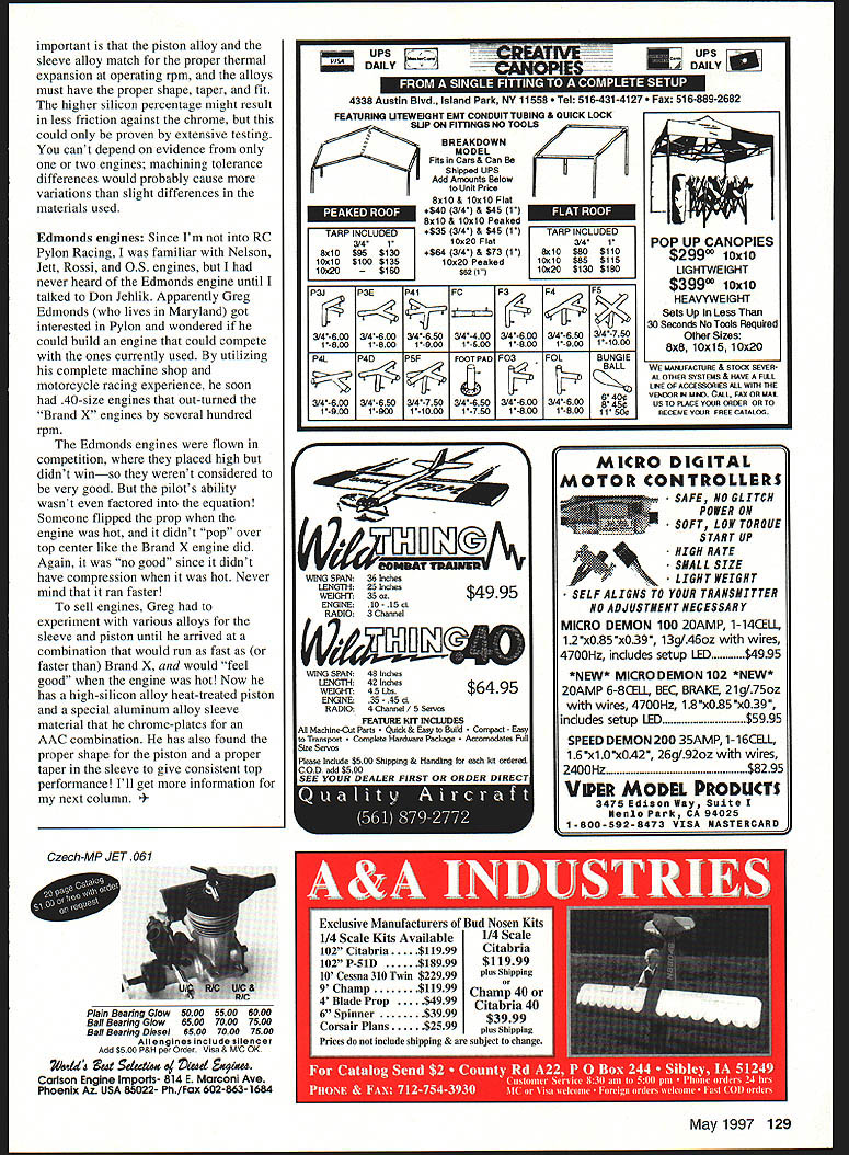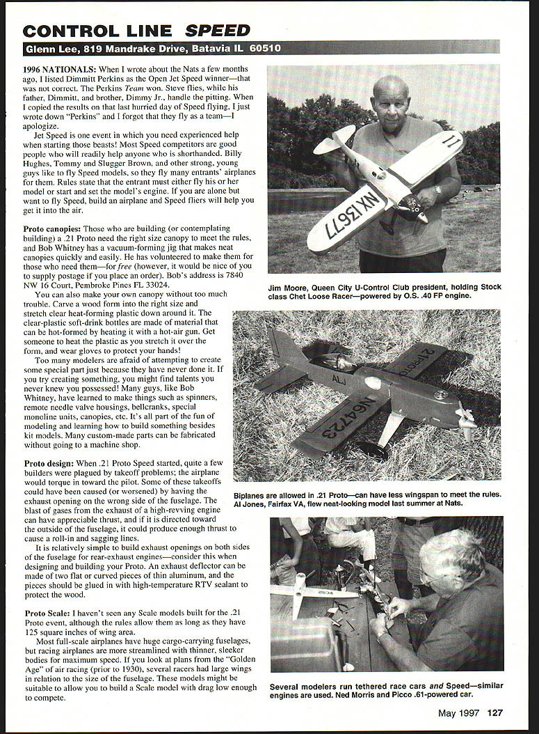 CONTROL LINE SPEED 1996 NATIONALS wrote about Nats few months ago listed Dimmitt Perkins Open Jet Speed winnerthat correct Perkins Team won Steve flies father Dimmitt brother Dimmy Jr handle pitting copied results last hurried day Speed flying just wrote down Perkins forgot fly teamI apologize Jet Speed event need experienced help starting beasts Most Speed competitors good people will readily help anyone shorthanded Billy Hughes Tommy Slugger Brown other strong young guys like fly Speed models fly entrants airplanes Rules state entrant must either fly model start set models engine alone want fly Speed build airplane Speed fliers will help get air Proto canopies building contemplating building 21 Proto need right size canopy meet rules Bob Whitney has vacuum-forming jig makes neat canopies quickly easily has volunteered make need themfor free however would nice supply postage place order Bobs address 7840 NW 16 Court Pembroke Pines FL 33024 can also make own canopy too much trouble Carve wood form right size stretch clear heat-forming plastic down around clear-plastic soft-drink bottles made material can hot-formed heating hot-air gun Get someone heat plastic stretch over form wear gloves protect hands Too modelers afraid attempting create some special part just because have never done try creating something might find talents never knew possessed guys like Bob Whitney have learned make things such spinners remote needle valve housings bellcranks special monoline units canopies etc Its part fun modeling learning build something besides kit models custom-made parts can fabricated going machine shop Proto design 21 Proto Speed started quite few builders plagued takeoff problems airplane would torque toward pilot Some takeoffs could have caused worsened having exhaust opening wrong side fuselage blast gases exhaust high-revving engine can have appreciable thrust directed toward outside fuselage could produce enough thrust cause roll-in sagging lines relatively simple build exhaust openings both sides fuselage rear-exhaust enginesconsider designing building Proto An exhaust deflector can made two flat curved pieces thin aluminum pieces should glued high-temperature RTV sealant protect wood Proto Scale havent seen Scale models built 21 Proto event although rules allow long have 125 square inches wing area Most full-scale airplanes have huge cargo-carrying fuselages racing airplanes streamlined thinner sleeker bodies maximum speed look plans Golden Age air racing prior 1930 several racers large wings relation size fuselage models might suitable allow build Scale model drag low enough compete May1997 127 Jim Moore Queen City U-Control Club president holding Stock class Chet Loose Racerpowered 08 40 Pp engine Biplanes allowed 21 Protocan have less wingspan meet rules Al Jones Fairfax VA flew neat-looking model last summer Nats Several modelers run tethered race cars Speedsimilar engines used Ned Morris Picco 61-powered car Losing control can nightmare wrong response given can take its toll model nerves wallet Radio South know feel about hobby too avid RC enthusiasts nearly half century combined experience modeling radio repair So avoid inflated repair costs undue service time -- call Radio South fast economical in-house radio service can depend Radio SouthFuaba K 3702 N PaceLUrepair information 904-434-0909 Pensacola ey800-962-7802 FL 32505•Toll Free Order Line Orders please Chet Loose Racer built Jim Moore Butler KY intended fly 40-size CL Racing event larger 21 Proto needs model pretty Chet Loose Racer would get near-maximum appearance points Proto event Scale airplane have looking Lockheed Sirius also called Altair airplane Lindbergh used toured world early 1930s also airplane fitted floats Wiley Post Will Rogers crashed Alaska Sirius fixed landing gear wheel pants Altair retractable gear Wouldnt retracts Speed model blow competitors minds have copy Wylam plans ModelAirplane News February 1956 am going enlarge 125 square inches wing area see large fuselage will NovaRossi will fit Proto supposed fun event pretty airplanes flown Sirius would dandy might go fast Nanophase metals Gordon Burford maker Taipan engines Australia sent sample best piston alloy has found ABC engines aluminum 30-31% silicon comes Europe didnt say According Gordon better Mable other high-silicon material has used before alloy looks very much like extruded Russian material have used dont know same could manufactured submicron-sized metal powders wrote about previous column company makes nanophase metal located Chicago area Im going contact see anyone country making similar alloys US companies usually arent interested material unless can produce large quantities probably isnt necessary use 30%-silicon piston alloy highperforming engines What 128 Model Aviation SHIEm BAILS OUT Release scale-like 1/ Parachutist red crowd pleaser lot funl Brilliant colors Fl orange I pink yellow red white blue gold Complete figure & releose system $1895 eo plus $325 S/H Model Aviation peciaI Med White Red & Gold Combol $1895 325 S/Hl SEND ORDER TODAY TO HOBBY HUT MANUFACTURING 2020 W 21st St N Suite #77 Wichita KS 67203-2107 Dept MAV send o SASE brochure IiebcIIl Glow Plugs Introduces NEW SUPER COOL Plug Hi Temp Insulator $209 addition FIREBALL R/C IDLE BAR plug $209 Hot & Standard Non-Idle Bar plugs still $169 Swanson Associates PO Box 151 Wayne NJSiiii~ 1948 07470 Top Fueler MKII 12V Electric Fuel Pump Fill drain 10-ounce tank minute flat Still Selling Best Product Market CALL FOR PRICES ON OUR QUALITY BALSA NATIONAL BALSA 97 Cherokee Dr Springfield MA 01109 413-796-1925 cL3ro dakjs CATALOG#7 now available catalog 64 pages long filled infor mation new releases com plete line supplies new products features advancedbuilding tips much catalog $300 Call write yours today 412-966-2726 Brodaks Park Avenue Carmichnels PA 15320 important piston alloy sleeve alloy match proper thermal expansion operating rpm alloys must have proper shape taper fit 