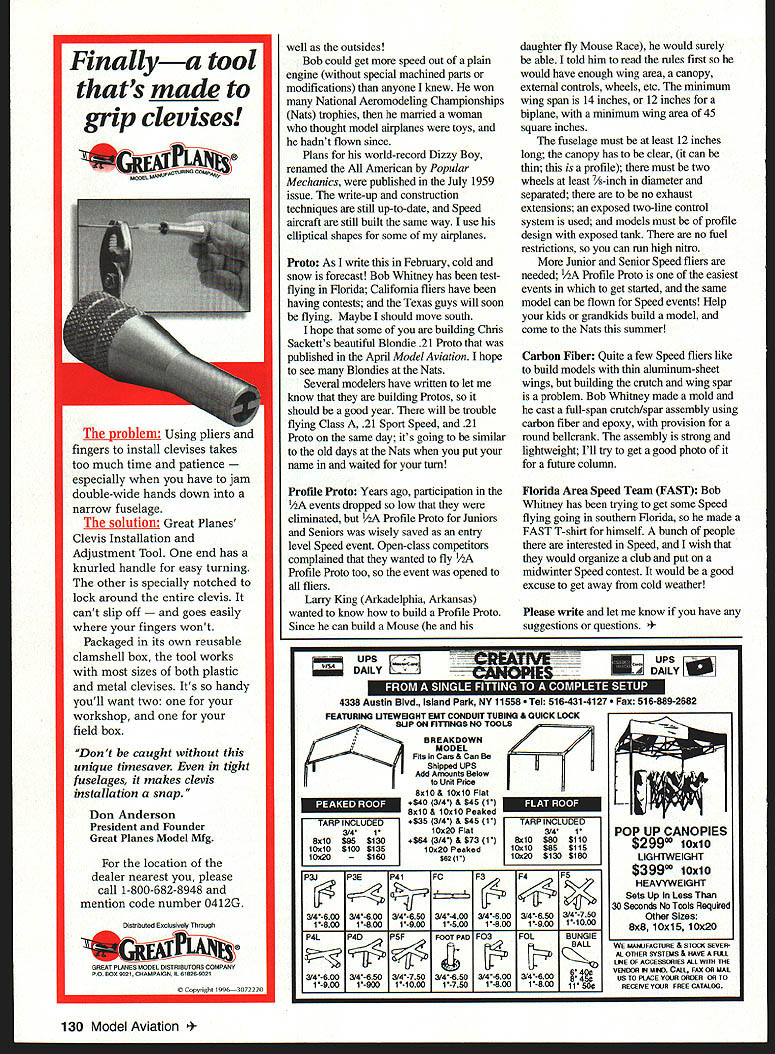 CONTROL LINE SPEED JETS Very little information published about model jet engines full-scale versions Modeler Donald Lalrd trying collect data make engineering drawings model pulse jets manufactured US currently working Sona-Jet built years ago Latrobe Pennsylvania Donald needs copy complete operating instructions included engine looking historical data concerning MEW Minijet Motor companies Please contact Don 4706 Diane Dr Ashtabula OH 44004 call him 216 998-1371 have information will greatly appreciated New developments read engineering scientific magazines can find look things can applied model engines better idea sources Design News An article published June 1996 issue about coatings tungsten carbide-carbon Developed Balzers Tool Coating North Tonawanda New York process improves frictional wear behavior variable lubrication conditions including dry running coating applied sputtering tungsten carbide targets carbon plasma vacuum chamber clean high vacuum results excellent metallurgical bond parts high adhesive strength coating laid alternating carbide-rich carbon-rich layers give good sliding behavior under high frictional stress process used treat piston wrist pins racing motorcycle Germany pins survived entire racing season approximately 3500 km speeds up 280 km/hr soft bronze bushing normally used piston usually wears out eliminated ended up less weight stiffer connecting rod smaller end process also tested successful results tappets injection pumps Possible applications model engines would coat wrist pins crankpins crankshafts run non-ballbearing housings Since coatings self-lubricating oil content fuel could reduced four-stroke engines would probably benefit two-stroke engines process easily basement engine manufacturers might give try Air-cooled engines run pretty hot treatment coatings might help should investigated Lewis Research Center Cleveland Ohio has developed thermal-barrier wear-resistant self-lubricating layer sleeves advanced high-temperature engines thermal barrier allows engine run higher temperature high efficiency oil-based lubricants cant survive coating layer zirconia thermal barrier coated silicon carbide silver calcium fluoride/barium fluoride eutectic silicon carbide hard wearresistant matrix silver provides low friction fluorides provide lubricity air-quality laws become restrictive oily exhausts have eliminated such designs may acceptable Loss Don Jehlik called other day tell Speed flier Bob Lauderdale passed away fall 1996 Don flew Bob years memorable flights met Bob 1950s Glenview Naval Station 1958 set world-record 172 mph 10cc displacement class think cranked starter Don set needle Bob US Speed Team several times competed such places Kiev Russia Budapest Hungary set several world records guys flew him Huntsville Alabama 1960s Bobs airplanes featured elliptical-shaped wings stabilizers dihedral stabilizer painted bright yellow Different classes Dizzy Boy Dizzy Bee Dizzy Bug some kitted dont remember did airplanes beautiful insides finished July1997 129 Authors winter project Make vintage 10cc engine parts L-R Wisniewski TWA Dooling Yellow Jacket Australian copy Carl Dodge design early Kraft Borden Streamliner tether cars Dooling 61s modified flattop pistons Dykes rings squish-band heads Early tether cars used same engines model airplanes Front-drive Morrison Silver Rocket has ignition Super Cyclone narrow fuselage solution Great Planes Clevis Installation Adjustment Tool end has knurled handle easy turning other specially notched lock around entire clevis cant slip off easily fingers wont Packaged its own reusable clamshell box tool works sizes both plastic metal devises Its handy youll want two workshop field box location dealer nearest please call 1-800-682-8948 mention code number 0412G Distributed Exclusively Through GREA PLANES MODE D S e BU ORS COMPAN P0 BOX 902 CI-IAMPA GN 6 828-902 p gh 996S0 well outsides Bob could get speed out plain engine special machined parts modifications anyone knew won National Aeromodeling Championships Nats trophies married woman thought model airplanes toys hadnt flown since Plans world-record Dizzy Boy renamed American Popular Mechanics published July 1959 issue write-up construction techniques still up-to-date Speed aircraft still built same way use elliptical shapes some airplanes Proto As write February cold snow forecast Bob Whitney has testflying Florida California fliers have having contests Texas guys will soon flying Maybe should move south hope some building Chris Sacketts beautiful Blondie 21 Proto published April Model Aviation hope see Blondies Nats Several modelers have written let know building Protos should good year will trouble flying Class 21 Sport Speed 21 Proto same day its going similar old days Nats put name waited turn Profile Proto Years ago participation events dropped low eliminated Profile Proto Juniors Seniors wisely saved entry level Speed event Open-class competitors complained wanted fly /2A Profile Proto too event opened fliers Larry King Arkadelphia Arkansas wanted know build Profile Proto Since can build Mouse FEATURING UTEWEIGHT EUT CONDUIT TUBING & QUICK LOCK SUP ON FITTINGS NO TOOLS -e r1NCLEI51 I3/4II 8x10$86S130I tOxIC$100$135I BREAKDOWN MODEL Fits in Cars & Can Shipped UPS Add Amounts Below Unit Price BxIO& lOxlO Flat S40 3/4 & $46 P SxlO& lOslO Peaked 535 3/4 & $45 1 tOx2O Flat 564 3/4 & $73 1 10x20 Peaked $62 1 FINCLUDE1 I3141I BxlO$80$110I lOslO$85$116I 3/4-6003/4-&0034 6 50 3/4-4 00 3/4 600 314-6 50 314-7S0 1-800 I-800 1 900 1 600 1 600 l900 1-10O0 P4LP4DPSFFOOT PAD F03FOLBUNGlE 600314-6503/4 750314860 314400 314-600 640$ 1-900l-9001 1000 1 760 500 1-800 daughter fly Mouse Race would surely able told him read rules first would have enough wing area canopy external controls wheels etc minimum wing span 14 inches 12 inches biplane minimum wing area 45 square inches fuselage must least 12 inches long canopy has clear can thin profile must two wheels least 71-inch diameter sepa