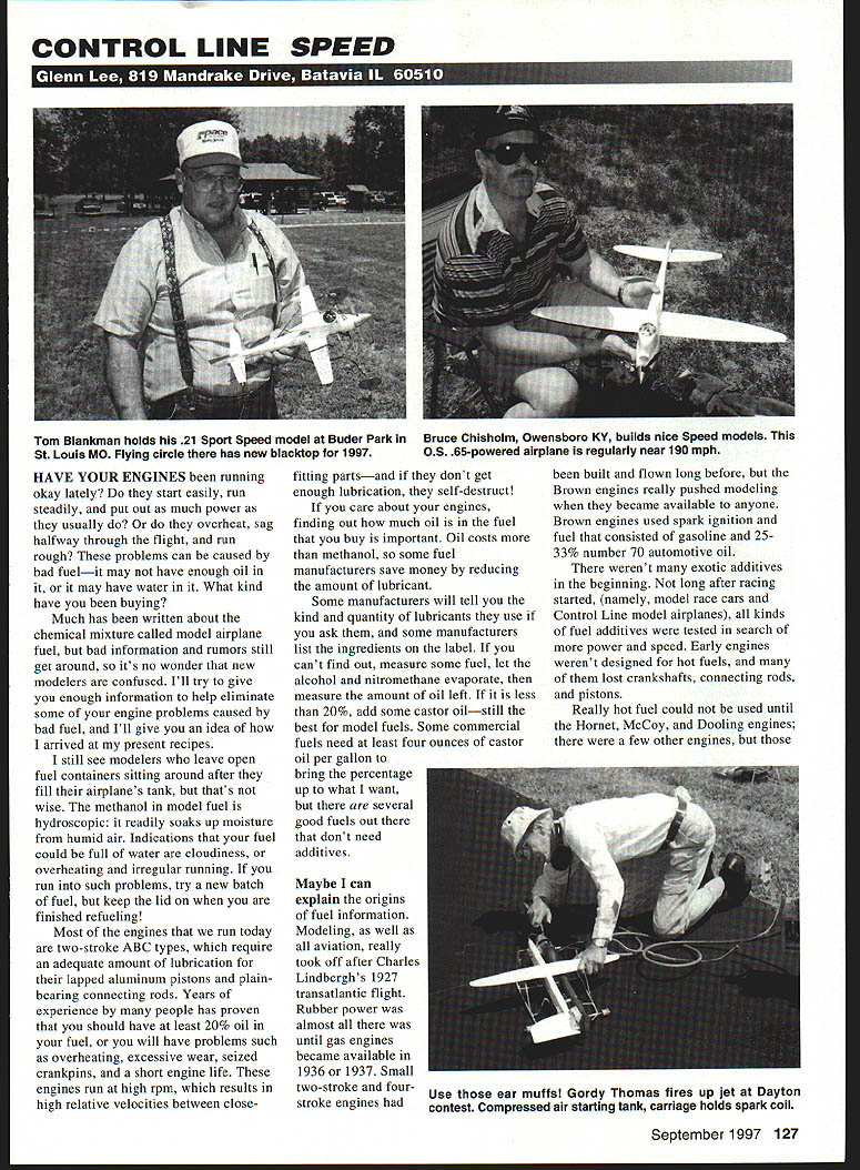 CONTROL LINE SPEED HAVE YOUR ENGINES running okay lately start easily run steadily put out much power usually overheat sag halfway through flight run rough problems can caused bad fuelit may have enough oil may have water What kind have buying Much has written about chemical mixture called model airplane fuel bad information rumors still get around its no wonder new modelers confused Ill try give enough information help eliminate some engine problems caused bad fuel Ill give idea arrived present recipes still see modelers leave open fuel containers sitting around after fill airplanes tank thats wise methanol model fuel hydroscopic readily soaks up moisture humid air Indications fuel could full water cloudiness overheating irregular running run such problems try new batch fuel keep lid finished refueling Most engines run today two-stroke ABC types require adequate amount lubrication lapped aluminum pistons plainbearing connecting rods Years experience people has proven should have least 20% oil fuel will have problems such overheating excessive wear seized crankpins short engine life engines run high rpm results high relative velocities between closefitting partsand dont get enough lubrication self-destruct care about engines finding out much oil fuel buy important Oil costs methanol some fuel manufacturers save money reducing amount lubricant Some manufacturers will tell kind quantity lubricants use ask some manufacturers list ingredients label cant find out measure some fuel let alcohol nitromethane evaporate measure amount oil left less 20% add some castor oilstill best model fuels Some commercial fuels need least four ounces castor oil per gallon bring percentage up what want several good fuels out dont need additives built flown long before Brown engines really pushed modeling became available anyone Brown engines used spark ignition fuel consisted gasoline 2533% number 70 automotive oil werent exotic additives beginning long after racing started namely model race cars Control Line model airplanes kinds fuel additives tested search power speed Early engines werent designed hot fuels lost crankshafts connecting rods pistons Really hot fuel could used until Hornet McCoy Dooling engines few other engines Maybe can explain origins fuel information Modeling well aviation really took off after Charles Lindberghs 1927 transatlantic flight Rubber power almost until gas engines became available 1936 1937 Small two-stroke four- Use ear muffs Gordy Thomas fires up jet Dayton stroke engines contest Compressed air starting tank carriage holds spark coil September1997 127 Tom Blankman holds 21 Sport Speed model Buder Park inBruce Chishoim Owensboro KY builds nice Speed models St Louis MO Flying circle has new blacktop 19970S 65-powered airplane regularly near 190 mph powerhouses Castor oil proved superior lubricant since maintained good oil film high operating temperatures Testers might have remembered use castor oil WW fighter aircraft powered two-stroke engines WW II slowed things down racing took off again 1946approximately time Arden glow plug became available Gasoline-based fuel didnt run very well glow because hard start set Methyl alcohol methanol worked much better became basic ingredient model fuel again 25-30% castor oil lubricant Speed fliers race car guys tried almost kind flammable fluid IIUkI LU] L L PCIALISTS IN COX AND AME ENGINES & CUSTOM PARTS COMPETITION ACCCESSORIES RACING WHEELS SOLID LINES CUSTOM NEEDLE VALVES OLD TIMER KITS & SUPPLIES COILS CONDENSERS PLUGS SILK QUALITY DOPE BRUSHES TRANSISTOR IGNITION SYSTEMS 112A TEXACO PLAYBOY SR KIT PH 619 761-0511 FAX 761-0937 VISA IMC WELCOME NO COD MINIMUM ORDER $1000 PLUS $300 SHIPPING INSURANCE $200 wasnt long before nitromethane recognized secret ingredient produced much power remember first can Ohlsson Rice 30 Plus fuel boughtwe afraid use straight used hop up regular fuels such Francisco Blue Blazer Car racer Glen Fairabend came out This-Is excellent Speed fuel used years Castor oil wont mix nitromethane limited maximum approximately 45% nitro remaining methanol would dissolve castor oil Fairabend fuel used considerable nitrobenzene helped dissolve nitromethane think Glen got up around 55% Its now CUSTOM LETTER TODAY THE VINYLWRITE WAY AMA 0 Since 1987 mail order company providing modeler EZ apply custom lettering logos stars etc choices type styles & colors decal custom cut pre-aligned & pre-spaced premium vinyl planes b oats trains toys etc Heights 1/4 12s Priced right eg AMA er 1 high $250. color style Find out what can Sample infopack tree Please include #10 SASE inquiries YJ 1N IA1 4 hi — 16043 TULSA STREET GRANADA HILLS CA 91344 818-363-7131 - Mon Thur 10-4pm PST EMAIL vinyirt@datadepotcom Plus $2 P/H Ca res add tax known nitrobenzene also called oil mirbane worst cancercausing agents People tried other oils find would get away 45% nitro limit Germans developed synthetic oil during WW II US companies started producing long after war smart modeler tried synthetic oil model fuel found workedsome types would mix nitro first kind able buy Steen C dont remember got it worked well Speed racing fuels spilled Steen C airplane would dissolve epoxy paint Other suitable lubricants discovered Someone working plastics industry found oxygenated soybean oil form white powder would mix alcohol nitro Using compound lubricant K&B sold Supersonic Speed Fuel worked great gave excellent speeds until temperature dropped As fuel cooled bean oil also called greasy kid stuff would separate settle bottom can warm up fuel shake dissolve bean oil again Speed fliers still trying everything could find order go faster including rocket fuels Hydrazine hydrogen peroxide tetranitromethane wild nasty -I Join Giants Help PromoteI Non-Competitive Ingpagoag Flying Large RIC Air Craft AA membership includes quarterly magazine High Flight I MEMBERSHIP APPUCAllON l NEW RENEWAL Date19I Yearly DUes$1500 USA $2000 US Canada & Mexico $3000 US ElsewhereI Make CHECK M