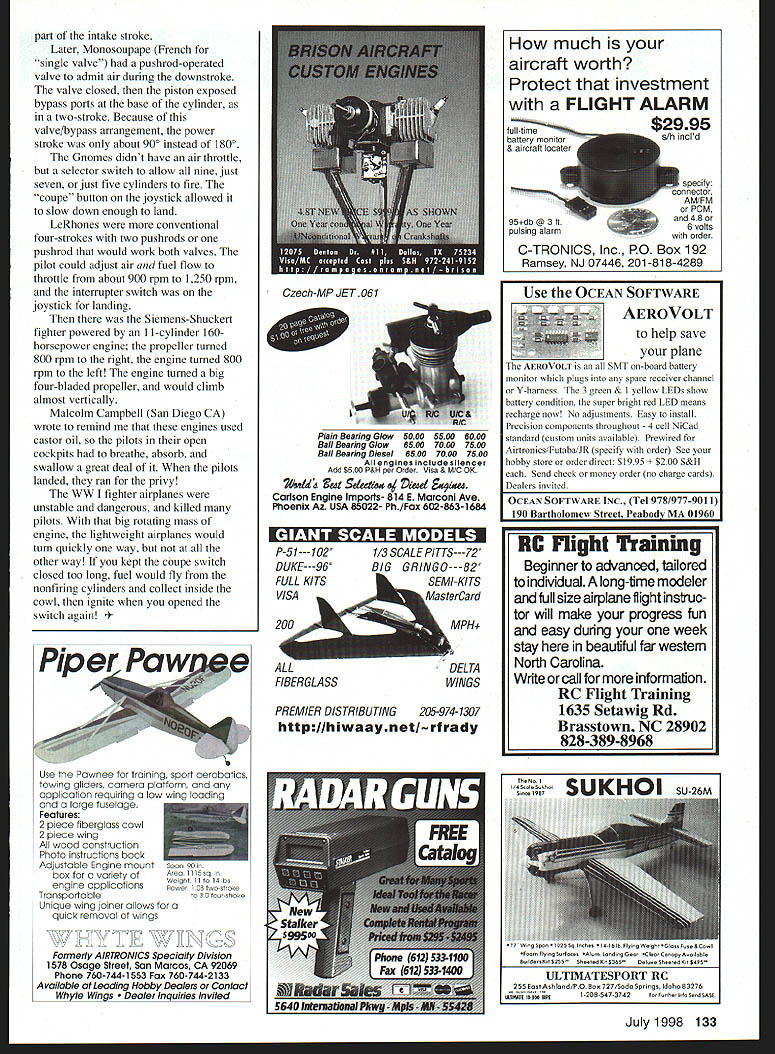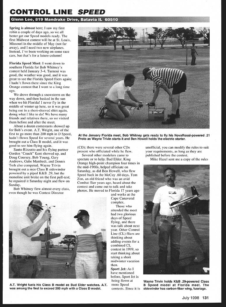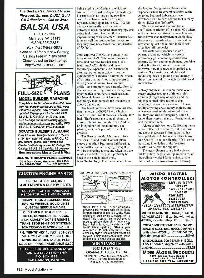 CONTROL LINE SPEED Spring almost saw first robin couple days ago better get Speed models ready first Midwest contest will St Louis Missouri middle May far away need two new airplanes Instead Ive working some race cars thats future column Florida Speed Meet went down southern Florida Bob Whitneys contest held January 3-4 Turnout good weather good great see Florida Speed fliers again hadnt flown since King Orange contest went long time ago drove through snowstorm way down basked sun hit Florida never fly middle winter up great being out short-sleeved shirt again doing what like have friends relatives visited before after meet About dozen contestants showed up Bobs event AT Wright first go 200 mph D Speed hadnt flown Speed several years brought out Class B model good see him flying again Santo Rizzotto flying partner Gordon Coach Kent showed up Doug Coursey Bob Young Gary Andrews Gabe Manfredi Dennis Toth also competed Wayne Trivin brought out nice Class B sidewinder powered piped K&B 29 monoline unit broke first pull-test repaired Saturday night flew Sunday Bob Whitney flew almost class though Contest Director CD several other CDs present officiated flew Several other modelers came spectate help Bud Elder King Orange high-point champion four times mid-1960s helped officiate Saturday did Ben Howell flew Speed back McCoy 60 days Tom Zon old friend avid Combat flier years ago heard about contest came out talk take photos moved Florida 17 years ago works Cape Canaveral complex attended meet two glorious days Speed flying talk about next year Other Control Line CL fliers thinking about adding events combined CL contest 1999 50 start thinking about taking short midwinter vacation Sport Jet As have mentioned before Sport Jet being flown Speed contests Since unofficial can modify rules suit requirements long published before contest Mike Hazel sent copy rules July 1998 131 January Florida meet Bob Whitney gets ready fly NovaRossi-powered 21 Proto Wayne Trivin starts Ben Howell holds electric starter AT Wright fuels Class B model Bud Elder watches AT among first exceed 200 mph Class D model Wayne Trivin holds K&B 29-powered Class B Speed model Florida meet sidewinder has carbon-fiber wing fuselage NS FULL-SI MODEL BUILDER MAGAZINE Complete collection 800 plans first through /iLLssues MB atticle reprints now available Order ux1ated 20-page prioe list booklet PPD $2 US. $3 CanMex $5 overseas Also 50-page Illustrated Catalog orices orderrnnu instructions valid PPD $5 US $7 Cari/Mex $9 overseas SCRATCH BUILDERS ALMANAC Over 75 scale plans six boats 1/2-inch 1/24 4-inch 113 scale FF CL RC gas rubber gliders Bill Northrop Charlie Smith designs over 60 Vintage RC Catalog $2 US $3 Can/Mex $5 overseas Now accepting MasterCard & VIsa BILL NORTHROPS PLANS SERVICE 2019 Doral Court Henderson NV 89014 Ph 702-896-2162Fax 7028977775 being used Northwest similar Texas rules Any airplane design permissible long two-line control mechanism fully exposed Dynajet Bailey sport jet 05 II-G jets stock internally suction fuel delivery used Standard alcohol/propylene oxide fuel used pilots experimenting ColemanTM lantern fuel burns well produces less power may drop back 60-foot lines instead 70 feet New engines Norvel company has selling AME engines some time has new Russian-made 15s featuring AAO cylinder piston technology Apparently AAO stands aluminum-aluminum oxide since cylinder bore anodized aluminum instead chrome plating Anodizing converts thin layer aluminum aluminum oxidean extremely hard ceramic Normal decorative anodizing results very thin layer very scratch-resistant Norvel claims has new technology increases thickness about 50 microns latest numbers have seen indicate micron 00003 9 inch about 001 mm 50 microns nearly 002 inch Thats about same thickness chrome plating might work AAO integral part aluminum plating cant peel off like nickel chrome Russian-made 15s come four versions CL Radio Control plain sleeve crankshaft bearing ball bearing muffler very lightweight will interesting test readily available will probably seen Toledo trade show New Technology article January Design News about new slippery surface treatment scientists Argonne National Laboratory have developed ultrahard coating times slicker TeflonTM carbon-based material has coefficient friction less 001 measured dry nitrogen atmosphere20 times lower molybdenum disulphide previous record-holder test new coating lost micron thickness after five million cycles material produced RF plasma chamber converts proprietary gas containing carbon plasma Carbon other elements combine drift onto substrate Its said however powder applied surface Such material could used model engines plating alloy piston material Ill watch additional information Rotary engines have mentioned WW rotary engines couple times column forget topic generated response anything Ive ever written about know hardly anything about rotary engines never particularly interested kind intriguing didnt know different versions manufacturers Albert Ward Fremont California wrote nice letter criticize inform about inaccurate information has published Al has restored two Jennys Spad VII Hanriot HD- has some knowledge rotating beasts calls engines early Gnome rotary piston intake valve pushrod-operated valve cylinder worked exhaust valve hut would also allow intake air during SPCIALISTS IN COX AND AME ENGINES & CUSTOM PARTS COMPETITION ACCCESSORIES RACING WHEELS SOLID LINES CUSTOM NEEDLE VALVES OLD TIMER KITS & SUPPLIES COILS CONDENSERS PLUGS SILK QUALITY DOPE BRUSHES TRANSISTOR IGNITION SYSTEMS 112A TEXACO PLAYBOY SR KIT CUSTOM LETTER TODAY THE VNYLWR TE WAY iiE~ lKAMAgIflI AME PU Since 1987 mail order company providing modeler EZ apply custom lettering logos stars etc choices type styles & colors decal custom cut pre-aligned & pre-spaced premium vinyl planes boats trains toys etc Heights 1/4 12s Priced right eg AMA er 1 high $250. color style Find out what can foryou S ample infopack tree Please incl