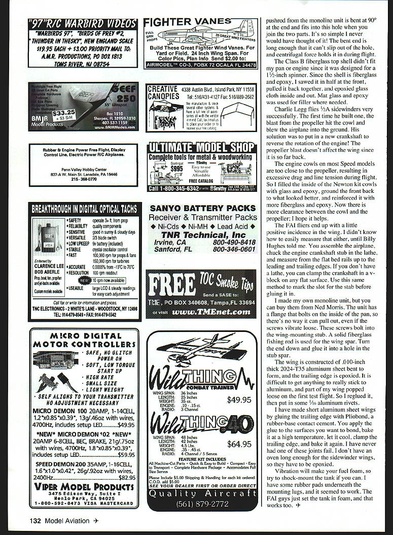 CONTROL LINE SPEED c-i ri i U Contests As write end June its flying season some kind CL Control Line contest weekend several have Control Line Speed events Last week went Cincinnati OH two-day meet hosted Queen City U-Control Club Turnout excellent contestants several states flights completed Saturday However rain forecast Sunday sure enough wiped out flying high point contest Ned Morriss Class D flight 19621 mpha speed just shy Open record exceptional performance considering hot humid weather low barometric pressure engines run much better much faster conditions cool dry Neds airplane conventional upright-engine version powered OS 65 cranks 8 x 11 Kelly fiberglass propeller has another engine regularly does 190 mph testing spare think will promoted #1 Tommy Brown pilot memorable flight wont surprised someone reaches magical 200 mph soon Weather stations Years ago auto drag racers used air density meter helped set engine parameters maximum performance meter works model Speed engines indicates much horsepower expect can select proper diameter pitch propeller correct head clearance Warren Kurth has air density meter usually reads number 90 100 dont know what units isnt really percent combination temperature humidity barometric pressure meter reads near exceeds 100 go fast As usual modern electronics have improved things point now can buy computerized version meter has program can tell drag racer fast car will go instance Ned has electronic weather stations give temperature barometric pressure humidity dew point number indicates air density Ned flew airplane number around 90 fast will go gets up near 100 Such devices necessary interesting try relate numbers performance much effective help set head clearance tuned-pipe tether-car engines Sidewinders No snake kindthe one-sided Speed model kind dont know name came first modeler built although may have Chuck Schuette Bob Spahr FAI Federation Aeronautique Internationale models Sidewinder name given asymmetrical Speed models long inner wing laid-flat engine long wing streamlined supposedly has less drag round flying wire covers also less internal friction engine laying flat since centrifugal force isnt pushing piston against cylinder wall dont know sure much really effective airplanes go fast Ive frantically building two sidewinders fly Nationals Nats Class D Class B Nats almost write Im almost finished construction paint B might little wet Muncie Sidewinders easy build easy conventional upright versions anyway maybe its because Ive built old ones instance didnt know easy way connect elevator pushrod engine mounted halfpan wing internal monoline unit comes off engine disassemble airplane leaving part pushrod stabilizer shell However good old Ned Morris told Build tubular bearing rear pushrod bulkhead halfpan joins body solder lug hole front November1998 131 Ned Morris smiles after Class D airplane turned speed 19621 mph Hes shown pilot Tommy Brown authors new Class 0 sidewinder powered OS 65 engine built kit supplied John Newton Homemade monoline unit wing stub spar sheet aluminum wing stabilizer assembled onto fiberglass upper body shell Entkenedby CLARENCE LEE BOB ABERLE eSAFETY REUABLITY SENSITIYE YERSATLE LOW UPKEEP STABLE FAST operate 3 ft tram prop quality components good sunny & cloudy days 2/3 blade switch lv battery included crysba oscillator corif rot 100000 rpm props & taos 150000 rpm turbines 00005% -10C 70C 100rpm readout ACCURATE S RESOLUTION m now avalable USEABLElsge LCD & steady readings easy carb adluotmeol Call fax wnte Informabon pores TNC ELECTRONES -2 WHITES LANE- WOODSTOCK NY 12496 TEL 9144794549 FAX 914479-554 MICRO DIGITAL MOTOR CONTROLLERS - SAFE 140 GLITCH POWER ON SOFT LOW TORQUE START UP HIGH RATE SEAL L SIZE -LIGHT WEIGHT - SELF ALIGNS TO YOUR TRANSMITTER NO ADJUSTMENT NECESSARY MICRO DEMON 100 2OAMP 1-14CELL 12 xO85 x039 13g146oz wires 4700Hz includes setup LED 995 *N* MICRO DEMON 02 *NtJIJ* 20AMP 6-8CELL BEC BRAKE 21g175oz wires 4700Hz 18xO855x039 includes setup LED$5995 SPEED DEMON 200 35AMP 1-1 6CELL 16 xl0 x042 26g192oz wires 2400Hz$8295 VIPER MODEL PRODUCTS 3475 Edison Way Suite Menlo Park CA 94025 1-800-592-8473 VISA MASTERCARD VANES FULLS GREaT TFRS Yard Field 24 Inch Wing Span PROPS Build Great Fighter Wind Vanes - Color Pics Plan Info Send $200 emeea SANYO BATTERY PACKS Receiver & Transmitter Packs Ni-Cds Ni-MH Acid TNR Technical Inc Irvine CA800-490-8418 Sanford FL800-346-0601 AZUEiThA VV-#IONAT WING SPAN36 Inches LENGTH25 Inches WEIGHT35 oz$4995 NGINE10 15 ci ADIO3 Channel WING SPAN48 Inches LENGTH 42 Inches $6495 WEIGHT 45 Lbs ENGINE 35 45 RAnIO 4 Channel /5 Servos FEATURE KIT INCLUDES Machine-Cul Parts Quick & Easy Build acl Easi 10 Transporl lete Hardware Package Accomodales Full Size Servos pushrod monoline unit bent 900 end fits hole join two parts Its simple never would have thought bent end long enough cant slip out hole centrifugal force holds during flight Class B fiberglass top shell didnt fit pan engine since designed 1 1/2-inch spinner Since shell fiberglass epoxy sawed half front pulled back together epoxied glass cloth inside out Mat glass epoxy used filler needed Charlie Legg flies 1/2A sidewinders very successfully first time built blast propeller hit cowl blew airplane ground solution put new crankshaft reverse rotation engine propeller blast doesnt affect wing since far back engine cowls Speed models too close propeller resulting excessive drag line tension during flight So filled inside Newton kit cowls glass epoxy ground front back what looked better reinforced fiberglass epoxy Now clearance between cowl propeller hope helps FAI fliers end up little positive incidence wing didnt know easily measure either until Billy Hughes told assemble airplane chuck engine crankshaft stub lathe measure flat bed rails up leading trailing edges dont have lathe can clamp crankshaft v block flat surface Use same method mark slot stab before gluing made own monoline unit can buy Ned Morris unit has flang