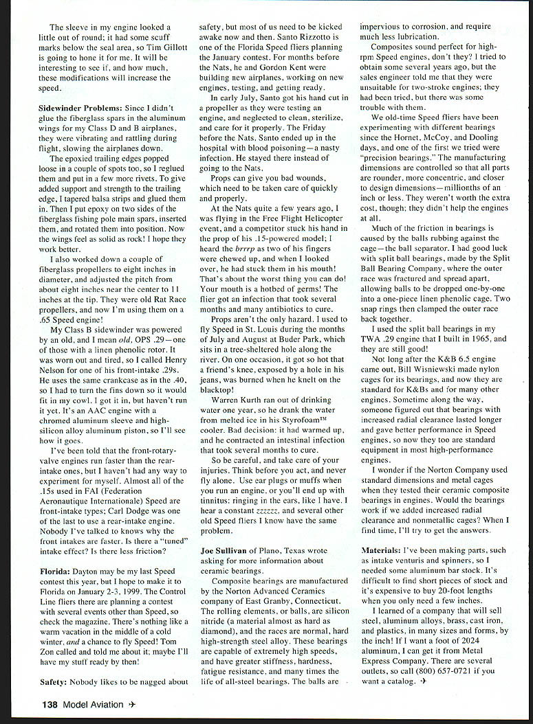 CONTROL LINE SPEED ir Dayton The last Speed contest year Dayton Cold Cash Speed Bash Dayton OH week away write Im frantically building new F-40 airplane reworking some old ones putting new piston NovaRossi 21 reworking fiberglass propellers never enough time have equipment finished ready contest date arrives its way long can remember might easier reduced number events fly wouldnt much fun first competition ever flew still painting Speed model contest won second place though guess Ill never learn Engine Modifications new OS 65-powered sidewinder flew pretty well Nationals 187 mph need another 10 mph Maybe few minor modifications will give boost performance engine stock head Im changing will take insert-type glow plug theyre supposed good several hundred rpm ball bearings also stock riveted steel ball separator will replaced kind plastic cage increased radial clearance Henry Nelson uses bearings high-performance engines hopefully will have less friction boost speed January1999 137 Authors Class D sidewinder OS 65 Fourth Nats187 mph Changes engine might get closer 200-mph goal Sidewinder engine fuel tank pan assembly Note wire skid attach elevator pushrod control mechanism bend wire fuel filler tubes crankcase pressure fitting monoline unit 90 fit brass lug elevator pushrod sleeve engine looked little out round some scuff marks below seal area Tim Gillott going hone will interesting see much modifications will increase speed Sidewinder Problems Since didnt glue fiberglass spars aluminum wings Class D B airplanes vibrating rattling during flight slowing airplanes down epoxied trailing edges popped loose couple spots too reglued put few rivets give added support strength trailing edge tapered balsa strips glued put epoxy two sides fiberglass fishing pole main spars inserted rotated position Now wings feel solid rock hope work better also worked down couple fiberglass propellers eight inches diameter adjusted pitch about eight inches near center 11 inches tip old Rat Race propellers now Im using 65 Speed engine Class B sidewinder powered old mean old OPS 29one linen phenolic rotor worn out tired called Henry Nelson front-intake 29s uses same crankcase 40 turn fins down would fit cowl got havent run yet Its AAC engine chromed aluminum sleeve highsilicon alloy aluminum piston Ill see goes Ive told front-rotaryvalve engines run faster rearintake ones havent way experiment myself Almost 15s used FAI Federation Aeronautique Internationale Speed front-intake types Carl Dodge last use rear-intake engine Nobody Ive talked knows front intakes faster tuned intake effect less friction Florida Dayton may last Speed contest year hope make Florida January 2-3 1999 Control Line fliers planning contest several events other Speed check magazine Theres nothing like warm vacation middle cold winter chance fly Speed Tom Zon called told about maybe Ill have stuff ready Safety Nobody likes nagged about safety us need kicked awake now Santo Rizzotto Florida Speed fliers planning January contest months before Nats Gordon Kent building new airplanes working new engines testing getting ready early July Santo got hand cut propeller testing engine neglected clean sterilize care properly Friday before Nats Santo ended up hospital blood poisoninga nasty infection stayed instead going Nats Props can give bad wounds need taken care quickly properly Nats quite few years ago flying Free Flight Helicopter event competitor stuck hand prop 15-powered model heard brrrp two fingers chewed up looked over stuck mouth Thats about worst thing can mouth hotbed germs flier got infection took several months antibiotics cure Props arent hazard used fly Speed St Louis during months July August Buder Park sits tree-sheltered hole along river occasion got hot friends knee exposed hole jeans burned knelt blacktop Warren Kurth ran out drinking water year drank water melted ice StyrofoamTM cooler Bad decision warmed up contracted intestinal infection took several months cure So careful take care injuries Think before act never fly alone Use ear plugs muffs run engine youll end up tinnitus ringing ears like have hear constant cccccc several other old Speed fliers know have same problem Joe Sullivan PIano Texas wrote asking information about ceramic bearings Composite bearings manufactured Norton Advanced Ceramics company East Granby Connecticut rolling elements balls silicon nitride material almost hard diamond races normal hard high-strength steel alloy bearings capable extremely high speeds have greater stiffness hardness fatigue resistance times life all-steel bearings balls impervious corrosion require much less lubrication Composites sound perfect highrpm Speed engines dont tried obtain some several years ago sales engineer told unsuitable two-stroke engines tried some trouble old-time Speed fliers have experimenting different bearings since Hornet McCoy Dooling days first tried precision bearings manufacturing dimensions controlled parts rounder concentric closer design dimensionsmillionths inch less werent worth extra cost though didnt help engines Much friction bearings caused balls rubbing against cagethe ball separator good luck split ball bearings made Split Ball Bearing Company outer race fractured spread apart allowing balls dropped one-by-one one-piece linen phenolic cage Two snap rings clamped outer race back together used split ball bearings TWA 29 engine built 1965 still good long after K&B 65 engine came out Bill Wisniewski made nylon cages its bearings now standard K&Bs other engines Sometime along way someone figured out bearings increased radial clearance lasted longer gave better performance Speed engines now too standard equipment high-performance engines wonder Norton Company used standard dimensions metal cages tested ceramic composite bearings engines Would bearings work added increased radial clearance nonmetallic cages find time Ill try get answers Materials Ive making parts such intake venturis spinners needed some al