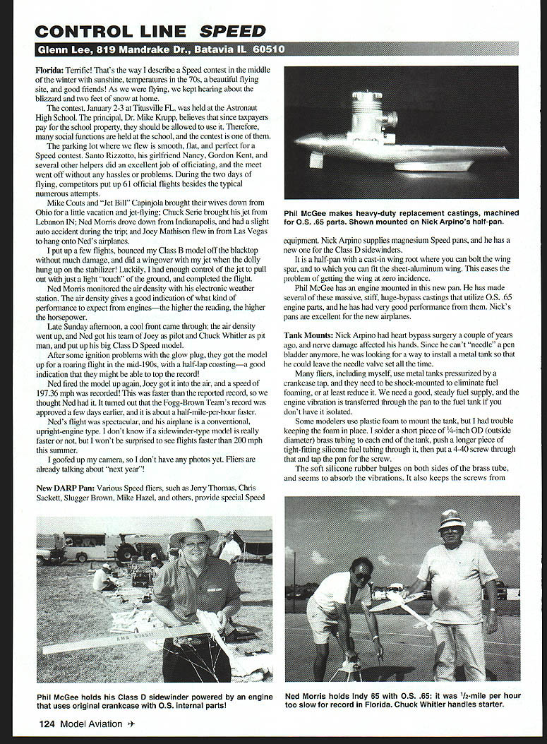 CONTROL LINE SPEED c-i r1uU I4 U Ii Florida Terrific Thats way describe Speed contest middle winter sunshine temperatures 70s beautiful flying site good friends As flying kept hearing about blizzard two feet snow home contest January 2-3 Titusyille FL held Astronaut High School principal Dr Mike Krupp believes since taxpayers pay school property should allowed use Therefore social functions held school contest parking lot flew smooth flat perfect Speed contest Santo Rizzotto girlfriend Nancy Gordon Kent several other helpers did excellent job officiating meet went off hassles problems During two days flying competitors put up 61 official flights besides typical numerous attempts Mike Couts let Bill Capinjola brought wives down Ohio little vacation jet-flying Chuck Serie brought jet Lebanon IN Ned Morris drove down Indianapolis slight auto accident during trip Joey Mathison flew Las Vegas hang onto Neds airplanes put up few flights bounced Class B model off blacktop much damage did wingover jet dolly hung up stabilizer Luckily enough control jet pull out just light touch ground completed flight Ned Moms monitored air density electronic weather station air density gives good indication what kind performance expect enginesthe higher reading higher horsepower Late Sunday aftemoon cool front came through air density went up Ned got team Joey pilot Chuck Whitler pit man put up big Class D Speed model After some ignition problems glow plug got model up roaring flight mid-190s half-lap coastinga good indication might able top record Ned fired model up again Joey got air speed 19736 mph recorded faster reported record thought Ned tamed out Fogg-Brown Teams record approved few days earlier about half-mile-per-hour faster Neds flight spectacular airplane conventional upright-engine type dont know sidewinder-type model really faster wont surprised see flights faster 200 mph summer goofed up camera dont have photos yet Fliers already taliring about next year New DARP Pan Various Speed fliers such Jerry Thomas Chris Sackett Slugger Brown Mike Hazel others provide special Speed equipment Nick Arpino supplies magnesium Speed pans has new Class D sidewinders half-pan cast-in wing root can bolt wing spar can fit sheet-aluminum wing eases problem getting wing zero incidence Phil McGee has engine mounted new pan has made several massive stiff huge-bypass castings utilize OS 65 engine parts has very good performance Nicks pans excellent new airplanes Tank Mounts Nick Arpino heart bypass surgery couple years ago nerve damage affected hands Since cant needle pen bladder anymore looking way install metal tank could leave needle valve set time fliers including myself use metal tanks pressurized crankcase tap need shock-mounted eliminate fuel foaming least reduce need good steady fuel supply engine vibration transferred through pan fuel tank dont have isolated Some modelers use plastic foam mount tank trouble keeping foam place solder short piece /4-inch OD outside diameter brass tubing end tank push longer piece tight-fitting silicone fuel tubing through put 4-40 screw through tap pan screw soft silicone rubber bulges both sides brass tube seems absorb vibrations also keeps screws 124 Model Aviation McGee makes heavy-duty replacement castings machined OS 65 parts Shown mounted Nick Arpinos half-pan Phil McGee holds Class D sidewinder powered engine uses original crankcase OS internal parts Ned Morris holds Indy 65 05 65 112-mile per hour too slow record Florida Chuck Whitler handles starter tiubstable pufinmanee reek solid headling enact scale lines doused liege Mointey ocmstes files make tIns uliiosate scale royictl Includes state CAD cemerartuca 1141 molded intence kit scale type flap operation sad laser eta puts Sjtsn 88 lmgth 63 area 850 weightS l2lhslhea4tIchuaaelrudsoaesla 60-I 202cyclecr 80-1 2O4cycle asguste Thehasihedding kant flying complete scale list anadableS wimum Tw guaim uS Eli 40 MIDGEt MUETAI4G 4509 98 sr CHIPMUNK -srnn 55 P39 AIRACOIRA 4109 80 72 LIS BIIODDOG 414995 63 AWN AJIlCOUPE 412995 72 PIPER COMANChE 416959 60 IOEARWIN SPEEDEIER4II95572 TWIN COMANCHE 419998 90 3240 UBERATOR 425998U MOONEY OVATION 426955 96 CEUNA 121114 428958 adasaroldad intanee kit HILL 0106 CATALOG $2 SHIPPING riND HANDLING $875 UilINCiIU UWin Ige Ua Iteifl 55 teLL Stint JACk TAFFORJ HO~EL N Uite N SiS NI flea P8088 5t72799305 VISAMASTEIlCARD-I2tSCOVER AX 5172786176 An award winning active adult community 24-hour gale security full exterior maintenance including lawn care complete recreational facilities likes top rate reccirt anal radio contrnllrd stir fateS Recreation Facilities FREE Video Brochure 1-800-421-4162 8447 SW 99th Street Road Ocala FL 34481 wwwrotire2otow corn IMENI LU] Li U k SPECIALISTS IN COX AND AME ENGINES & CUSTOM PARTS COMPETITION ACCESSORIES RACING WHEELS SOLID LINES CUSTOM NEEDLE VALVES OLD TIMER KITS & SUPPLIES COILS CONDENSERS PLUGS SILK QUALITY DOPE BRUSHES TRANSISTOR IGNITION SYSTEMS 112A TEXACO PLAYBOY SR KIT PH 760-761-0511 FAX 761-0937 VISA MC WELCOME NO COD MINIMUM ORDER $1000 PLUS 30O SHIPPING INSURANCE 200 coming loose can adjust tank position want farther out relation intake ease lean rich settings metal tanks very important have tight fuel lines entire system sealed use good fuel-line tubing Early Speed Experiences March column wrote about Les McBride Sidewinder Speed model powered O&R 23 Jack Wilson Brooking OR wrote about him received letter Keith Conrad believes probably Les McBrayernot McBride Les McBrayer several sizes models different power plants such O&R 23 K&B Torp 29 Bunch Aero-Tiger 45 models featured engines laying sides Keith says inboard outboard wing panels Several modelers flew Speed got together formed club thats FAST First Speed Team Club born Original members Les McBrayer Keith Storey Norm Morgan Ed Miller Jim Baker Keith Conrad father Leighton Conrad FAST Club contests going around Southern California late 1940s Keith Conrad flew Torp 29 tn Senior Class III Rosecr