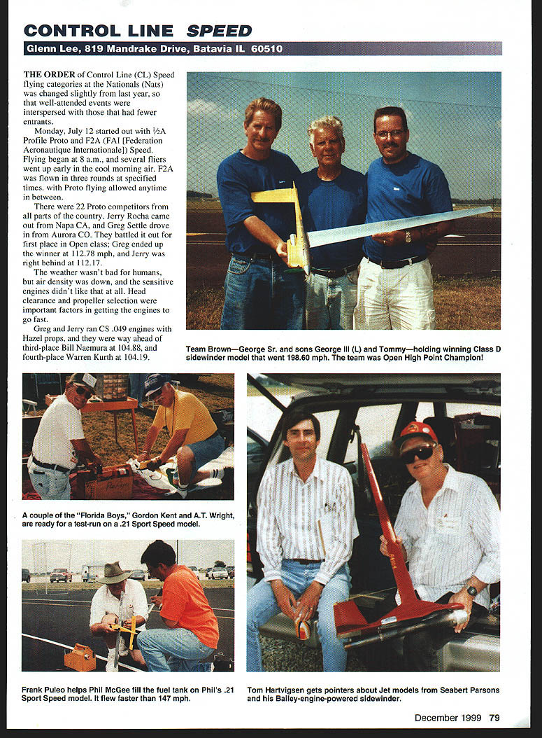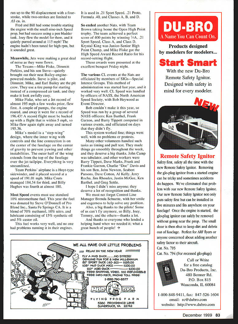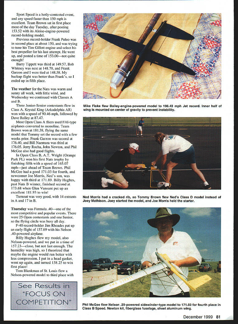 CONTROL LINE SPEED THE ORDER Control Line CL Speed flying categories Nationals Nats changed slightly last year well-attended events interspersed fewer entrants Monday July 12 started out Profile Proto F2A FAT [Federation Aeronautique Internationale] Speed Flying began 8 am several fliers went up early cool morning air F2A flown three rounds specified times Proto flying allowed anytime between 22 Proto competitors parts country Jerry Rocha came out Napa CA Greg Settle drove Aurora CO battled out first place Open class Greg ended up winner 11278 mph Jerry right behind 11217 weather wasnt bad humans air density down sensitive engines didnt like Head clearance propeller selection important factors getting engines go fast Greg Jerry ran CS 049 engines Hazel props way ahead third-place Bill Naemura 10488 fourth-place Warren Kurth 10419 December1999 79 Team BrownGeorge Sr sons George Ill L Tommyholding winning Class D sidewinder model went 19860 mph team Open High Point Champion couple Florida Boys Gordon Kent AT Wright ready test-run 21 Sport Speed model Frank Puleo helps Phil McGee fill fuel tank Phils 21 Sport Speed model flew faster 147 mph Tom Hartvigsen gets pointers about Jet models Seabert Parsons Bailey-engine-powered sidewinder eight Junior-Senior contestants Profile Proto Dave Rolley Bennett CO took first 8499 mph Scott Matson Muncie IN right behind him 8463 Krystal King Kevin Peters Wade Schoonover Philip Peters Douglas Short also posted times F2A rounds flown 10 am 1 pm 4pm 10 contestants Most competitors flew Mejzlik airplanes winner doubt until last flight Ron Peters Niagara Falls Canada came out top speed 28717 kphalmost 179 mph followed Team Brown Bill Naemura Billy Hughes Team Brown consisted George Brown Sr sons George Ill Slugger Tommy Tuesday busy day flew /2A Speed 11 contestants 21 Sport Speed 20 contestants Open Team Brown flew FABS sidewinder model powered ACE Aloise Competition Engine winning speed 14463 mph Charlie Legg right behind home-built-engine-powered sidewinder 14281 Jerry Rocha third CS-powered model 14082 Pretty good speeds 049s Three Junior-Senior contestants flew 1/2A Scott Matson winning 9006 mph Krystal King next 8609 80 Model Aviation Al Stegens Santo Rizzotto Jim Vansant prepare start Glen Vansants Class B sidewinderwon 18193 mph Jims kneepads hot blacktop Charles Legg Council Bluffs IA tough competitor /2A Frank Puleo readies 21 Sport Speed model placed second Speed placed second speed 14281 mph 153 mph NovaRossi engine Tim Gillott modified Sport Speed hotly-contested event speed faster 150 mph excellent Team Brown sat first place day Tuesday after posting 15352 its Aloise-engine-powered record-holding model Previous record-holder Frank Puleo second place about 150 trying tune Tim Gillott engine select best propeller last attempt went up posted time 15300not quite enough Barry Tippett third 14957 Bob Whitney next 14870 Frank Garzon tied 14858 backup flight better Franks ended up fifth place weather Nats warm sunny week little wind Wednesday continued Classes B Three Junior-Senior contestants flew Class Krystal King Arkadelphia AR won speed 9046 mph followed Dave Rolley 8747 Most Open Class fliers used FAI-type airplanes converted monoline Team Brown won 18138 flying same model Tommy set record few weeks prior Frank Garzon second 17640 Bill Naemura third 17605 Jerry Rocha John Newton Phil McGee also good flights Open Class B AT Wright Orange Park FL won first Nats trophy finishing fifth speed 16507 mphjust ahead Team Brown Phil McGee good 17103 fourth newcomer Joe Morris Neds son happy third 17189 Billy Hughes past Nats B winner finished second 17368 Glen Vansant put up excellent 18193 win Turnout very good 14 entrants 17 B Thursday Formula 40one competitive popular events 25 Open contestants Senior flying circle busy day F-40 record-holder Jim Rhoades put up early flight 15769 Nelson 40-powered airplane Billy Hughes flew model also Nelson-powered put time 15723close fast enough humidity high theorized maybe engine would run better less compression put head gasket went up again turned 15825 win first place Tom Blankman St Louis flew Nelson-powered model third place December 1999 81 Mike Fiske flew Bailey-engine-powered model 19643 mph Jet record Inner half wing mounted center gravity prevent instability Ned Morris cracked rib Tommy Brown flew Neds Class D model instead Joey Math ison Joey started model Joe Morris held starter eR DCW YITIC Phil McGee flew Nelson 29-powered sidewinder-type model 17103 fourth place Class B Speed Newton kit fiberglass fuselage sheet aluminum wing ~flidrJf#YLeJiI JeJ -u Ii uuiIP Makes staving easier safer Keeps GLOIUDRIVER glow plug hot last engine needs Connects hetween throttle servo receiver reversihie selectable off points Unit can drive two glow p1090 tabs oh travomitter ott 190% electronic made USA Compochie AM FM PCM rodio systoms Low power consumption Comes hookup wire Less radio connector power cell plug vIp Size t 7 v 12 v 04 Weight 04 00 Port No 0A $3495 $3790 wlconneelor $4485 WI connector & piag clip CALL complete single twin-engine twin-epiloder spolems Gives older DUAL-OUTPUT SERVOREVERSER ahility reverse direction 01 servo operation Installations setups easier convenient Provides hots normal reversed output use ot Y connector makes split elevator two-servo ailerons doubleservo rudder installation supereaoy tOO% electronic no setop tossjust connect forget Made USA works AM FM avg PCM radio spotems Ultrafow power consumption Less radio connector Size 16 009 v Od Weight 029 oz Part No 2U $2495 $2790 complete wlconneolor Gives ACCESSORYSWITCH ahility add oP function channel out sacrificing channels ability control servo Can control electrical devices drawing op 25 amps 0112 volts 300 wags manimum power dissipation micro processor basod design very simple setup install ano 00 points selected simple dry switches 000 LhD indicator helps setup Unit automaticully turns off transmitter Ott Mode USA iso AM PM PCM Low p