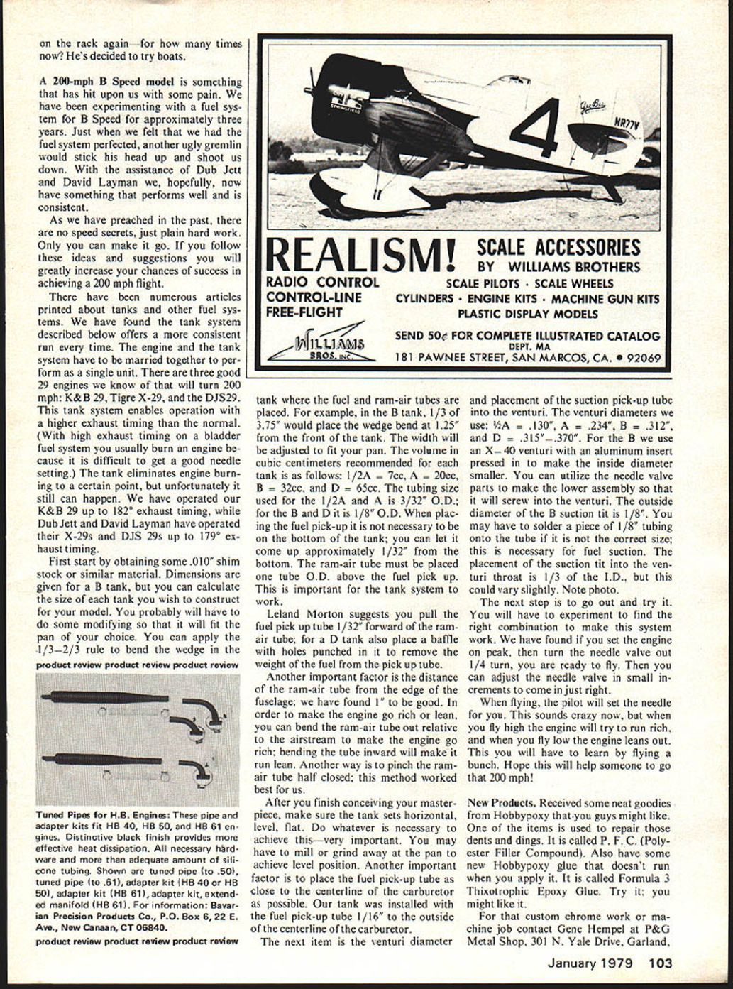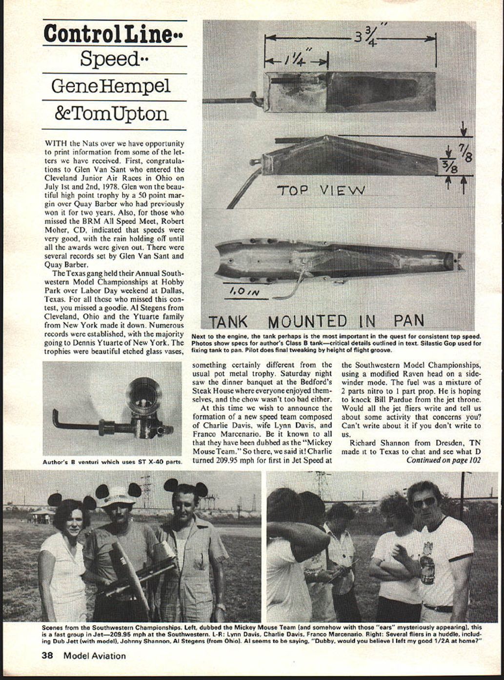 Control Line. Speed Gene Hempel &TomUpton WITH Nats over have opportunity print information some let ters have received First congratula tions Glen Van Sant entered Cleveland Junior Air Races Ohio July 1st 2nd 1978 Glen won beau tiful high point trophy 50 point mar gin over Quay Barber previously won two years Also missed BRM Speed Meet Robert Moher CD indicated speeds very good rain holding off until awards given out several records set Glen Van Sant Quay Barber Texas gang held Annual South western Model Championships Hobby Park over Labor Day weekend Dallas Texas missed con test missed goodie Al Stegens Cleveland Ohio Ytuarte family New York made down Numerous records established majority going Dennis Ytuarte New York trophies beautiful etched glass vases something certainly different usual pot metal trophy Saturday night saw dinner banquet Bedfords Steak House everyone enjoyed selves chow wasnt too bad either time wish announce formation new speed team composed Charlie Davis wife Lynn Davis Franco Marcenario known have dubbed Mickey Mouse Team So said Charlie turned 20995 mph first Jet Speed Southwestern Model Championships using modified Raven head sidewinder mode fuel mixture 2 parts nitro 1 part prop hoping knock Bill Pardue jet throne Would jet fliers write tell us about some activity concerns Cant write about dont write us Richard Shannon Dresden TN made Texas chat see what D Continued page 102 Scenes trom Southwestern ihampionships Leit dubbed key Mouse learn land somehow mysteriously appearingi fast group Jet20995 mph Southwestern L-R Lynn Davis Charlie Davis Franco Marcenario Right Several fliers huddle includ ing Dub Jett modell Johnny Shannon Al Stegens Ohiol Al seems saying Dubby would believe left good 1/2A home 38 Model Aviation Next engine tank perhaps important quest consisieni iop speed Photos show specs authors Class B tankcritical details outlined text Silastic Gop used fixing tank pan Pilot does final tweaking height flight groove Authors B venturi uses ST X-40 parts PAMPA members nearby Days Inn further info motel reservations King Orange International call Gene 904 743-1737 Joe Mead 904 388-7454 information PA MPA stunt write Wynn Paul 1640 May wick Drive Lexington KY40504 CL Speed/Hempel/Upton continued page 38 Speed has offer currently terested observing D Speed operating new mini-pipe rule Hope Richard returns flying Tom Upton has decided hang flying hat product review product review product review product review product review product review product review product review product review Mammoth Scale Pilots Separate goggles featured easy-to-paint high-impact styrenefigures Intended mammoth scale models pilot measures 4-in high Price $295 Williams Bros 181 Pawnee St San Marcos CA 92069 Muff-L-Aire Muff-L-Aire unique fully adjustable universal muffler Mini-Muff L-Aire fits engines 09 25 $695 Universal Muff-L-Aire $895 fits engines 29 80 Special K&B 40 muffler $895 same Universal muffler ex cept two additional exhaust port plugs included three mufflers fitted stainless steel spring adjustable screw control noise level backpressure preference Clean running sends exhaust straight away plane Ready stallation includes optional bolt-on pressure fitting install desired Both Universal K&B 40 mufflers can shortened up 1 fit inside cowl Mini-Muffler can shortened Black anodized fit almost installation Du-Bro Products Inc 480 Bonner Rd Wauconda IL 60084 Great Lakes Trainer Another sparkling series authentic classic aircraft Flyline 1 A-in scale 15-to 25-powered windin-the-wires biplane bit ambitious previous models line bigger featuring full-house control maximum realism $3495 Flyline Models Inc 2820 Dorr Ave B-2 Fairfax VA 22031 Finishing Book 16-pg book let written Jerry Schwartz Pactra covering aspects finishing basic materials such foam balsa fiberglassin dopes paints iron-ons such well-pre sented thoroughly done job recom mend modeler beginner expert have reference library should answer question anyone would ever raise interest boat car builders well aircrafters fact-packed clearly organized illustrated photos drawings $100 far superior single article subject ever presented magazine Recommend yourfriendsand lost souls flying field Though related Pactra products crash course what everyone needs know about finishing Pactra Indus tries Inc 7060 Hollywood Blvd Los Angel es CA 90028 Auto Mix/Super Pumper Auto Mix intend ed applications unusual conditions exist such non-pump-compatible carbur etors carburetors poor low-speed tering displacements below 401 com bination fuel system requirements make critical adjustments Robert PO Box 122 Wheaton IL 60187 RS-205 REPLA-SKETCH _t-J F CROPOUSTER New Repla-Tech Described fresh stimulating approach RC building firm fers 5 new products 1 Flying scale plans models actually structured built RC subjects first two being 1978 Cessna Agwag 2 sheets new Zlin Z-50-L Aerobatic 4 sheets 21 Repla-Build Booklets abundant photos instructions building models 3 Repla-Sketch Booklets scale data actual airplane history pix 3views sketches descriptions 4 Photo pack ets 3 x 5 color groups model airplane plus b&ws actual plane 51 Plastic parts such cockpit canopy Repla-Tech has accur ate finely drawn plans aircraft missiles ships Aircraft drawings range series 3-views detailed drawings super de tailed Catalog$100 Morrison Repla-Tech 48500 McKenzie Hwy Vida OR 97488 product review product review product review product review product review product review product review product review product review 102 ModelAviation OUR AIM IS TO KEEP SPORT FLYING SPECIALIZING IN OT FF KITS AND ENGINES FOR THE COMPETITOR WE HAVE THE HOT EQUIPMENT 1s Enterprises PLANES1356 Ervin Road BOATSP 0 Box 227 CARSPangles Center TRAINSVan Wert OH 45896 4 Joe Guylas 419 238-2645 WE BUY OR TRADE OLD ENGINES AND KITS rack againfor times now Hes decided try boats 200-mph B Speed model something has hit upon us some pain have experimenting fuel sys tem B Speed approximately three years 