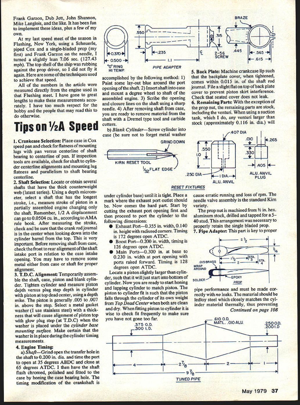 BEFORE starting mnig mis monmn- column iem mention delighted hear some Inquisitive readers beginning wonder anyone ever read column difficult write about something have no feedback readers appeal keep cards letters comingeven its just say hi something wouid ilke share send especiaiiy pertains engine work may seem unimpor tant modeiers just starting interested ail sorts good poop boaters read column engine information Hope boaters write about engine problems solutions finally blackmailed Nick Sher writing article 1/2 speed Nick has done outstanding job making COX TD 04 perform extremely well has agreed share secrets months coiumn copy follows GENE HEMPEL has requested write article about 1/2 speed specif ically engine modifications information supplied accumulation knowledge experience such engine experts Remember 100 mph 1 12A wss sensational Using Schnuerie piped Cox engine single-blade propeller two-blades plc Nick Sher turned 12743 mph tells did Fuselage inverted showing power pod pipe pictures tell clear story installation details considerable rework done internally engineas text relates 36 Model Aviation Hot pan After break-lnsee text wilitach 20 22000 breakin fueiK&B 100 case pipe adapter 70% nitro fuel 25 27000 rpm indicative good performance pipe adapter usually add 2 3000 rpm ground Frank Garzon Dub Jett John Shannon Mike Langlois like has fun implement ideas plus few own last speed meet season Flushing New York using Schnuerle piped Cox single-bladed prop first Frank Garzon needle turned slightly lean 706 sec 12743 mph top shell ship rubbing against prop driver did fly again some techniques used achieve speed numbers article measured directly engine used Flushing meet have gone great lengths make measurements accu rately have too much respect hobby people may read otherwise TIpSOAV2A Speed 1 Crankcase Selection Place case Cox speed pan check flatness mounting lugs pan versus centerline shaft bearing centerline pan inspection tools available check shaft cylin der centerline alignments mounting lug flatness parallelism shaft bearing centerline 2 Shaft Selectioiu Locate obtain several shafts have thick counterweight web latest series Using depth microm eter select shaft has longest stroke ie measure stroke piston partially assembled engine changing shaft Remember 1/2 displacement can go 00504 cu according AMA rule book After measuring stroke check sure crank rod journal center looking down cylinder barrel top very important Before removing shaft case check front rear alignment shaft intake port relation case intake opening may have remove some metal either case shaft proper alignment 3 TDC Alignment Temporarily assem ble shaft case piston blank cylin der Tighten cylinder measure piston depth versus plug step depth cylinder piston top dead center using depth mike piston generally 005 007 above step Select metal gasket washer use stainless steel thick ness will cause alignment piston top glow plug step TDC washer placed under cylinder base mounting surface Make certain washer place during cylinder timing measurements 4 Engine Timing ShaftGrind open transfer hole shaft 0200 dia time port open 35 degrees ABDC close 65 degrees ATDC have shaft flash chromed polished fitted case honing case bearing hole timing modification crankshaft 550F11177FKTFT 050014II 0 RING HI TEMP PIPE ADAPTER accomplished following method 1 Paint some lay-out blue around port opening shaft 2 Insert shaft case mount degree wheel shaft assembled engine 3 Scribe opening closure lines shaft using sharp needle 4 After removing shaft case ready remove material shaft Dremel type tool carbide cutters b Blank CylinderScrew cylinder case sure forget metal washer GRIND DOWN KIRN RESET TOOL / FLAT EDGE 32 under cylinder base until tight Place mark exhaust port outlet should Now comes hard part Start cutting exhaust port opening first proceed port cylinder following dimensions Exhaust Port0355 width 0140 height radiused oomers Timing 172 degrees open ATDC Boost Port0200 width timing 126 degrees open ATDC Main Ports0300 base 0230 width port opening ports raked forward Timing 128 degrees open ATDC Locate piston slightly larger cylin der such will just start bottom cylinder Now ready start honing lapping cylinder match piston piston cylinder fit such piston falls through cylinder its own weight Top Dead Center both clean dry fitting piston cylinder wise check fit frequently make sure have gone too far 375 OD 300 D T U- 4 BRAZE 2-56 SCREW 5 Back Plate Machine crankcase lip such backplate cover tightened comes within 0015 shaft rod journal File slight flat top back plate cover prevent piston skirt interference Check seated cover does leak 6 Remaining Parts exception prop nut remaining parts stock including venturi using suction tank venturi larger stock approximately 0116 dia will 407 DIA j~265 LOj330 I- IAO5K 250 DIA LiALU ANVIL jqIDIA1PLUG ALU ANVIL RESET FIXTURES cause erratic running loss rpm needle valve assembly standard Kim variety prop nut machined aluminum stock drilled tapped aS 40 stud arrangement necessary properly retain single bladed prop 7 Pipe Adapter part key proper 2 015 BRASSSTA 2 WRAP AROUND I,- EPOXY SOLDER PROP pipe performance must made cor rectly no leaks material should ledloy steel closely matches cyl inder material thermally thus preventing Continued page 108 610 aD MATL OIOALU.2500D 200 ID -a 82I D PIPE May1979 37 1L1 9 SHIRT AMA WINGS AMA Wings 4 COLOR$650 PERMISSION FROM AMA Size S M L XL ostage custom work Clubs special events businesses Information sent request FLI * HIRT 5132 DEL REV VEGAS NEVADA 702 878-162489102 PLANS7 MAP range plans England largest compre hensive world Buya plans handbook find out yourself handbook contains full details of thousands plans prices plans available US agents listed handbooks Aeromodeiling Model Boats Cars Modei Engineering Radio ControlAircraft model Allied MAP PUbli wtiom Ltd runners sanitary engineers clean up end day Half-A judges test pilots judging practice M