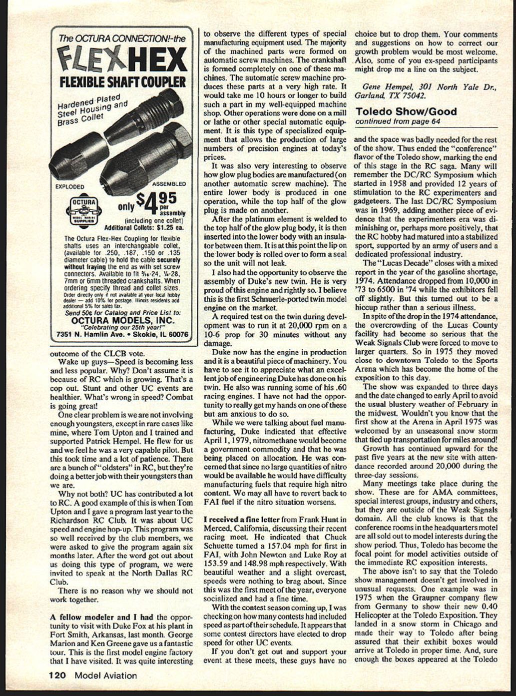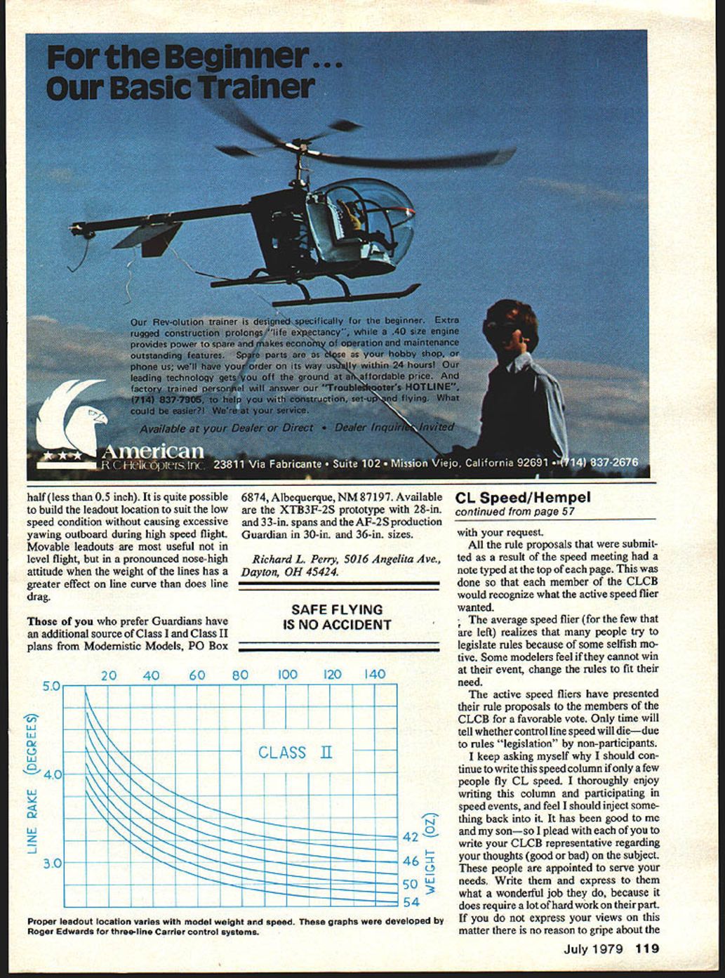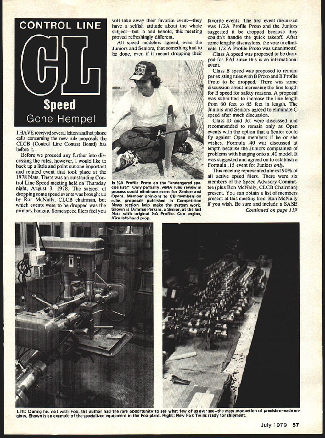 I HAVE received several letters hot phone calls concerning new rule proposals CLCB Control Line Contest Board has before Before proceed further dis cussing rules however would like back up little point out important related event took place 1978 Nats outstanding Con trol Line Speed meeting held Thursday nigln August 3 1978 subject dropping some speed events brought up Ron McNally CLCB chairman events dropped primary hangup Some speed fliers feel favorite events first event discussed 1/2A Profile Proto Juniors suggested dropped because couldnt handle quick takeoff After some lengthy discussions vote elimi nate 1/2 Profile Proto unanimous Class speed proposed drop ped FAT since international event Class B speed proposed remain per existing rules B Proto B Profile Proto dropped some discussion about increasing line length B speed safety reasons proposal submitted increase line length 60 feet 65 feet length Juniors Seniors agreed eliminate C speed after much discussion Class D Jet discussed recommended remain Open events option Senior could fly against Open members wishes Formula 40 discussed length because Juniors complained problems hanging onto 40 model suggested agreed establish Formula 15 event Juniors meeting represented almost 90% active speed fliers six members Speed Advisory Commit tee plus Ron McNally CLCB Chairman present can obtain list members present meeting Ron McNally wish sure include SASE Continued page 119 July 1979 57 will take away favorite eventthey have selfish attitude about whole subjectbut lo behold meeting proved refreshingly different speed modelers agreed Juniors Seniors something done meant dropping AA Profile Proto endangered spe cies list Only partially AMA rules review process could eliminate event Seniors Opens Member opinions CR members rules proposals published Competition News section help make system work Shown Dimmie Perkins Senior last Nats original AA Profile Cox engine Kim left-hand nron LeT iurmng nis visit warn I-ox autnor nsa tne rare opportunity see wnat rew us ever seetn mass proauction 01 EirUCisiOn-fTleUU en gines Shown example specialized equipment Fox plant Right New Fox Twins ready shipment halfless 05 inch quite possible build leadout location suit low speed condition causing excessive yawing outboard during high speed flight Movable leadouts useful level flight pronounced nose-high attitude weight lines has greater effect line curve does line drag prefer Guardians have additional source Class land Class II plans Modernistic Models P0 Box 50 40ii] Qe Li] z -J 30 2040 Richard L Perry 5016 Angelita Ave Dayton OH 45424 SAFE FLYING IS NO ACCIDENT 608010020140 t_____ CLASS II Proper leadout location varies model weight speed graphs ware developed Roger Edwards three-line Carrier control systems request rule proposals submit ted result speed meeting note typed top page done member CLCB would recognize what active speed flier wanted average speed flier few left realizes people try legislate rules because some selfish mo tive Some modelers feel cannot win event change rules fit need active speed fliers have presented rule proposals members CLCB favorable vote Only time will tell whether control line speed will diedue rules legislation non-participants keep asking myself should con tinue write speed column few people fly CL speed thoroughly enjoy writing column participating speed events feel should inject some J thing back has good 42 0and sonso plead write CLCB representative regarding 46 thoughts good bad subject 0These people appointed serve 50 Li-ineeds Write express what wonderful job because 54does require lot hard work part express views matter no reason gripe about July 1979 119 6874 Albequerque NM 87197 Available CL Speed/Hem pel XTB3F-2S prototype 28-in continued page 57 33-in spans AF-2S production Guardian 30-in 36-in sizes OCTURA CONNEC71ON-t LEY4H EX Octura Flex-Hex Coupling flexible shafts uses interchangeable collet available 250 187 150 135 diameter cable hold cable securely fraying end set screw connectors Available fit 4e-24 /-28 7mm 6mm threaded crankshafts ordering specify thread collet sizes Order directly available local bobby dealer 10% tor postage Illinois residents add additional 5% tor sales tax Send 50e Catalog Price List OCTURA MODELS INC Celebrating 25th year 7351 N Hamlin Ave ie IL 60076 outcome CLCB vote Wake up guysSpeed becoming less less popular Dont assume because RC growing Thats cop out Stunt other UC events healthier Whats wrong speed Combat going great clear problem involving enough youngsters except rare cases like Tom Upton trained supported Patrick Hempel flew us feel very capable pilot took time lot patience bunch ofoldsters RC theyre doing betterjob youngsters both UC has contributed lot RC good example Tom Upton gave program last year Richardson RC Club about UC speed engine hop-up program well received club members asked give program again six months later After word got out about us doing type program invited speak North Dallas RC Club no reason should work together fellow modeler oppor tunity visit Duke Fox plant Fort Smith Arkansas last month George Marion Ken Greene gave us fantastic tour first model engine factory have visited quite interesting observe different types special manufacturing equipment used majority machined parts formed automatic screw machines crankshaft formed completely ma chines automatic screw machine pro duces parts very high rate would take 10 hours longer build such part well-equipped machine shop Other operations done mill lathe other special automatic equip ment type specialized equip ment ailows production large numbers precision engines todays prices also very interesting observe glow plug bodies manufactured another automatic screw machine entire lower body produced operation top half glow plug made another After platinum element welded top half glow plug body inserted lower body insula tor between point lip lower body rolled over form seal unit will leak also opportun