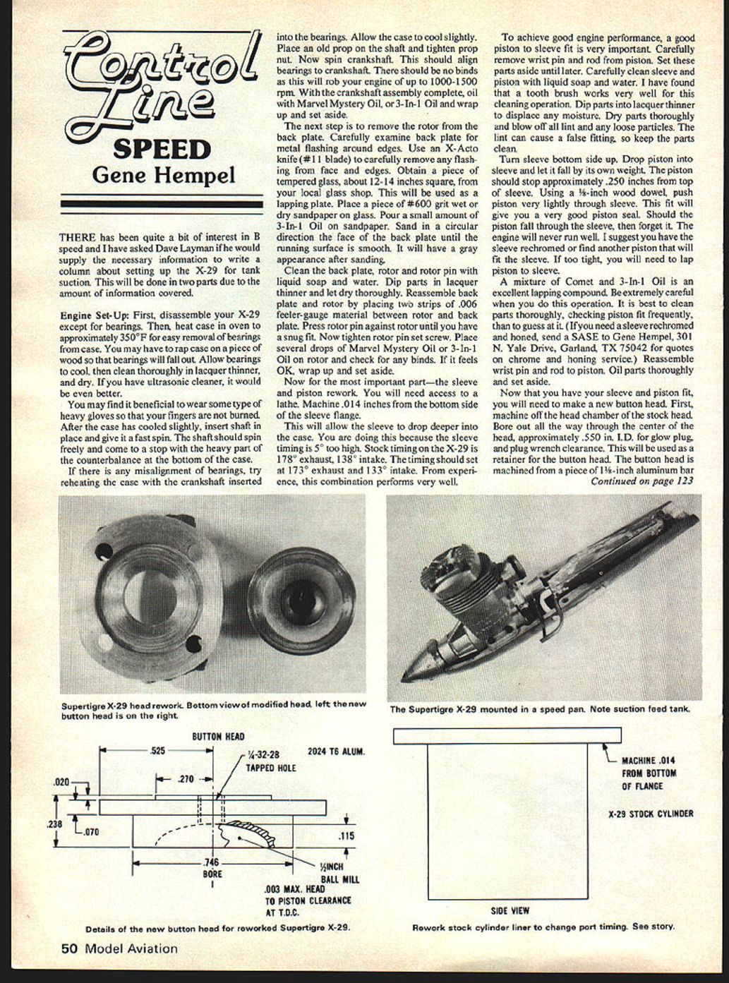 C SPEED Gene Hempel THERE has quite bit interest B speed have asked Dave Layman would supply necessary information write column about setting up X-29 tank suction will done two parts due amount information covered Engine Set-Up First disassemble X-29 except bearings heat case oven approximately 3500F easy removal bearings case may have rap case piece wood bearings will fall out Allow bearings cool clean thoroughly lacquer thinner dry have ultrasonic cleaner would better may find beneficial wear some type heavy gloves fingers burned After case has cooled slightly insert shaft place give fast spin shaft should spin freely come stop heavy part counterbalance bottom case misalignment bearings try reheating case crankshaft inserted bearings Allow case cool slightly Place old prop shaft tighten prop nut Now spin crankshaft should align bearings crankshaft should no binds will rob engine up 1000-1500 rpm crankshaft assembly complete oil Marvel Mystery Oil 3-In-i Oil wrap up set aside next step remove rotor back plate Carefully examine back plate metal flashing around edges Use X-Acto knife #11 blade carefully remove flash ing face edges Obtain piece tempered glass about 12-14 inches square local glass shop will used lapping plate Place piece #600 grit wet dry sandpaper glass Pour small amount 3-In-l Oil sandpaper Sand circular direction face back plate until running surface smooth will have gray appearance after sanding Clean back plate rotor rotor pin liquid soap water Dip parts lacquer thinner let dry thoroughly Reassemble back plate rotor placing two strips 006 feeler-gauge material between rotor back plate Press rotor pin against rotor until have snug fit Now tighten rotor pin set screw Place several drops Marvel Mystery Oil 3-In-i Oil rotor check binds feels OK wrap up set aside Now important partthe sleeve piston rework will need access lathe Machine 014 inches bottom side sleeve flange will allow sleeve drop deeper case doing because sleeve timing 5 too high Stock timing X-29 1780 exhaust 1380 intake Thetiming should set 1730 exhaust 1330 intake experi ence combination performs very well achieve good engine performance good piston sleeve fit very important Carefully remove wrist pin rod piston Set parts aside uistil later Carefully clean sleeve piston liquid soap water have found tooth brush works very well cleaning operation Dip parts lacquer thinner displace moisture Dry parts thoroughly blow off lint loose particles lint can cause false fitting keep parts clean Turn sleeve bottom side up Drop piston sleeve let fall its own weight piston should stop approximately 250 inches top sleeve Using -inch wood dowel push piston very lightly through sleeve fit will give very good piston seal Should piston fall through sleeve forget engine will never run well suggest have sleeve rechromed find another piston will fit sleeve too tight will need lap piston sleeve mixture Comet 3-h-i Oil excellent lapping compound extremely careful operation best clean parts thoroughly checking piston fit frequently guess need sleeve rechromed honed send SASE Gene Hempel 301 N Yale Drive Garland TX 75042 quotes chrome honing service Reassemble wrist pin rod piston Oil parts thoroughly set aside Now have sleeve piston fit will need make new button head First machine off head chamber stock head Bore out way through center head approximately 550 LD glow plug plug wrench clearance will used retainer button head button head machined piece 1-inch aluminum bar Continued page 123 K 525 210-. 7I 238 Ii BUTTON HEAD %-32-2B2024 TB ALUM TAPPED HOLE 115 146AINCH BOREBALL MILL 003 MAX HEAD TO PISTON CLEARANCE AT TOC Details new button head reworked Supertigre X-29 MACHINE 014 FROM BOTTOM OF FLANGE X-29 STOCK CYLINDER SIDE VIEW Rework stock cylinder liner change port timing See story 50 Model Aviation SupertigreX-29 head rework Bottomviewof modified heed left thenew button head right Supertigre A- mountea speea pan Note suction feed tank Bucker Bu-133 Jungmeister new Bucker Jungmeister 1/5 scale de signed give maximum aerobatic performance 60 engine kit documentation will illus trate 3 4 different versions famed German biplane appropriate 3-viewsThe model also convertible Jungmann version Its very versatile airplanel Construction all-wood wing structure comparable famed Wacos sequential photo-illustrated instruction manual makes putting together snap bipe youll enjoy building much flyingl FEATURES Mylar decals 60 span Complete hardware pkg 1030 sq area Builds 3 versions 49 length Modifiable Jungmann Weight 8-9 lbs Illustrated instruc 60 engine vacu-formed cowl rice $9995 2657 NE 188th Street Miami Florida 33180 Telephone 305 935-1436 previous turnouts fliers general abilities instance contest has drawn approximately 15 fliers past Beginners Intermediates Advanced contest could advertised having PA NIPA categoriea Beginner Intermediate combined Advanced Expert keeps number trophy sets three same required traditional AMA three divisions practice fliers voluntarily placing themselves cate gories seems have worked quite well over past couple years Only very few instances sandbagging have come light cases through ignorance scoring abilities rather anything else areas PAMPA categories have tried usually takes just few voices stunt fliers get contest director go ahead P NI P classes Once instituted use P AM P cate gories seems help drawing out stunt fliers some instances AMA Novice pattern has used P NI P begin ner category help get new fliers stunt flying handout sheet complete instruc tions holding P AM P category stunt contest available Keep clean English stunt newslet ter Claptrap comes suggestion Robert King periodically clean both muffler pressure fitting remove residue numerous flights experiencing lean runs some engine stopping mid-flight After changing engines tanks filter fuel lines thing left muffler pressure fitting surmised partial blocking pressure fitting residue causing lean runs info rmation Ofl Stunt orP 4 MP 4 write Wy