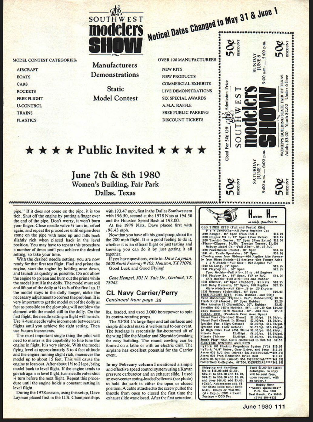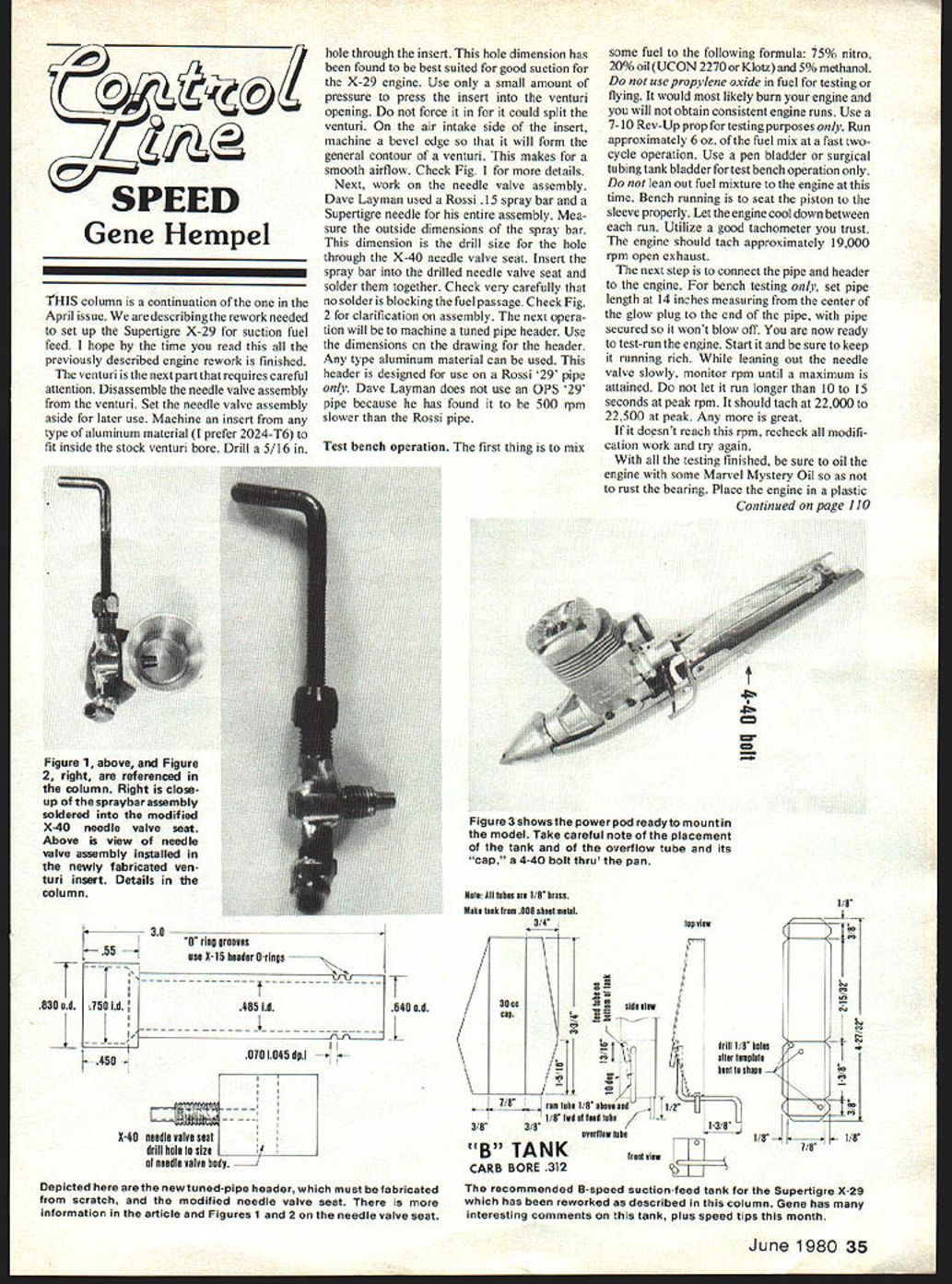 C SPEED Gene Hempel THIS column continuation the April issue describing rework needed set up Supertigre X-29 suction fuel feed hope time read previously described engine rework finished venturi next part requires careful attention Disassemble needle valve assembly venturi Set needle valve assembly aside later use Machine insert type aluminum material prefer 2024-16 fit inside stock venturi bore Drill 5/16 30__________ 0 ring grooves use X-15 header 0-rings 750 id.485 id 070l045dpl -- Fhole through insert hole dimension has found best suited good suction X-29 engine Use small amount pressure press insert venturi opening force it could split venturi air intake side insert machine bevel edge will form general contour venturi makes smooth airflow Check Fig 1 details Next work needle valve assembly Dave Layman used Rossi 15 spray bar Supertigre needle entire assembly Mea sure outside dimensions spray bar dimension drill size hole through X-40 needle valve seat Insert spray bar drilled needle valve seat solder together Check very carefully no solder blocking fuel passage Check Fig 2 clarification assembly next opera tion will machine tuned pipe header Use dimensions drawing header Any type aluminum material can used header designed use Rossi 29 pipe Dave Layman does use OPS 29 pipe because has found 500 rpm slower Rossi pipe Test bench operation first thing mix liii X-40 needle valve seal drill hole lv size 01 needle valve hod Depicted new tuned-pipe header must fabricated scratch modified needle valve seat information article Figures 1 2 needle valve seat some fuel following formula 75% nitro 20% oil UCON 2270 Klotz 5% methanol use propylene oxide fuel testing flying would likely burn engine will obtain consistent engine runs Use 7-10 Rev-Up prop testing purposes Run approximately 6 oz fuel mix fast twocycle operation Use pen bladder surgical tubing tank bladder test bench operation lean out fuel mixture engine time Bench running seat piston sleeve properly Let engine cool down between run Utilize good tachometer trust engine should tach approximately 19000 rpm open exhaust next step connect pipe header engine bench testing set pipe length 14 inches measuring center glow plug end pipe pipe secured wont blow off now ready test-run engine Start sure keep running rich leaning out needle valve slowly monitor rpm until maximum attained let run longer 10 15 seconds peak rpm should tach 22000 22500 peak Any great doesnt reach rpm recheck modifi cation work try again testing finished sure oil engine some Marvel Mystery Oil rust bearing Place engine plastic Continued page 110 Figure3showsthepowerpod readyto mountin model Take careful note placement tank overflow tube its cap 4-40 bolt thru pan Cots tehes 1/0 brass I/A Make teak tram 008 skeet metal 3/4tap view IC 30 CCaide view can drill 1/0 boles alter Implate bent abapa 7/0rem tube 1/8 above avd I/O ted 1 lead lobe 3/03/8avertise lobetin tni TANKIrvalview LIL2IL1/8 CARS BORE 312 recommended B speed sucteon feed tank Supertigre X-29 has reworked descrebed en column Gene has interesting comments thts tank plus speed tips month June 1980 35 Figure 1 above Figure 2 right referenced column Right close up spraybar assembly soldered modified X-40 needle valve seat Above view needle valve assembly installed newly fabricated ven turi insert Details column 640 ed DRESS FOR THE OCCASION Get ready warm RC weather high-quality Tee Shirts BILL EVANS Silkscreened 100% cotten multi-colors theyre available sizes 5 M L XL Choose ELECK RIDER/Yellow ASTRON/Light Blue SIMITAR 540/Tan SEND $695 plus $100 shipping ch1 COREFIIM new instant dry adhesive PA wide 36 yard rolls $895 also offer following high-quality RC kits Simitar Sport Slope Squire Saracen Seville Winterhawk Hot Rock Simitar 540 Write complete brochure fine products x E ng ala strong process Eliminates gaps between control surfaces better performance 35/$189 BILL EVANS ~AIRCRAFT 20825 ROSCOE BLVD CANOGA PARK CA 91306/ TELEPHONE 213 7090894 able YAK series fighters Lavochkins 35 ft wingspan twin-row eighteen cylinder air-cooled engine 1850 hp Top speed 390 mph Armament consisted twin 20mm cannons six 55 lb rockets under wings Another unique feature automatic leading edge slats popped out critical airspeeds eliminate wingtip stalls Al talks about model LA-5 Lavochkin since its completion has won seven first place trophies both flying static competitions An original design adventure build document always draws comments now well known area own personal total airplane wingspan 33 inches weighs 1 lb 12 oz engine has no throttle bad mistake Split flaps actuated aileron bellcranks pushrods internally mounted horn Leading edge slats actuated another set bellcranks rods held open position compression springs until pulled Bomb release nothing simple lynch-pin actuated fifth line model flies great Being light overpowered goes sound scale speed 62 ft lines drag five control lines Model sheeted 1/32 sheet balsa painted mixture Aero Gloss flat dopes An idiosyncrasy real LA-S bounced badly during landings Believe scale aspect original has faithfully duplicated way big ambition now build model improving Lavochkin take Nats Id kind like compete against after its over could sit shade talk about airplanes tell other what did wrong blew last flight last time Nationals held Ohio Dayton 1976 turnout CL Sport Precision Scale nothing short spectacular year Nats scheduled Wilming ton OH excitement could just great Cleveland Dayton Cincinnati have always hotbeds ukie scale activity Chicago Indianapolis New York etc also well within driving range year will have two days flying should eliminate chance repeat last years windy blowout Lincoln live within range Wilmington have entertaining inner thoughts someday coming Natsdo now means bring along model enter Lets hear tired old excuse NATS airplane good enough Bring along give best shot may surprised well can know youll have good time Ed note sure pre register Mike Gretz Box 162 Montezuma