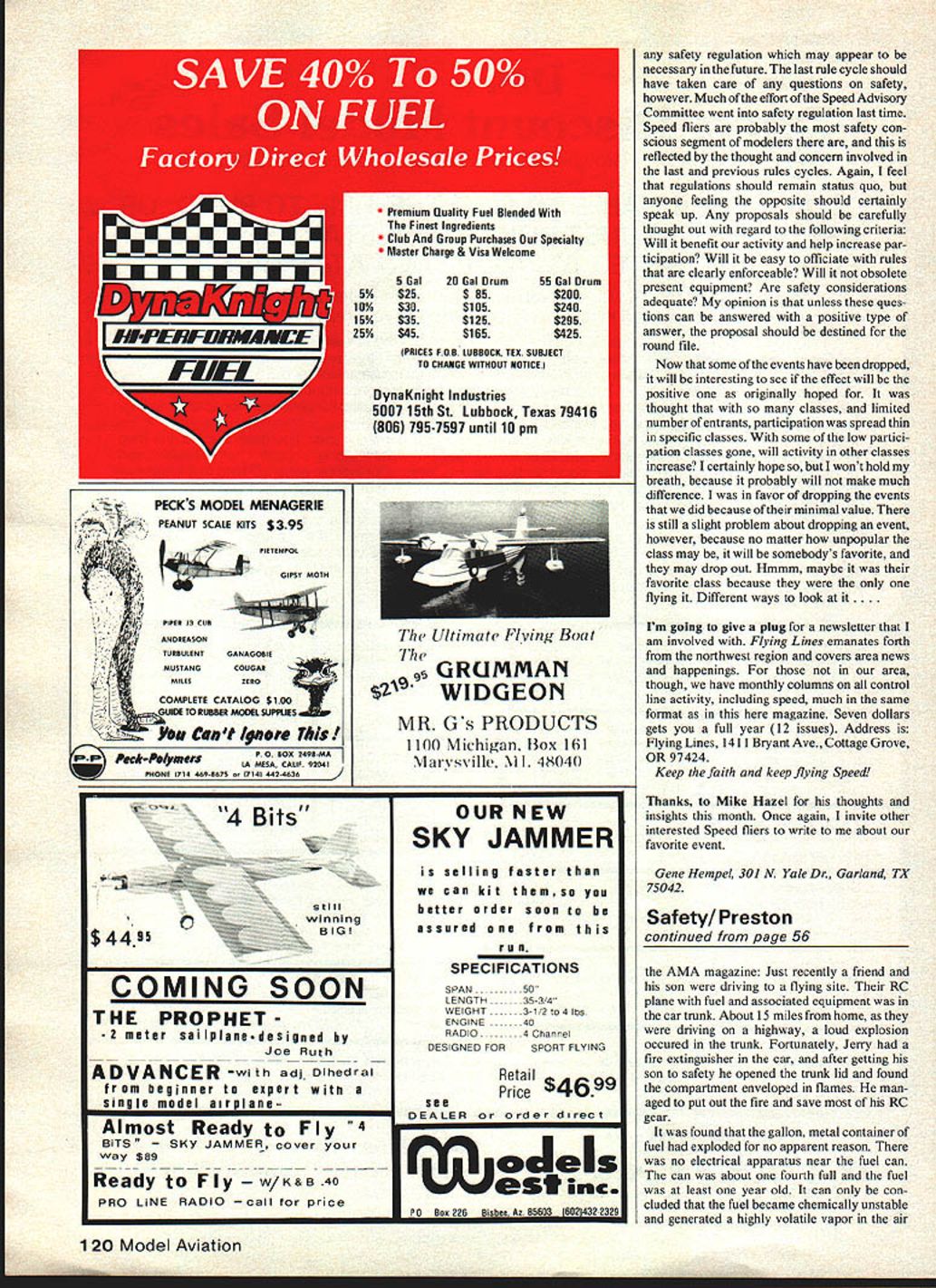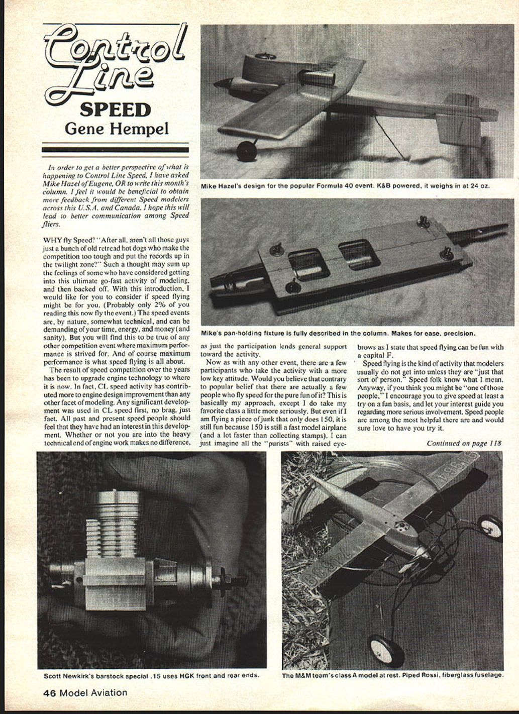 C SPEED Gene Hempel order get better perspective what happening ControlLine Speed have asked Mike Hazel ofEugene OR write months column feel would beneficial obtain feedback dfferent Speed modelers across USA Canada hope will lead better communication among Speed fliers WHY fly Speed After arent guys just bunch old retread hot dogs make competition too tough put records up twilight zone Such thought may sum up feelings some have considered getting ultimate go-fast activity modeling backed off introduction would like consider speed flying might Probably 2% reading now fly event speed events nature somewhat technical can demanding time energy money sanity will find true other competition event maximum perfor mance strived course maximum performance what speed flying about result speed competition over years has upgrade engine technology now fact CL speed activity has contrib uted engine design improvement other facet modeling Any significant develop ment used CL speed first no brag just fact past present speed people should feel have interest develop ment Whether heavy technical end engine work makes no difference just participation lends general support toward activity Now other event few participants take activity low key attitude Would believe contrary popular belief actually few people fly speed pure fun basically approach except take favorite class little seriously am flying piece ofjunk does 150 still fun because 150 still fast model airplane lot faster collecting stamps can just imagine purists raised eyebrows state speed flying can fun capital F Speed flying kind activity modelers usually get unless just sort person Speed folk know what mean Anyway think might people encourage give speed least try fun basis let interest guide regarding serious involvement Speed people among helpful would sure love have try 46 Model Aviation Mike Hazels design tor popular Formula 40 event K&B powered weighs 24 oz Mikes panhoIding fixture fully described column Makes ease precision Continued page 118 Scott Newkirks barstock special 15 uses HGK front rear ends M&M teams class model rest Piped Rossi fi. OHIO SUPERSTAR MODEL PRODUCTS INC 5630 Cherokee Drive Canton Uti 441ZU HOBRYHTOEAWAYHOBBYHIT1EAWAYHO8BYHTOEAWAYHOBBYHIOEAWA FAMOUS BRITISH DIESELS MODELLER PLANS SPARES M/E PAw 0/C 2nd EDITION CATALOG-DIESEL HANDBOOK S 300 pp HOBBY HIDEWAYDELAVANIL 309 244-7389 61734 C HOBBYHIDEAWAYHOASYHIDEAWAYHOBBYHIDEAWAYIIOBBYHtDEAW stalling speed 8 lb plane calculated find speed quarter scale P-S Mustang prototype speed 300 mph found model should cruising 150 mph multiplying 300 05 square root 025 seems unreasonably fast 4-size P-SI have observed appear flying about half speed near 75 mph calculations small planes slow prototype speeds large planes reduced small model size seem align typical model speeds know Hot military racing planes large model sizes wouldnt have sufficient power reach speeds formula indicates should scale speed controversy con tinues Have opinion Lets hear light model can flown slower speeds heavier its top speed could faster because drag reduction Reducing angular difference between wing stabilizer would make easier control higher speeds use down trim transmitter would result tab effect would trim changes between high low speed flight Changing dihedral scale model has too great effect appearance would done scale modelers BoboodDolli Wischer Ri 1 S-221 Lapham PeaA Road Delafield WI 5308 CL Speed/Hempel continued page 46 plane sitting takeoff dolly Class job M&M team Cali fornia everybodys favorite husband wife speed team Fred Joyce Mar garido took 1st place Lincoln Nationals 17301 score smooth flying desing Detail powerplant rear intake ABC Rossi fuel supplied John Newton design suction tank sets cut down Tatone pan partially shrouded pipe set 11 length within John Newton eliminator-style glass fuselage uneven length wing panels 010 aluminum basswood spar inboard wing has exposed area 255 sq outboard 18 sq 118 bass wood tail has 20 sq Merced CA site first speed meet year March 16 Some records just laying open waiting grabbed because rule changes Scott Newkirk did 13788 F40 included two laps burning down result plug seal going pftouie No backup flight Will interesting see what new 40% nitro fuel rule will Frank Hunt recorded 18060 backup take Class B record new longer line So much wide open records FAI fliers put some fast times Doug Hinckley turning low 140s John Newton upper 140s Luthor Roy blew everyone away Luke upped record 16029 previous 159 flight backup alky boys appear getting consistency fuel regulator systems now seems lot fine tuning involved Look big speed racing two-day bash over Labor Day weekend Write Frank Hunt details 551 Brookdale Merced CA 95340 pan-holding fixture pictured handy tool quickly easily made Whether pan work press hand tools will make things little easier making pan easy handle Heres put together Cut out two pieces /4 thicker plywood four twelve Next both pieces atop other drill 7/32 hold corner Counter sink holes piece thread 2 x flathead machine screw holes other piece opened up 5/16 Cut window two top piece pictured Now assemble large washers under wingnuts pan can now sandwiched fixture scrap bass ply used under rear pan shim up top surfaces pan trued level wingnuts equally spaced top machine screws year beginning another rules cycle oh boy Let go record saying should just let rules alone go around exception would getting rid builder-of-the-model rule course adding 11 8 Model Aviation R E/XLISN1 SCALE ACCESSORIES WILLIAMS BROTHERS RADIO CONTROL SCALE PILOTS SCALE WHEELS CONTROL-LINECYLINDiRS ENGINE KITS MACHINE GUN KITS FREE-FLIGHT TIC DISPLAY MODELS SEND $1 FOR COMPLETE ILLUSTRATED CATALOG DEPT MA 181 PAWNEE STREET SAN MARCOS CA 9 NEW ZLIN Z5OL AEROBATIC QUARTER SCALE MODEL ENGINE 90 WINGSPAN 80 CONSTRUCTION Foam Wing a Fuselage Tail WING AREA 1122 sq FLYING WEIGHT iOta 11 lbs FiberglasCowl 3/16 Aluminium Landing Gear RosiesD&R Power Pod Fits CDX T- D & Med 