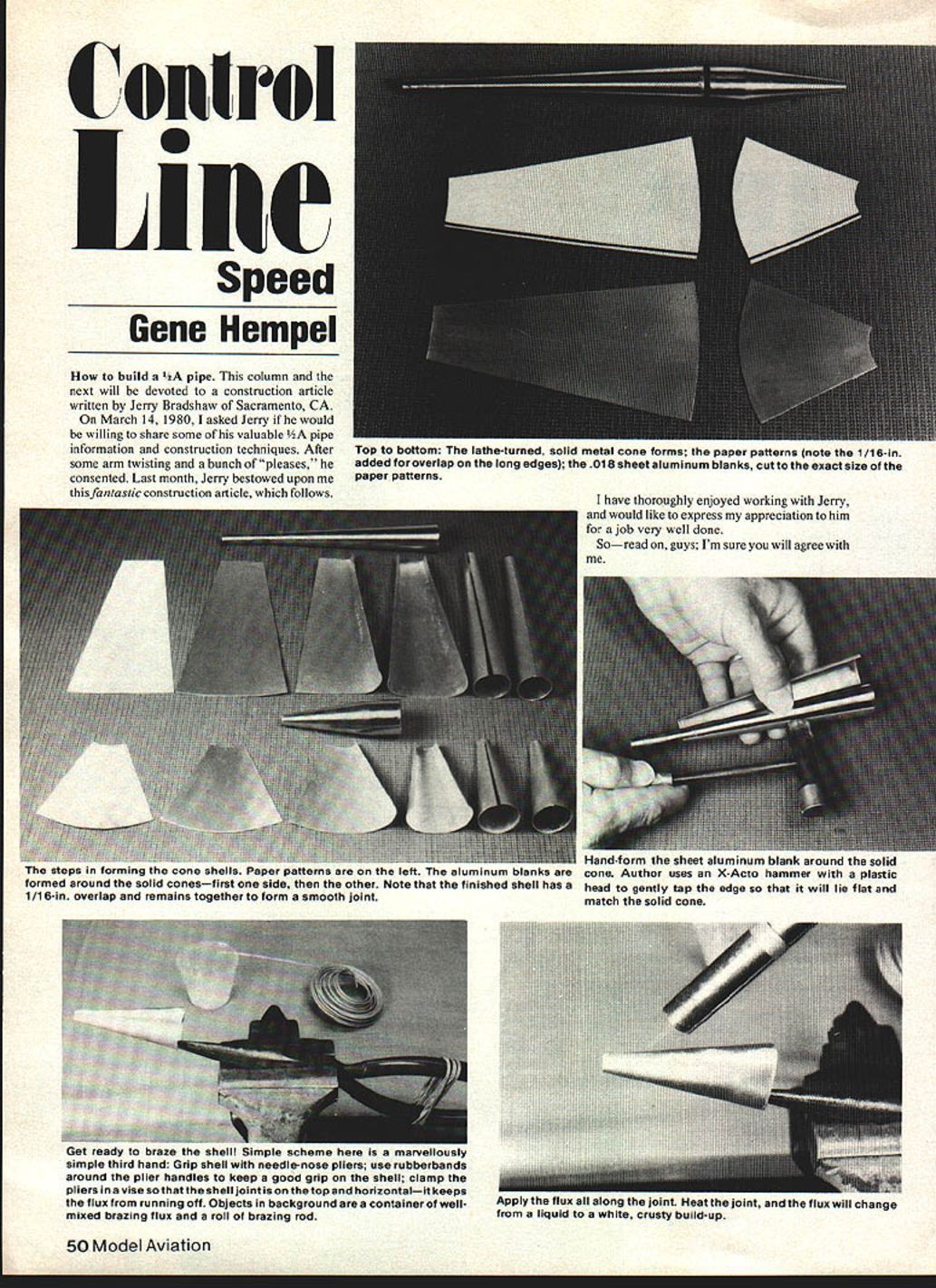 C onE rot M Speed Gene Hempel build sA pipe column next will devoted construction article written Jeny Bradshaw Sacramento CA March 14 1980 asked Jerry would willing share some valuable pipe information construction techniques After some arm twisting bunch pleases consented Last month Jerry bestowed upon fantastic construction article follows have thoroughly enjoyed working Jerry would like express appreciation him ajob very well done Soread guys Im sure will agree Hand-torm sheet aluminum blank around solid Inc smeps Ifl forming inc cone snells raper patterns inc len aluminum bianks cone Author uses X-Acto hammer plastic formed around solid conesfirst side other Note finished shell has head gently tap edge will lie flat 1/16-in overlap remains together form smooth joint match solid cone 50 Model Aviation Top bottom lathe-turned solid metal cone forms paper patterns note 1/16-in added overlap long edges 018 sheet aluminum blanks cut exact size paper patterns UCI recoy 10 oraze snell impie scneme nere IS marvellously simple third hand Grip shell needle-nose pliers use rubberbands around plier handles keep good grip shell clamp pliers vise shell joint top horizontalit keeps flux running off Objects background container wellmixed brazing flux roll brazing rod Mpply inc nux aiong Joint Pleat joint flux will change liquid white crusty build-up Build Own AA Tuned Pipe competitive Speed advan tageous use tuned pipe Unfortunately pipes homebuilt ones sharing construction techniques hope help encourage modelers build own tuned pipes pipe design article exact used establish Speed record 12011 mph 1974 construction tech niques can used build size pipe fact Luther Roy used techniques make pipe used set new FAI Speed record 16029 mph Editors note record has subsequently bettered Charles Lieber 16221 mph ABMeM Pipe material Select purest aluminum parts will give best braze will also soft easier form Avoid 2000 7000 series aluminum very difficult braze cones made 1100 H sheet aluminum 0018-in thick pipe adaptor headpipe end headpipe made 6061-T4 aluminum headpipe 5/16-in ID Ys-in od aluminum tubing tailpipe 7/32-in ID -in OD aluminum tubing available hobby shops local surplus store good source other aluminum Brazing material brazing wire flux used can purchased Sears Craftsman No 718 aluminum brazing wire 1/16-in diameter No33 aluminum brazing flux two items come twin-pack numbered 80994 Heat source use regular Bernzomatic torch heat uses propane gas fuel brazing use pencil-flame burner unit model JT 681 CAUTION*CAUTION*CAUTION propane torch such Bernzomatic can produce heat high 1400 degrees Fahrenheit Keep work area clear flammable items Pipe design pipe design shown arrived after much trial error Although design has proven very effective no means ultimate experimenting different lengths angles may pleasant ly surprised find additional power purpose article show tuned pipe can constructed using very basic tools intent cover resonant expansion chamber theory design very good source information found TwoStroke Tuners Handbook Gordon Jennings Bill Wisniewskis article Model Airplane News March 1967 another excellent source Before construction techniques pre sented detail want very honest say brazing aluminum easy task roughly 50-degree spread between melt ing brazing rod melting sheet alumi num tricky job have become familiar much heat use remove flame can done little practice Give try Construction techniques lathe turn two metal wood cones exact size inside dimensions front rear cones next step make paper pattern cone Roll piece paper around cone edge paper forms center line end end cone paper draw line around ends cone another line down center Allow 1/16-in overlap joint Cut piece sheet aluminum same size pattern Repeat same steps other cone use Scotch Brite clean pieces wash soap water use steel wool clean metal tiny particles could remain contaminate Continued page 12U April1981 51 eriur IUA will dJdl1 turn liqujo As rod starts melt move flame rod down joint Use great careIts over flux will flow down cone solidify look messy 5Ohotter aluminum shell will meltLet cone cool scrub off flux soap watereasy forms Two metal conesthe exact size inside dimension front rear cones youre going make M ~ iflcations Th i mm 111111ca 1245 81 jfl-____ IlliIIIIi liii 111111 IIHIL1111111 III IIIWeight 12 Engine 91 line drixe unit 1 eperate detachahi presheeted wing panels 2 lreassemhiled fuselage frame 1 lreassemhiled stabilizer clevators vertical fin rudderU L 4 Epuxy Glass cnwl wheelpants 5 Furmed hatch clear canupy Wayne Ulerys outstanding design Leo Loudenslagers Laser 200 geared 90 offered Model Merchant nearly constructed model critical fuselage & control surfaces framing wing sheeting has done Just some finish up ready fly best available 6 Aluminum landing gear 554 E Fronton SI Brownsville TX 78520 Features * MOST STREAMLINED * COOL RUNNING * COMPUTED FOR YOUR ENGINE * NOTHING TO ADJUST * NO STRAPS NT FALL OFF * TAPPED FOR MUFFLER PRESSURE * LIGHT WEIGHT. 19 - 46 size approx 3/4 oz 50 90 size approx 1-1/2 oz * PROVEN IN NATIONAL COMPETITION LOWEST POWER LOSS PRICE $2000 POSTAGE & HANDLING 0 OHIO RESIDENTS ADOL SALES TAX 0 K & B 40 BAFFLE ADAPTERS AVAILABLE . AND STILL NO UNSIGHTLY STRAPS ONLY $200 ADDITIONAL ROBERT PAUL PREPAID CHECK OR 1462 ORCHARD GROVE MONEY ORDER TO LAKEWOOD OHIO 44107 US clear followed further wet sanding No 400 paper Nationals next day let plane sit two weeks wet-sand using No 600 paper Finally ready rubbing compound Start red compound white use Turtle Wax liquid rubbing compound plane should now ready very light coat wax wantOr use long tedious proccess neces sary top finish airplane worked Gene has worked very similar operations just about everybody wants beautiful finish Stunt plane information stunt PAMPA write Wynn Paul 1640 MaywickDit Lexington KY 40504 CL Carrier/Perry Continued page 49 models CL model Dave claims really improves low-speed handling downthrust airfoil result experimen