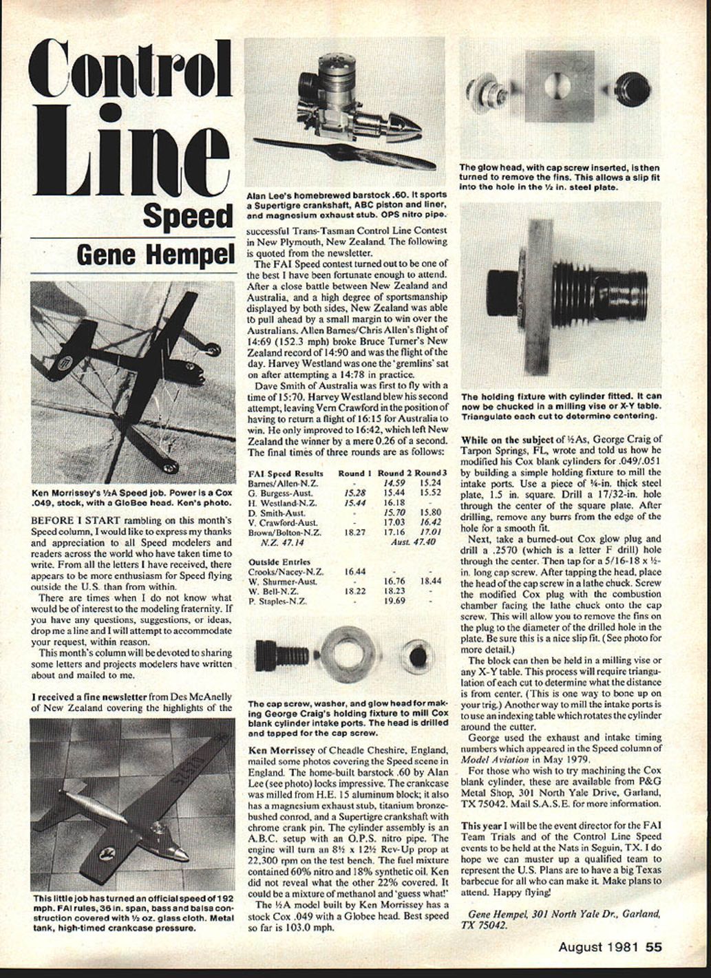Control S Inc Speed Gene Hempel BEFORE START rambling months Speed column would like express thanks appreciation Speed modelers readers across world have taken time write letters have received appears enthusiasm Speed flying outside US within times know what would interest modeling fraternity have questions suggestions ideas drop line will attempt accommodate request within reason months column will devoted sharing some letters projects modelers have written about mailed received fine newsletter Des McAnelly New Zealand coverina hiahliehts Alan Lees homebrewed barstock 60 sports Supertigre crankshaft ABC piston liner magnesium exhaust stub OPS nitro pipe successful Trans-Tasman Control Line Contest New Plymouth New Zealand following quoted newsletter FAI Speed contest turned out best have fortunate enough attend After close battle between New Zealand Australia high degree sportsmanship displayed both sides New Zealand able tb pull ahead small margin win over Australians Allen Barnes/Chris Allens flight 1469 1523 mph broke Bruce Turners New Zealand record 1490 flight day Harvey Westland gremlins sat after attempting 1478 practice Dave Smith Australia first fly time 1570 Harvey Westland blew second attempt leaving Vein Crawford position having return flight 1615 Australia win improved 1642 left New Zealand winner mere 026 second final times three rounds follows FAI Speed Results Barnes/Allen-NZ G Burgess-Aust H Westland-NZ D Smith-Aust V Crawford-Aust Brown/Bolton-NZ NZ 4714 Outside Entries Crooks/Nacey-NZ W Shurmer-Aust W BelI-NZ P Staples-NZ Round 1528 1544 1827 1644 1822 Round 2 Round 3 14591524 15441552 161815701580 17031642 17161701 Aust 4740 subject As George Craig Tarpon Springs FL wrote told us modified Cox blank cylinders 049/051 building simple holding fixture mill intake ports Use piece A-in thick steel plate 15 square Drill 17/32-in hole through center square plate After drilling remove burrs edge hole smooth fit Next take burned-out Cox glow plug drill 2570 letter F drill hole through center tap 5/16-18 x in long cap screw After tapping head place 16761844the head cap screw lathe chuck Screw 1823-the modified Cox plug combustion 1969chamber facing lathe chuck onto cap screw will allow remove fins plug diameter drilled hole plate sure nice slip fit See photo detail block can held milling vise X-Y table process will require triangu lation cut determine what distance center way bone up trig Another way mill intake ports use indexing table rotates cylinder around cutter George used exhaust intake timing numbers appeared Speed column Model Aviation May 1979 wish try machining Cox blank cylinder available P&G Metal Shop 301 North Yale Drive Garland TX 75042 Mail SASE information cap screw washer glow head mak ing George Craigs holding fixture mill Cox blank cylinder intake ports head drilled tapped cap screw Ken Morrissey Cheadle Cheshire England mailed some photos covering Speed scene England home-built barstock 60 Alan Lee see photo looks impressive crankcase wasmilledfromHE 15 aluminumblock italso has magnesium exhaust stub titanium bronzebushed conrod Supertigre crankshaft chrome crank pin cylinder assembly ABC setup OPS nitro pipe engine will turn 8 x 12 Rev-Up prop 22300 rpm test bench fuel mixture contained 60% nitro 18% synthetic oil Ken did reveal what other 22% covered could mixture methanol guess what model built Ken Morrissey has stock Cox 049 Globee head Best speed far 1030 mph year will event director FAI Team Trials Control Line Speed events held Nats Seguin TX hope can muster up qualified team represent US Plans have big Texas barbecue can make Make plans attend Happy flying Gene Hempel 301 North Yale Dr Garland TX 75042 August1981 55 glow head cap screw inserted turned remove fins allows slip fit hole l plate Ken Morrisseys 1/2A Speed job Power Cox 049 stock GloBee head Kens photo holding fixture cyilnoer fitted can now chucked milling vise XY table Triangulate cut determine centering little job hasturned official speed 192 mph FAI rules 36 span bassand balsa con struction covered 1/2 oz glass cloth Metal tank high-timed crankcase pressure