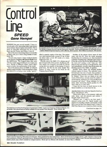Control Line SPEED Gene Hem pel DURING past several months have re ceived quite few interesting letters photos about antique Speed engines models quite enjoyable experience look back Forties Fifties love interesting letters would like share Doug Dahlke Osh kosh WI As per request have enclosed photos genuine Topping 100 Speed Model mid-Forties original plans came model suggest bolting engine have Details different engine output didnt seem bother performance model photos shows O&R 23 sideport ignition engine installed Some daring fliers might think being true racing gassie albeit popular engine time engine rated optimistically around 1/5 hp puts Out about what Cub 09 would weak single-port Fox 15 Directly above O&R 23 shown strongest mills periodthe Hornet 60 engine designed built all-out racing capable developing 1 hp good tune same model engines today would too much Topping Speed Model Another photos shows what came kit Note inside mounting brackets coil condenser etc Also included genuine Topping prop although dont believe correct Speed Model Note neat cowl venting real class act plug-in wing stab tips bright plastic undoubtedly valuable flying under blinding speed O&R 23 ignition Another photo shows finished poduct engine choice radically sweptforward gear has tons style prone generate equal amounts bounce Wheels Heliarc sharp eye warm blood have already noted rudder bottom better yet has effectively trousered tail wheel Doug indicates has other interesting Speed goodies will share us later date hope has much interest Speed modelers has Another letter about old-time Speed Les Deily Douglaston NY Dear Gene Heres few pictures odds ends ideas old pictures articles thought might interest Number want say much enjoyed seeing early CL Speed models engines May column personally would like see Old-Time Speed event class D Old-Time Speed event would likely starting 66 Model Aviation An ancient photo reproduce Xerox copy shows Pappy deBolt attempting set FAI ROW CL Speed record outh Internats Thats Speedwagon 50 kitted Dmeco deBolt Model Engineering Co McCoy 60 power Dick Wilson Lockport NY assists Thundering out thrilling days yesteryear1 946a genuineTopping 100 Speed Model Its Continued page 141 all-metal advertised being suitable power Bantam 19 Hornet 60 Heres howtheTopping 100 came out its box Note yardstick size comparison Photo left shows fuselage interior riveted-in clips forthe coil battery firewall bellcrank mount Wing stab plasticslip-intips propwas included Editors note Ihad came witha3bladed plastic prop included integral spinner Never got Ohisson 60 installed never flew RMcM cut tail loose will difficult cement joint has really hardened Once satisfactory flight characteristics obtained 20-ft launches try harder ones less bank should steeper too approaching 450 inclination Also overhand launch will work out better youll find respectable transition launch glide phase still possible little trimming spite launching right oncoming breeze rather straight witness violent stall loop peak launch add bit weight left wing tip and/or lower TE horizontal tail about 1/64 cementing tiny wedge between fuselage either case bit corrective right rudder may necessary prevent spiral dive will need miniscule Small rudder changes can facilitated dampening TE area side opposite direction TE deflected Incidentally lips become very convenient dampening tail surfaces becomes desirable fairly hard launch seems yielding nearly flawless performance go ahead try vicious hard launch trying almost purely overhead steep launch about 300 right oncoming breeze will nothing short lucky first really hard launch yields flawless flight perfect flight takes lot practice often some fine-trimming rudder de flections tiny nearly invisible following as-hard-as-you-pos sibly-can launches glider just seems stall modestly try bending TE horizontal tail up bit will cause glider keep right screaming Immelmann sort launch slipping right rather stalling end have found near-overhand launch yields consistency prime prerequisite flying competi tion Speaking competition nearly im possible compete effectively sort threat cant put glider thermal balmy air official flight Learn become aware presence thermal almost certainly hand note tiny rise temperature calm spell breezy day want avoid thermals youll find boomers mighty scarce two hours daylight remain day Well happy thermal chasing keep em flyinRain Crows CL Speed/Hempel Continued page 66 point class would limited engine side-exhaust McCoy 60 really engine used class D Speed during late Forties Fifties early Sixties Also included photo Harold deBolt attempting FAI rise-otT-water speed record Plymouth Internats Hal used McCoy 60 power Keep up good work Nor AVIONIUS INC ACCUETACH 1 LCITAL2 FULL2 QUICK YoU get contIfluOiDete theMONITOR TACHOME VOLTMEateof afely peak terY ate RPM accurruchar orarge bY dual scale 1cycleMakes 055ible Idlme oUt select topend adjuS nt baeri Check ort pack fast ch vOW outl withwa ching tiny built~J5t TXR age drop 5ignals 131ty iOX capa Quali preci tery combo5full charge ty sion electronic ORDER YOURS NOW 79 Plaid Send check money order no CODs NorCai AVIONiCS Inc PO Box 70956 sunnyvale CA 94086 California residents add 60/0 tax Add $300 shipping outside continental USA Dealer Inquiries invited would like thank person took time write concerning Old Time Speed Keep cards letters photographs coming Gene Hempel 301 N Yale Dr Garlan4 TX 75042 APPLIED DESIGN CORPORATION 738 Penn Si El Segundo CA N245 MINI w SANDER ADJUSTABLE TENSION HAND BELT SAIIDER FIRMLY HOLDS PAPER FOR EASIER SANDING Padded Rats nod carves Handy Neld MINI-STRIPSPIIECISION DIE-CUT Medwm Garnet SAVES TIME $135 REPLACEMENT Fine Garnet AND EFFDRT SANDING BELTS Assid Waler Proof TEE ALUMINUM EXTRUSION SANDING BLOCK Icr use RUFF-STUFF SoIt-adlieelee maod paper Laree Tree Serface WeeiWeeroet illech 04 y Uu 22 inch RUFF 6 STUFF SELF ADHESIVE SHEET SANDPAPER MAKE YOUR OWN SPECIAL SANDING SHAMS drylog e Medi