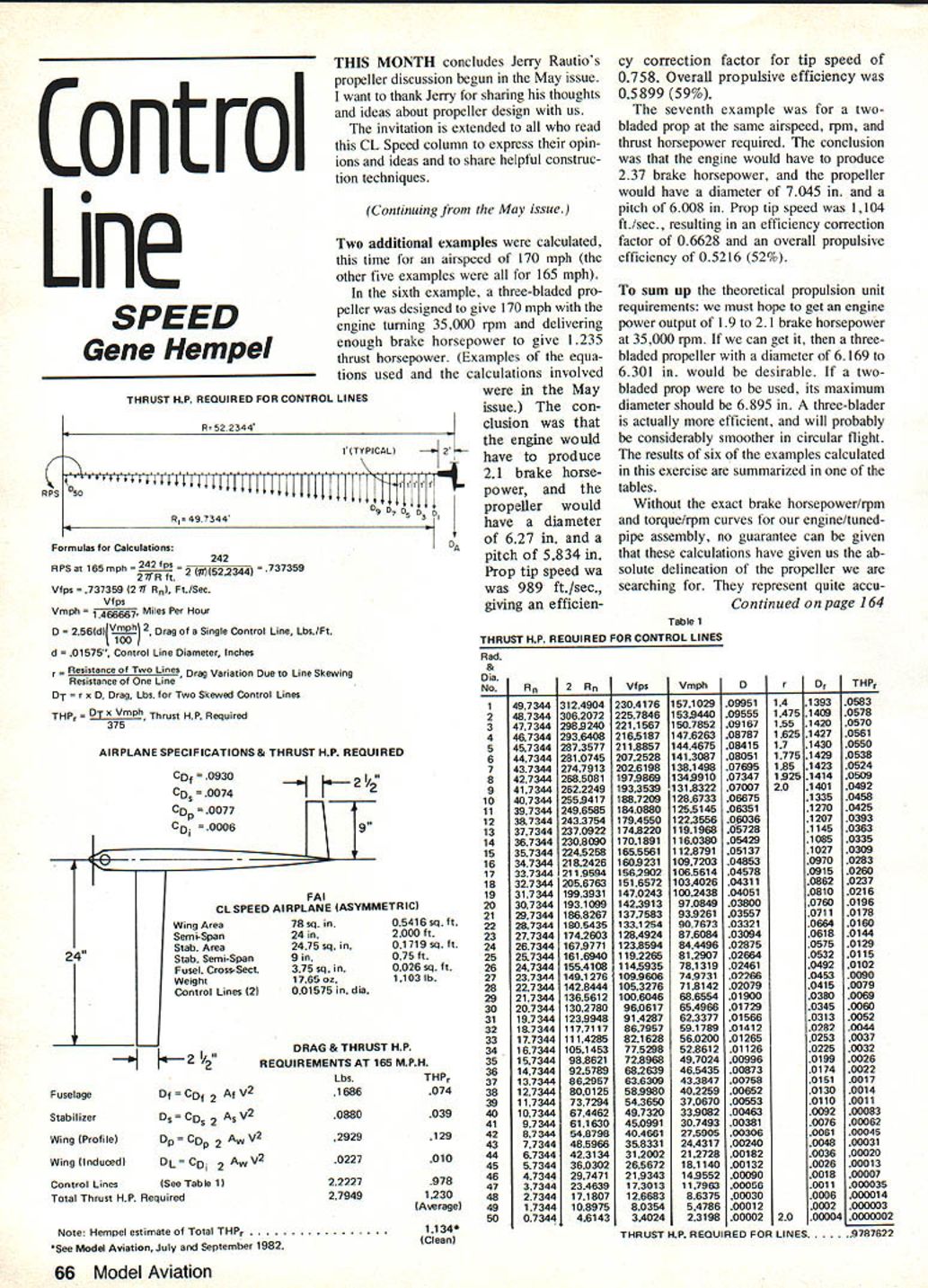 Control Line SPEED Gene Hem pet THIS MONTH concludes Jerry Rautlos propeller discussion begun May issue want thank Jerry sharing thoughts ideas about propeller design us invitation extended read CL Speed column express opin ions ideas share helpful construc tion techniques Continuing May issue Two additional examples calculated time airspeed 170 mph other five examples 165 mph sixth example three-bladed pro peller designed give 170 mph engine turning 35000 rpm delivering enough brake horsepower give 1235 thrust horsepower Examples equa tions used calculations involved THRUST HP REQUIRED FOR CONTROL LINES C RPS Formulas Calculations RPS 165 mph 242 fP5217 522344 59 2 ST Rn Ft/Sec Vfps Vmph 667 Miles Per Hour D l Vmphl 2 Drag Single Control Line Lbs/Ft 1001 d 5 Control Line Diameter Inches Resistance Two Lines Drag Variation Due Line Skewing Resistance Line DT D Drag Lbs Two Skewed Control Lines THP — DT x Vmph Thrust HP Required 375 May issue con clusion engine would have produce 21 brake horse power propeller would have diameter 627 pitch 5834 Prop tip speed wa 989 ft/sec giving efficien cy correction factor tip speed 0758 Overall propulsive efficiency 05 899 59% seventh example two bladed prop same airspeed rpm thrust horsepower required conclusion engine would have produce 237 brake horsepower propeller would have diameter 7045 pitch 6008 Prop tip speed 1104 ft/sec resulting efficiency correction factor 06628 overall propulsive efficiency 052 16 52% sum up theoretical propulsion unit requirements must hope get engine power output 19 21 brake horsepower 35000 rpm can get three bladed propeller diameter 6169 6301 would desirable two bladed prop used its maximum diameter should 6895 three-blader actually efficient will probably considerably smoother circular flight results six examples calculated exercise summarized tables Without exact brake horsepower/rpm torque/rpm curves engine/tunedpipe assembly no guarantee can given calculations have given us ab solute delineation propeller searching represent quite accu Continued page 164 Table 1 THRUST HP REQUIRED FOR CONTROL LINES Red & Die No AIRPLANE SPECIFICATIONS & THRUST HP REQUIRED CDf CD CDp0077 CD F uselage Stabilizer CL SPEED AIRPLANE ASVMMETRIC Wing Area78 sq in05416 sq ft Semi-Span24 in2000 ft Stab Area2475 sq in01 719 sq ft Stab Semi-Spen9 in075 ft Fuse CrossSect375 sq in0026 sq ft Weight1765 oz1103 lb Control Lines 2001575 die DRAG & THRUST HP REQUIREMENTS AT 165 MPH LbsTHPr 1686074 0880 2929 0227 22227 27949 039 129 010 978 1230 Average 11 34 Clean Df 2 Af V2 Ds CD5 2 A5V2 Wing ProfileDp 2 Aw V2 Wing InducedDL CDl 2 AwV2 Control LinesSee Table 1 Total Thrust HP Required Note Hempel estimate Total THPr See Model Aviation July September 1982 10 11 12 13 14 15 16 17 18 19 20 21 22 23 24 25 26 27 28 29 30 31 32 33 34 35 36 37 38 39 40 41 42 43 44 45 46 47 44 49 50 497344 487344 477344 467344 457344 447344 437344 427344 417344 407344 397344 387344 377344 367344 357344 347344 337344 327344 317344 307344 297344 287344 277344 267344 257344 247344 237344 227344 217344 207344 197 344 187344 177344 167344 157344 147344 137344 127344 117344 10 7344 97344 87344 77344 67344 57344 47 344 37344 27344 07344 2 Rn 3124904 3062072 2989240 2936408 2873577 2810745 2747913 2685081 2622249 2559417 2496585 2433754 2370922 2308090 2245258 2182426 2119594 2056783 1993931 1931099 1868267 1805435 1742803 1879771 1616940 1554108 1491 276 1428444 13658 12 1302780 1239948 1177117 1114285 1051 453 988621 925789 862957 800125 737294 674462 611 630 548798 485966 423 134 360302 297471 234639 171807 108975 46143 VfpsVmphDrDrTHPr 23041761571029099511413930583 2257846153944009555147514090578 221156715078520916715514200570 2165187147626308787182514270561 21188571444675004151714300550 2072528141308708051177514290538 202619813814980769518514230524 1979869134991007347192514140509 19335391318322070072014010492 166720912867330667513350458 184088012551450635112700425 17945501223556003612070393 174822011919680572811450363 170189111603800542910850335 165556111287910513710270309 160923110972030485309700283 156290210656140457809150260 151657210340260431108620237 147024310024380405108100216 14239139708490380007800196 13775839392610355707110178 13312549076730332106640180 12849248760840309406180144 12385948444960287505750129 11922658129070266405320115 11459357813190246104920102 10996067497310226604530090 10532767181420207904150079 10060466665540190003800069 9606176549660172903450080 9142876233770156603130052 8679575917890141202820044 8216285602000126502530037 7752985286120112602250032 7289664970240099601990026 6826394654350087301740022 6363094338470075801510017 5899804022590065201300014 5436503706700055301100011 49732033908200463009200083 45099130749300381007600062 40466127590500306006100045 35833124431700240004800031 31200221272800182003600020 26567218114000132002600013 21934314955200090001800007 173013117963000560011000035 12666386375000300006000014 8035454786000120002000003 34024231980000220000040000002 THRUST HP REQUIRED FOR LINES9787622 66 Model Aviation R 522344- 1I 50 R 497344p95705 O3D1 performance certainly strengthens frontal area pan considerably California Racing under adverse condi tions just received photograph Cal ifornia showing Bob Kerr just turned new WAM record time 50001 using muffler-equipped Rat Racer Mufflers required WAM rules picture can sec muffler protruding out area mini-pipe usually exits addi tion can see racing circles over lap speed bump parking lot guess can say racing under ad verse conditions' comments suggestions al ways appreciated John C Ballard 10102 Kimblewick Dr Louisville KY 40223 CL Speed/Hempel Continued page 66 rately however propellers required particular assumed brake horsepower rpm speed thrust horsepower required standard sea level atmospheric conditions study summaries points out tiny changes diameter pitch affect power requirement speed course propellers must have true helical pitch least 30%-radius point blade tips pitch/diameter 