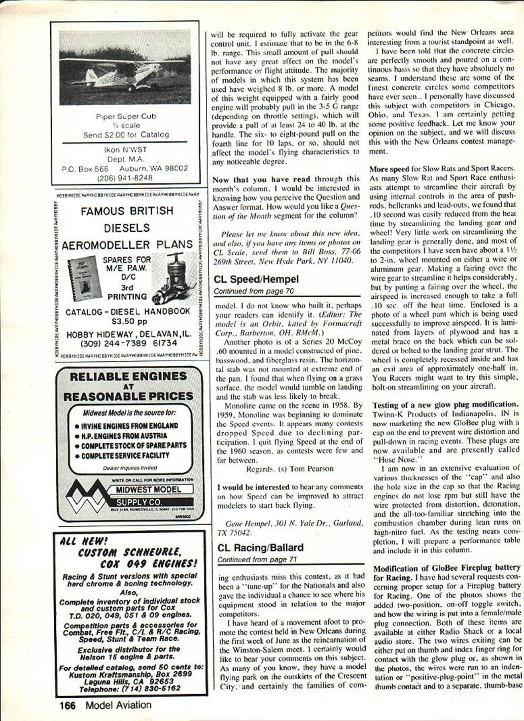 Control Line SPEED Gene Hem pel MY FIRST order business month will mention several organizations per taining Control Line speed monthly newsletter Gazette edited Laird Jackson will incorporated new organization called National Control Line Coalition developing organization intended provide representative body Con trol Line modelers intent provide means modelers have ability speak voice authority AMA other group pertaining Control Line matters interest Gazette has international audience needs new subscribers cover printing cost Write support Coalition concept refuse accept Control Line dead join mail $10 year Laird Jackson 2322 Wilson Ave Bristol PA 19007 Outside US sub scription rate $15/year Another new organization North American Speed Society newsletter Speed Times contains lots information concerning Speed-related items Membership dues $15 Open $10 Senior $7 Junior members NASS members will receive membership card three NASS decals name tag quarterly newsletter information mail SASE Chris Sackett Box 82294 British Columbia Canada V5C 5P7 received following letter Tom Pearson about some rare photos Speed engines models Dear Gene Got camera loaded B&W take some photos rare engines models last week photo rather rare Fox 29R 1956-57 era engine second version finned single-plug head first version twin-plug non-finned head fastest 29 its time until Fox 29X came onto scene spelled end Dooling McCoy 29 B Speed en gines next series photos McCoy 49 Speed model dating about 1947 Note ignition 49 complete Burgess bat tery pack also adjustable-pitch Air-O single-blade prop commercial development prop used two Cali fornians Hornet 60 Speed model 1946 set Open D speed record airplane itself rather unique molded some sort bakelite impregnated paper good flying Continued page 166 bits nostalgia can get photo McCoy 49 ignition look Burgess 2Z2P1 dry cell battery hiding fuelageaiso long turn-to-tighten McCoy spark advance lever Air-O single-blade adjustable-pitch propi plane infamous all-plastic Orbit kit 1947 vintage photos Tom Pearson 70 Model Aviation History Tom Pearson sends photo old Series 20 McCoy 60-powered 0 Speed model Ship features metal pan remainder combination pine bass fiberglass Fox 29R appeared scene its level performance doomed McCoy Dooling 29s Look bathtub air intake rear-mounted needle valve Need say use pressurized fuel system HO YAT AWAYHO 845100 AWAYIlO SASH ID WAYHO BAYHIDE AWAY FAMOUS BRITISH DIESELS MODELLER PLANS SPARES FOR M/E PAW 0/C 3rd PRINTING CATALOG-DIESEL HANDBOOK pp HOBBY HIDE WAY DELAVANIL 309 244-7389 61734 HOBBY5 IOEAWAYHOBBYH IDEAWAYHOBBYHIDEAWAYHOBBOHIOEOW will required fully activate gear control unit estimate 6-8 lb range small amount pull should have grcat affect models performance flight attitude majority models system has used have weighed 8 lb model weight equipped fairly good engine will probably pull 3-5 G range depending throttle setting will provide pull least 24 40 lb handle six- eight-pound pull fourth line 10 laps should affect models flying characteristics noticeable degree Now have read through months column would interested knowing perceive Question Answer format would like Ques non Mont/i segment column Please let know about new idea also have anx items photos CL Scale send Bill Boss 77-06 269th Street New Hyde Park NY 11040 CL Speed/Hempel Continued paoe 70 model know built perhaps readers can identify Editor nodel Orbit kitted Formacraft Corp. Barbertoi OH RMM Another photo Series 20 McCoy 60 mounted model constructed pine basswood fiberelass resin horizon tal stab mounted extreme end pan found flying grass surface model would tumble landing stab less likely break Monoline came scene 1958 1959 Monoline beginning dominate Speed events appears contests dropped Speed due declining par ticipation quit flying Speed end 1960 season contests few far between Regards s Tom Pearson would interested hear comments Speed can improved attract modelers start back flying Gene Hempel 301 N Yale Dr Garland TX 75042 CL Racing/Ballard Continued page 71 ing enthusiasts miss contest tune-up Nationals also gave individual chance see equipment stood relation major competitors have heard movement afoot pro mote contest held New Orleans during first week June reincarnation Winston-Salem meet certainly would like bear comments subject As know have model flying park outskirts Crescent City certainly families com petitors would find New Orleans area interesting tourist standpoint well have told concrete circles perfectly smooth poured con tinuous basis 50 have absolutely no seams understand some finest concrete circles some competitors have ever seen. personally have discussed subject competitors Chicago Ohio Texas am certainly getting some positive feedback Let know opinion subject will discuss New Orleans contest manage ment speed Slow Rats Sport Racers As Slow Rat Sport Race enthusi asts attempt streamline aircraft using internal controls area push rods belleranks lead-outs found lO second easily reduced heat time streamlining landing gear wheel Very little work streamlining landing gear generally done competitors have seen have about 1 /2 2-in wheel mounted either wire aluminum gear Making fairing over wire gear streamline helps considerably putting fairing over wheel airspeed increased enough take full 10 sec off heat time Enclosed photo wheel pant being used successfully improve airspeed lami nated layers plywood has metal brace back can sol dered bolted landing gear strut wheel completely recessed inside has exit area approximately one-half Racers might want try simple bolt-on streamlining aircraft Testing new glow plug modification Twinn-K Products Indianapolis IN now marketing new GloBee plug cap end prevent wire distortion pull-down racing events plugs now available presently called Hose Nose am now extensive evaluation various thicknesses cap also hole size cap Racing engines lose rpm still have wire protected distortion detonation all-too-familiar stretching