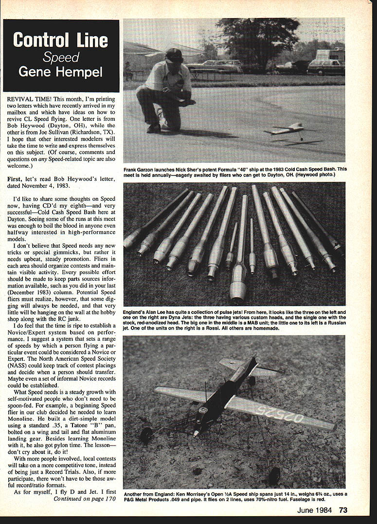 REVIVAL TIME month Im printing two letters have recently arrived mailbox have ideas revive CL Speed flying letter Bob Heywood Dayton OH other Joe Sullivan Richardson TX hope other interested modelers will take time write express themselves subject course comments questions Speed-related topic also welcome First lets read Bob Heywoods letter dated November 4 1983 Id like share some thoughts Speed now having CDd eighthand very successfulCold Cash Speed Bash Dayton Seeing some runs meet enough boil blood anyone halfway interested high-performance models dont believe Speed needs new tricks special gimmicks rather needs upbeat steady promotion Fliers area should organize contests main tain visible activity possible effort should made keep parts sources infor mation available such did last December 1983 column Potential Speed fliers must realize however some dig ging will always needed very little will hanging wall hobby shop along RC junk feel time ripe establish Novice/Expert system based perfor mance suggest system sets range speeds person flying par ticular event could considered Novice Expert North American Speed Society NASS could keep track contest placings decide person should transfer Maybe set informal Novice records could established What Speed needs steady growth self-motivated people dont need spoon-fed example beginning Speed flier club decided needed learn Monoline built dirt-simple model using standard 35 Tatone B pan bolted wing tail flat aluminum landing gear Besides learning Monoline also got pylon time lesson dont cry about it people involved local contests will take competitive tone instead being just Record Trials Also participate wont have aw ful record/ratio formats As myself fly D Jet first Continued page 170 June 1984 73 Frank Garzon launches Nick Shers potent Formula 40 ship 1983 Cold Cash Speed Bash meet held annuallyeagerly awaited fliers can get Dayton OH Heywood photo Englands Alan Lee has quite collection pulse jets looks like three left right Dyna Jets three having various custom heads single stock red-anodized head big middle MAB unit little its left Russian jet units right Rossi others homemade Another England Ken Morriseys Open 1IA Speed ship spans just 14 weighs 6 oz uses P&G Metal Products 049 pipe flies 2 lines uses 70%-nitro fuel Fuselage red Matcneo rerTormance ysrem TOP PERFORMANCE CAB ENGINES 16 Airplane 4 Marine KAB FUELSCAB GLOW PLUGS 7 Blends4 choices Matched Finish System BEST APPEARANCE CAB FIBERGLASS CLOTH K&B Micro-Balloons FILLER CAB SUPER FOXY RESIN CAB SUPER FOXY THINNER CAB SUPER POXY PRIMER KAB SUPER POXY PAINT KAB MIXING CUPS 4 II AU ELI II 4-4 very completeconstruction balsa kit Simple gets air fast Easy fly flight perfor out sight Requires r- engine 4 ch radio Ask dealer writ 4- RICKSKlTSformoreinformationI 5 4 L II RICKS KITSP0 BoxilOS SanteeCA92071 CL Racing/Ballard Continued page 168 vides easily-built model easily flown someone virtually skill level pilot things can built minimal investment either ma terials time performance level restricted engines very reasonable around 17 seconds slower would fear model allowed given signif icant horsepower Any change must accompanied decrease available horsepower Thats end Bill Lees letter Northwest Regionals coming Winston-Salem NC AAAA Control Line Meet highlights racing season Midwest area Northwest colleagues have developed type nual contest Eugene OR Annual Northwest Regional Control Line Cham pionships over Memorial Day weekend May 26-27 1984 will feature Racing events Certainly possible should included competition calendar information write Contest Direc tor John Thompson 1411 Bryant Avenue Cottage Grove OR 97424 As always comments appreci ated John C Ballard 10102 Kimblewick Dr Louisville KY 40223 CL Speed/Hempel Continued page 73 started Speed 1967 ex-Roselle McCoy 64 ship Harry Roe Jerry Roselle Jack Frye Warren Gregory helped learn never really have threat national competition flying fast planes being handle-end thun dering 65 perhaps biggest modeling thrill other letter Joe Sullivan dated September 10 1983 just read column September 1983 MA asked ideas re kindle interest Speed feeling decline Speed came two phases first largest decline started advent Monoline second came use tuned pipes Let pause say started flying U-Control 1949 flew actively until 1961 have dabbled itsince however try stay current what going Yes know advantages Monoline lets look some disadvan tages 1 cannot use relatively-easy-to-find two-line hardware 2 requires expertise install Monoline control unit properly 3 Monoline handles costly difficult maintain two-line handles 4 flying line requires expertise make 5 Monoline cannot use fuel shutoff plane Think about engines have burned down lean runs 6 Two-line flying will slow planes down making easier fly fast can get around pylon probably too classes proposals follow class logical step up performance ladder proposals new Speed system I Allow two-line systems no grouped lines permitted Minimum line sep arations would cc 40 cu II Suction fuel systems Fuel shutoff suggested 35cc 40 cu classes required III Classes A A35-ft lines 1 Proto Mouse rules planes timed release completion 12 laps 2 Proto Speed Same Proto timed six laps flying start 3 Speed Full Speed ship no pipes B 3Scc60-ft lines 1 Proto Timed release plane completion 14 laps a Fixed 2-wheel gear using commercial 2-in wheels b Minimum wing area 125-150 sq c Minimum weight heavy enough easily ob tainable average modeler resort use exotic materials 2 Proto Speed Same Proto B above except time seven laps flying start 3Speed Full Speed plane C 40 cu in60-ft lines 1 Proto Same Bl above using Rat rules planes a Same B1a above bMinimumwingarea 150-200 sq c Minimum weight Use same concept B 1 c above 2 Proto Speed 3 Speed Well people Theyve shotsnow its time take couple swipes subject Remember speed natural eventjust like foot races Indy 500 NASCAR Super Stock etc rules right help promote interest participation Speed 
