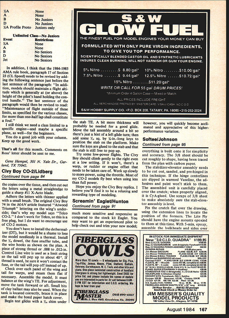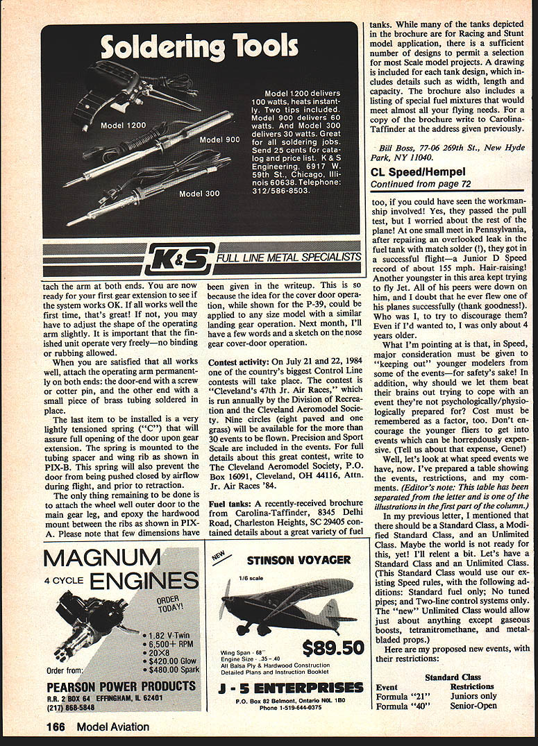 Control Line Event Speed Gene Hem pel REVIVAL TIMEPart II last Speed column July 1984 really generated quite bit interest fact much didnt realize people concerned about changing Speed rules number suggestions presented have merit submitted rules proposals upcoming rules cy / N Todays AMA CL Speed Events EngineRestrictionComments AOOOO-0504NoneNone AQ505-1525NoneNone B1526-3051NoneShould noJuniors D3052-65OpenShould Open Srs allowed ProfileOOOQ-0504Juniors onlyGood Proto ProfileOOOQ-0504Seniors onlyNone Proto Prov Formula 210900-2135Juniors onlyGreat ProvRemove Prov status Formula2800-4028Sr-Op onlyFine Jettail pipe area NoneShould no Juniors Gene features readers write-In comments Speed month table let ter gives writers comments existing AMA CL Speed events see CL modeling real CL flying Cox Testors plastic toys must dedicated individuals can get ball rolling Speed flying someone loves level experi ence/expertise such can re source person tyros noise prob lem will have addressed well never get close-in flying sites Remember what said about four-stroke Speed events Now brief examination Speed otherevents AMA compe tition ever long string spaghetti approach has taken various events take event snip Junior Senior Open Never mind what event just take 0 easy way out far age-groups go Lately however has glimmer understanding always good thing Formula 21 AA Profile Proto Formula 40 D Speed example looking past example can see ability get whole act together varies tremendously age consideration must given competition events/classes being finalized Years ago 1952 couple younger friends Speed builder/pilot other trusted assistant As Juniors trying compete D Speed Dool ing 61-powered Hell Razor Most time could never get startedor did could get running well enough complete successful launch hand first lap just well Continued page 166 new twist locking takeoff doilies As plane lifts off ground doily goes until outrigger can rotate far enough unlatch fuselage hooks Neat 4-OtO5 14-/M6 cle interesting letters writ ten Ross McMullen Silver Spring MD letter reads follows OK Hempel asked again Heres another double-barrelled blast about Speed non-Speed flier h, always wanted last letter subject June 24 1983 some thoughts what would take revive Speed general thinking still about same what will take revive Speed First priority get flying sitesand ones near civilization people can 7% C7/6 /4L5 //K5 CAfl - 2 Model Aviation Heres new hA connecting-red-reset tool kit Davis Diesel Development 25 Usher St Milford CT 06460 Primarily Cox engines consists con rod retainer reset tool L cylinder devarnishing brush C piston-holder fixture R Competi tors hA event need kits tach arm both ends now ready first gear extension see system works OK works well first time thats great may have adjust shape operating arm slightly important fin ished unit operate very freelyno binding rubbing allowed satisfied works well attach operating arm permanent ly both ends door-end screw cotter pin other end small piece brass tubing soldered place last item installed very lightly tensioned spring C will assure full opening door upon gear extension spring mounted tubing spacer wing rib shown PIX-B spring will also prevent door being pushed closed airflow during flight prior retraction thing remaining done attach wheel well outer door main gear leg epoxy hardwood mount between ribs shown PIX Please note few dimensions have given writeup because idea cover door opera tion shown P-39 could applied size model similar landing gear operation Next month Ill have few words sketch nose gear cover-door operation Contest activity July 21 22 1984 countrys biggest Control Line contests will take place contest Clevelands 47th Jr Air Races run annually Division Recrea tion Cleveland Aeromodel Socie ty Nine circles eight paved grass will available 30 events flown Precision Sport Scale included events full details about great contest write Cleveland Aeromodel Society PO Box 16091 Cleveland OH l16 Attn Jr Air Races 84 Fuel tanks recently-received brochure Carolina-Taffinder 8345 Delhi Road Charleston Heights SC 29405 conmined details about great variety fuel STINSON VOYAGER Wing Span 68 Engine Size 35 40 Balsa Ply & Hardwood Construction Detailed Plans Instruction Booklet 3-5 ENTERPRISES 0 Box 82 Belmont Ontario NOL 180 Phone 1 519-6444375 tanks tanks depicted brochure Racing Stunt model application sufficient number designs permit selection Scale model projects drawing included tank design cludes details such width length capacity brochure also includes listing special fuel mixtures would meet almost flying needs copy brochure write Carolina Taffinder address given previously Bill Boss 77-06 269th St New Hyde Park NY 11040 CL SpeedIHem psi Continued page 72 too could have seen workman ship involved Yes passed pull test worried about rest plane small meet Pennsylvania after repairing overlooked leak fuel tank match solder successful flighta Junior D Speed record about 155 mph Hair-raising Another youngster area kept trying fly Jet peers down him doubt ever flew planes successfully thank goodness try discourage Id wanted about 4 years older What Im pointing Speed major consideration must given keeping out younger modelers some eventsfor safetys sake addition should let beat brains out trying cope event theyre psychologically/physio logically prepared Cost must remembered factor too Dont en courage younger fliers get events can horrepdously expen sive Tell us about expense Gene Well lets look what speed events have now Ive prepared table showing events restrictions com ments Editors note table has separated letter illustrations first part column previous letter mentioned should Standard Class Modi fied Standard Class Unlimited Class Maybe world ready yet Ill relent bit Lets have Standard Class Unlimited Class Standard Class would use ex isting Speed rules following ad ditions Standard fuel No tuned pipes Two-line control systems new Unlimited Class would allow jus