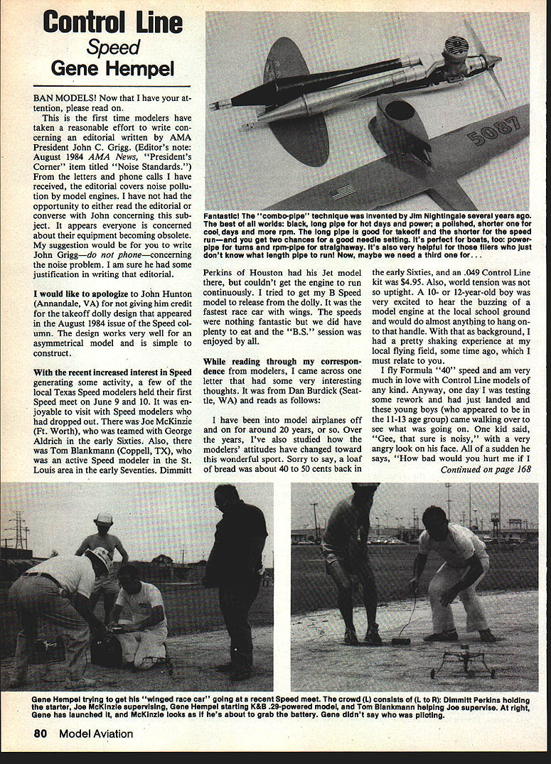 Contml Line Speed Gene Hem pel BAN MODELS Now have tention please read first time modelers have taken reasonable effort write con cerning editorial written AMA President John C Grigg Editors note August 1984 AMA News Presidents Corner item titled Noise Standards letters phone calls have received editorial covers noise pollu tion model engines have opportunity either read editorial converse John concerning sub ject appears everyone concerned about equipment becoming obsolete suggestion would write John Griggdo phoneconcerning noise problem am sure some justification writing editorial would like apologize John Hunton Annandale VA giving him credit takeoff dolly design appeared August 1984 issue Speed col umn design works very well asymmetrical model simple construct recent increased interest Speed generating some activity few local Texas Speed modelers held first Speed meet June 9 10 en joyable visit Speed modelers dropped out Joe McKinzie Ft Worth teamed George Aldrich early Sixties Also Tom Blankmann Coppell TX active Speed modeler St Louis area early Seventies Dimmitt Perkins Houston Jet model couldnt get engine run continuously tried get B Speed model release dolly fastest race car wings speeds nothing fantastic did have plenty eat BS session enjoyed reading through correspon dence modelers came across letter some very interesting thoughts Dan Burdick Seat tle WA reads follows have model airplanes off around 20 years Over years Ive also studied modelers attitudes have changed toward wonderful sport Sorry say loaf bread about 40 50 cents back early Sixties 049 Control Line kit $495 Also world tension uptight 10- 12-year-old boy very excited hear buzzing model engine local school ground would almost anytling hang handle background pretty shaking experience local flying field some time ago must relate fly Formula 40 speed am very much love Control Line models kind Anyway day testing some rework just landed young boys appeared 11-13 age group came walking over see what going kid said Gee sure noisy very angry look face sudden says bad would hurt Continued page 168 Gene Hempel trying get Winged race car going recent Speea meet inc crowa U Consists U R Dimmift Perkins holding starter Jo McKinzie supervising Gene Hempel starting K&B 29-powered model Tom Blankmann helping Joe supervise right Gene has launched McKlnzie looks hes about grab battery Gene didnt say piloting 80 Model Aviation iantastIcl Inc nnique inventea DY Jim gntingaie sever Tears ago best worlds black long pipe hot days power polished shorter cool days rpm long pipe good takeoff shorter speed runand get two chances good needle setting its perfect boats too powerpipe turns rpm-pipe straighaway its also very helpful filers just dont know what length pipe runi Now maybe need third for. mymEET PIXr BREAK THE 2-METER PERFORMANCE BARRIER LIGHTWEIGHTSOLID CORE CONSTRUCTIONEPPLER 214 AIRFOIL AILERONS80 OTGREE FLAPS elevator compensatorWINOSONG STYLE FUSELAGECLEAN QUIET SNOOTHTRAC KING AND EFFICIENT Pixy peer multi-task thermal competition pure myna mite fly v slope thermal aerobatic displays will make heart stop 1 hr VHS VIDEO TAPE showing OUR PLANES IN ACTION CONTROL TEMS LINKAGES APPLICATION FIBERGLASS FIN/TURTLE-DECK ano H WING BUILDING SEQUENCE Send $25 $20 deposit/$5 ship/hanaling 2 stamps complete catalog f mar multichannel ghders giving specifications - armance control configurations construction kit/parts price list induong $19995NEW Camano 100 $15995 BR ND NEW Pisy $14995 OBSON DESIGNS SW Cainano Drive Camano Island WA 98292 plane system no RF signal used transmitted series en coded electrical pulses sent up lines model article will detailing step-by-step construction system units rather will give overview put together operates will have assume anyone tempting project either familiar electronic component wiring use printed circuit boards knows someone does can help accompanying schematics show wiring encoder decoder units four types input circuitry used Clancy P-38 shown accompa nying photo first input th en coder Pin-l represented R-l 5K pot used fully-proportional control desired could models throttle control operating cooler doors etc S-2 SPDT switch arrange ment Input 2 used desire set fixed position item after its operation such flaps 5-2 position shown schematic flaps would up adjustment R-2 5K pot used define posi tion 5-2 operated its other position flaps down position determined adjusting R-3 5K pot third input Pin 3 controlled set fixed resistors S-3 singlepole push-button switch used Clancy operating brakes case operation 5-3 used applying brakes open position allows servo return fixed position leases brakes final fourth input shown 5-4 single-pole three-position rotary-type switch used combination fixed resistors R-7 R-9 1K pot R-8 operating landing gear landing lights schematic shows S-4 posi tion would have landing gear fully retracted center position allows landing gear operate fulldown position point retract servo has traveled something less its full travel point servo travel controlled R-l pot adjustment 5-4 operated its third position left schematic retract servo allowed move its maximum travel point used trip switch turns planes landing lights inputs shown examples types can used en coder can design own inputs long voltage-divider circuit least 5000 ohms between Pin 15 regu lated lts Pin 8 return side battery provides volts input pins number through seven encoder parts required construc tion system generally available electronic parts supply shops fixed resistors /4-watt size pots R-l 2 3 8 miniature size have adjusting shafts R-l 14 can PC printed circuit type capacitors ceramic type need have voltage ratings much higher 12 volts decide build system will need printed circuit board about four-inch square two 16-pin chip sockets some light hookup wire switches activate encoder inputs functions wish perform model case Clancys system en coder parts mounted piece PC board measuring 1 x 15 inches mounted inside 