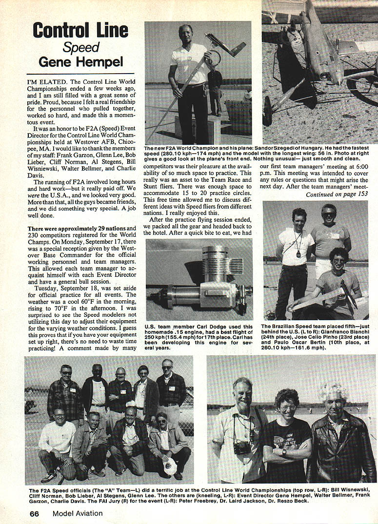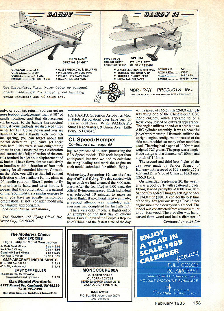 Contml Line Speed Gene Hem pel IM ELATED Control Line World Championships ended few weeks ago am still filled great sense pride Proud because felt real friendship personnel pulled together worked hard made momen tous event honor F2A Speed Event Director Control Line World Cham pionships held Westover AFB Chicopee MA would like thank members staff Frank Garzon Glenn Lee Bob Lieber Cliff Norman Al Stegens Bill Wisniewski Walter Belimer Charlie Davis running F2A involved long hours hard workbut really paid off USA looked very good guys became friends did something very special job well done approximately 29 nations 230 competitors registered World Champs Monday September 17 special reception given Westover Base Commander official working personnel team managers allowed team manager ac quaint himself Event Director have general bull session Tuesday September 18 set aside official practice events weather cool 600F morning rising 700F afternoon surprised see Speed modelers utilizing day adjust equipment varying weather conditions guess proves have equipment set up right theres no need waste time practicing comment made F2A Speed officials TeamL did terrific job Control Line World Championships top row L-R Bill Wisnewaki Cliff Norman Bob Lieber Al Stegens Glenn Lee others kneeling L-R Event Director Gene Hempel Walter Beilmer Frank Garzon Charlie Davis FAI Jury R event L-R Peter Freebrey Dr Laird Jackson Dr Reszo Beck 66Model Aviation new F2A World ampion plane Sandorszege. 3f Hungary He astest speed 28010 kph1 74 mph model longest wing 56 Photo right gives good look planes front end Nothing unusual just smooth clean competitors pleasure avail- first team managers meeting 600 ability much space practice pm meeting intended cover really asset Team Race rules questions might arise Stunt fliers enough space next day After team managers meetaccommodate 15 20 practice circles Continued page 153 free time allowed discuss dif ferent ideas Speed fliers different nations really enjoyed After practice flying session ended packed gear headed back hotel After quick bite eat US team member Carl Dodge used homemade 15 engine best flight 250 kph 1554mph fori 7th place Carl has developing engine sev eral years Brazilian Speed team placed fifthjust behind US L R Glanfranco Bianchi 24th place Jose Cello Plnho 23rd place Paulo Oscar Bertin 10th place 26010 kph1616 mph S RETAIL $22Oin SPECIAL S14O WINGSPAN 68* GLASS FUSE/COWL & BELLYPANWINGSPAN64 WING AIlEA700* PRECISION FOAM CORE WINOWING AfiEA1320 WEIGHT 7-BUS* PRESENT T-6 ALUM GEARWEIGHT9-95 LBS 1143114390-120 4cyc* BALSA TAIL SURFACESENGINE90-120 4cyo Use IasterCard Visa 4oney Order personal check Add 1350 shipping handlingNOR RAY PRODUCTS INC 5008 OAtH BEACH RH WICHITA FALLHTEX 76310 / 8176924675 Texas 1esidents add 5 sales tax ody tax return can get nowith speed 1665mph 2680 kph nore leadout displacement 90 ofp5 PAMPA Precision Aerobatics Mod-was using Chinese-built CSG iandle rotation displacementel Pilots Association dues have in-25cc engines appeared rill equal handle line-spacingcreased $15/year Write PAMPA ProRossi copy based outward appearance [hus leadouts displaced threeStunt Headquarters 9 Union Ave LittleThe engine utilizes sand-cast case nches full Up Down areFe NJ 07643ABC cylinder assembly beautiful lanning use handle two-inchjob workmanship model utilized inc spacing can forget about dupright engine configuration instead ontrol deflection cant getCLHem peside mount other modelers rom exercise enlighteningContinued page 66used wing span 1100mm measured Celebrationing proceeded start processing theweighed 525 grams prop single Lnd learned full deflection con-F2A Speed models took longer thanblade design diameter 160mm rols resulted leadout displacement ofanticipated because calculatea pitch 145mm es have flown almost exclusivelythe wing loading mark engine second third best flights rn handles within fraction four-incheach model submitted official flyingday made Sandor Szegedi pacing recorded history Consult-Hungary speed 1658 mph 2668 ng table will see full controlWednesday September 19 firstkph Ding Yibo China 1653 mph leflection will available plane atday official flying day started with2660 kph 100 handle rotation Since prefer flyfog thick cancel 800 am Thursday September 20 weath vith primarily hand wrist inputs itstart After fog lifted 900 am theer cool 680F scattered clouds ppears combination naturalofficial fi commenced individualFlying started promptly 800 am might try similar exercise towas scheduled 10 minutes male anSandor Szegedi Hungary setting pace ee have equally harmoniousofficialflight Ifnoofficial flightwas madeat 174Omph280lokphforthebesttime onibination consider modifyinga second attempt scheduled afterof day Szegedi using Rossi 25 cc tour handle appropriatelyeveryone completed first attemptengine mounted sideways model continued next month 17 official flights out ofmodel constructed wood similar 37 attempts first day officialto basswood propeller handTed Fancher 158 Flying Cloud Isleflying Gao Guojun Peoples Repub-carved wood diameter oster City CA 94409lic China fastest time dayContinued page 156 Modelers Choice GMP EPOXIES High Quality Model Construction Jr Kwik Set 6 Minute5 oz $595 Kwik Set 6 Minute10 oz $995 Giant Kwik Set 6 Minute16 az$1395 Half Fast 10 Minute10 oz $895 GMP AIRCRAFT INSTRUMENTS 80 3/16l/43/8l/2$ 149 40 3/4 inch$ 149 EASY OFF PULLER proper tool removing drive weshersand flywheels$ 795 Gas Model Products 8773 Russet Dr Cincinnati OH 45239 513 385-7398 sot ot yss doolur ordor dkoet Post odd $110 February 1985153 RETAIL PRICESPECIAL STDKIT$259STDKlT$175 DELUXE KIT S299 DELUXE KIT S2OS GLASS FUSE/COWL & BELLYPAN * PRECISION FOAM CORE WING * PRESENT T-6 ALUM GEAR * BALSA TAIL SURFACES MONOCOUPE 90A QUARTER SCALE QUADRA 4 CYCLE SEND $200 FOR COMPLETE CATALOG OF FINE KITS IKON NWST PO Box 566 Auburn WA 98071 206941-8248 CL Speed/Hem pel Continued page 153 155mm pitch 61 secondbest flight placed Otello Vitre Ita
