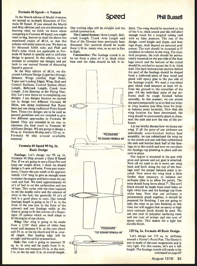 Formula 40 SpeedA Natural March edition Model viation started in-depth discussion mula 40 Speed missed March May editions interested learning what think know about competing Formula 40 Speed might want beg borrow steal above two mentioned copies MIA column will make sense have far discussed AMA rules Phill Dubs rules applicable mula 40 Speed specific airframe design general edition will attempt complete designs get back normal format discussing Speed general May edition MIA dis cussed Airframe Design Light Strong Balance Wings Airfoil High Point Taper Leading Edge Wing Stab Control Surfaces Control System Horn Length Bellcrank Length Crank Arm Length Line Spacing Flying Han dle Lets now move completing designs say designs because started out design two different Formula 40 Ships along traditional Rat Racer lines along traditional Proto Speed lines two designs used general guidelines intended give two different approaches Formula 40 Speed intended no way represent final word Formula 40 Airframe Design going design 90 sq Formula 40 ship 125 sq Formula 40 ship around available material Formula 40 Speed 90 Sq Basic Design Fuselage Lets design 90 sq Formula 40 Ship around Darp B Speed Pan going use Darp Pen keep weight down think should design -pan airframe past exper ience know pan needs approxi mately 111/4 long give us enough room mount engine leave room tank fuel need approximately 45 cc s fuel set carburetion run 14 laps varies time required set needle valve amount nitro fuel generally 45 ccs fuel good place start overall fuselage length going 17 front pan front spinner fuselage width front going fit contour Super tigre 29 spinner shall adapt fit engine choice Wing wing going made 5/16 thick piece white bass wood measure 4 root chord 3 tip chord 24 over length leading edge will straight airfoil symmetrical Stab stab going measure 39 sq in area made /i white bass measure 3 root 3 tip 12 in overall length Speed trailing edge will straight airfoil symmetrical Control System Horn Length Bellcrank Length Crank Arm Length Size Elevator have previously discussed pushrod should made 1/16 music wire flex flight Construction fuselage crutch cut piece k white bass sides should left /s POOHAWK 90 SQUARE FORMULA 40 Pa OHAWK 125 SQUARE FORMULA 40 Phill Bussell thick wing should mounted top k crutch will allow enough room surgical tubing tank no false pressure rest designcowl height shape fuse lage shape shall depend personal pref erence stab should mounted 00 incidence relation wing prac tical purposes stab should perma nently mounted pan side fuse lage crutch bottom crutch should notched accept /8 thick stab back bottom rear portion behind pan fuselage should shaped hollowed piece bass wood glued epoxy glue pan side fuselage crutch need one-wheel gear shall measure least 4V4 ground centerline pan individual parts air frame shall rough finished before assembly manner can attach parts temporarily find prop er wing location see May issue prop er balance point location Now wing location has determined wing should permanently glued place next stab now rest air frame Let briefly discuss locate wing parts airframe individually semi-finished before final assembly can rubberband wing crutch pan rubberband stab bottom back half fuse lage crutch now can place fuselage top planking place cowl place engine mounted pan prop spinner gear attached Now need move wing back forth along top fuse lage until proper balance point lo cated Now move wing back little farther necessary balance airframe allow paint nose should hang down about 7 cowl block should made hard balsa light white bass fuselage top white bass Now airframe permanently glued together should prepared finishing am going take time go finishing time will suggest epoxy high nitro resistant finish should used use coat polyester surfacing resin coat primer coat epoxy color makes light durable finish 125 Sq Formula 40 Basic Design Lets design 125 sq airframe around Harters Proto Pan Harters pan made die-case magnesium very light reason lets use full length fuselage crutch still needs continued page 83 August 1976 31 Name Addrns City ____________________ 7in miowes PRODUCTS CD 400 South Indiana St Hobart Indiana 46342 partment balance model shown plans builder doesnt get carried away paint covering stab fin model will balance two ounces tare weight Hand glide model check trim ready try first launch recommend locate tow hook approximately ahead CG first several launches move back /4 time until approximately 1 behind CG further back can move tow hook sailplane becoming too unstable during tow higher launch can obtain using electric winch keep speed down will use up less line 0-10 knot winds prefer fly air plane additional weight Above 10 knots can add up lb lead weight compartment using 4-oz slug place third tube back front want 8 oz additional weight place lead slugs second fourth holes want 12 oz use back three holes arrangements will maintain CG loca tion very windy conditions slope soaring place fourth weight front tube will shift CG slightly ward better handling Good luck send photographs trophies CL Speed/Bussell continued page 31 made out /2 thick bass over length will approximately 19 long approximate length Harters pan after pan cut match diameter Supertigre 29 spinner engine mounted Lets make wing /t thick hard 6 lb 8 lb C grain balsa can save little weight over bass wing very important big airframe wing will 25 long 6 root 4 tip chord Use /8 X 3 bass maple spar mount control system tie down bolts wing leading edge straight wing taper trailing edge airfoil symmetrical 30% high point Stab stab going measure 39 sq in area should made 3/16 hard balsa root chord 3 tip chord 2 overall length 13 rest design very similar construction techniques speed ship cowl height shape depends engine used personal preference fuselage top should made hard balsa again wing location found 90 sq design pre-assembling component parts airframe moving wing fore aft until C/G locate