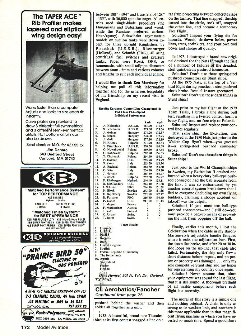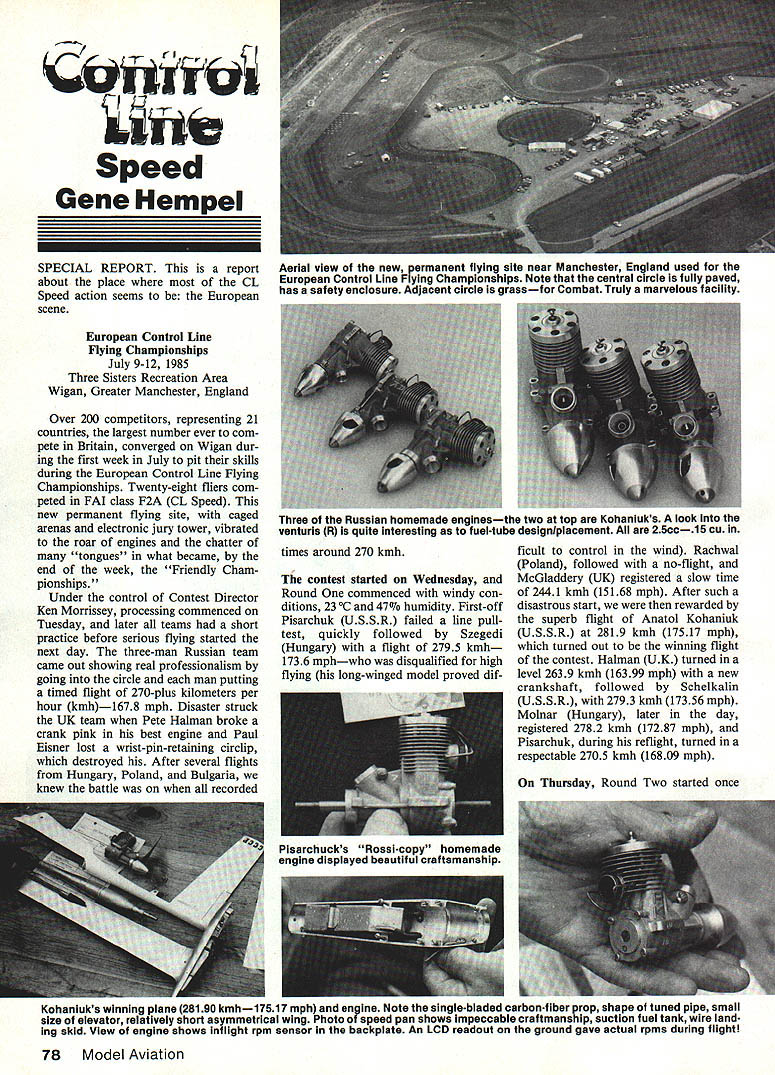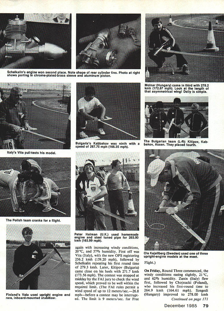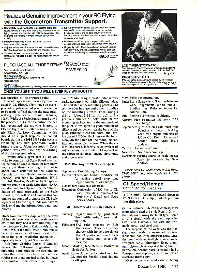 Speed Gene Hempel SPECIAL REPORT report about place CL Speed action seems European scene European Control Line Flying Championships July 9-12 1985 Three Sisters Recreation Area Wigan Greater Manchester England Over 200 competitors representing 21 countries largest number ever com pete Britain converged Wigan dur ing first week July pit skills during European Control Line Flying Championships Twenty-eight fliers com peted FAI class F2A CL Speed new permanent flying site caged arenas electronic jury tower vibrated roar engines chatter tongues what became end week Friendly Cham pionships Under control Contest Director Ken Morrissey processing commenced Tuesday later teams short practice before serious flying started next day three-man Russian team came out showing real professionalism going circle man putting timed flight 270-plus kilometers per hour kmh1678 mph Disaster struck UK team Pete Halman broke crank pink best engine Paul Eisner lost wrist-pin-retaining circlip destroyed After several flights Hungary Poland Bulgaria knew battle recorded times around 270 kmh contest started Wednesday Round commenced windy con ditions 23 0C 47 humidity First-off Pisarchuk USSR failed line pulltest quickly followed Szegedi Hungary flight 2795 kmh 1736 mphwho disqualified high flying long-winged model proved dif ficult control wind Rachwal Poland followed no-flight McGladdery UK registered slow time 2441 kmh 15168 mph After such disastrous start rewarded superb flight Anatol Kohaniuk USSR 2819 kmh 17517 mph turned out winning flight contest Halman UK turned level 2639 kmh 16399 mph new crankshaft followed Schelkalin USSR 2793 kmh 17356 mph Molnar Hungary later day registered 2782 kmh 17287 mph Pisarchuk during reflight turned respectable 2705 kmh 16809 mph Kohanluks winning plane 28190 kmh17517 mph engine Note single-bladed carbon-fiber prop shape tuned pipe small size elevator relatively short asymmetrical wing Photo speed pan shows impeccable craftmanship suction fuel tank wire land ing skid View engine shows Inflight rpm sensor backplate An LCD readout ground gave actual rpms during flight 78 Model Aviation Aerial view new permanent flying site near Manchester England used European Control Line Flying Championships Note central circle fully paved has safety enclosure Adjacent circle grassfor Combat Truly marvelous facility Three Russian homemade enginesthe two top Kohanluks look venturis R quite Interesting fuel-tube designlplacement 25cc15 cu Thursday Round Two started once Pisarchucks Rossi-copy homemade engine displayed beautiful craftsmanship again increasing windy conditions 20 0C 57% humidity First off Vita Italy new OPS registering 2562 kmh 15920 mph followed Schelkalin repeating first round time 2793 kmh Later Kitipov Bulgaria came close heels 2717 kmh 17356 mph contest stopped midday FAI jury check wind speed proved well within required limit FAI rules permit wind speed up 12 meters/sec268 mphbefore contest may interrupt ed limit 9 meters/sec Free Flight Friday Round Three commenced windy conditions easing slightly 21 0C 62% humidity Zanin Italy flew first followed Chojnacki Poland increased first-round time 2649 kmh 16461 mph Szegedi Hungary improved 27800 kmh Continued page 171 December 1985 79 Schelkalins engine won second place Note shape rear cylinder fins Photo right shows porting chrome-plated-brass sleeve alurn num piston oinar i-Iungary came third 2782 kmh 17287 mph Look length asymmetrical wingl Dolly simple Italys Vita pull-tests model Bulgarian team LR Kitipoy Kab Bulgarias Kabbakoy ninth bakoy Assen placed fourth speed 26770 mph 16635 mph Peter 1-lalman UK used homemade engine steel tuned pipe 26390 kmh 16399 mph Oie Kejeiiberg Sweden used three upright-engine models meet Finlands Valo used upright engine rare inboard-mounted stabilizer Realize Genuine Improvement RC Flying Geometron Transmitter Support Completely frees hands control sticks levers nothing way Allows concentrate flying because dont have hold transmitter operating controls Provides full tour corner stick mobility Improves accuracy stick movement because transmitter held stable Adjusts two-stick transmitter modifications Simple adjustments arm length shoulder size Transmitter secured safety catch can removed replaced second yet cannot accidentally fall out p Extremely comfortable use wear Put take off instant hat No bets buckles straps no cord around neck Wearing support transmitter stays place carry plane Doubles ideal ground support otters perfect accessibility keeps transmitter off ground Ruggedly built heat treated aluminum finished heavy duty anodize Assembled stainless steel fasteners Designed constructed extended use695O HASE ALL THREE ITEMS $995Q $99Q See dealer order direct GEOMETRON CO INC 12 INGLESIDE ROAD LEXINGTON MASSACHUSETrS O1 73 617 861-6526 PIus $150 shppsg coo 200 addmonal cash o soses oder ooIv Charses aDslv sf10 coshsOntai US Mass resuents add 5c LCD TIMER/STOPWATCH Counts up down preset hold additive features Time out sounds alarm auto shut off Easy read outdoors lithium battery 21 95* PROTECTIVE BAG Made space age aluminum coated nylon Reflects suns heat protects Tx dirt and4 dust special fast acting closure ONCE YOU USE IT YOU WILL NEVER FLY WITHOUT IT resubmission proposed rules would appear inter ested CL Electric flight have eventpromotion job ahead event made official during next rulesmaking cycle starts January 1986 Scale Board turned down proposed rules Executive Council has recognized growing interest Electric flight establishing Elec tric Flight Advisory Committee should great help contest boards during 1986-1987 rules cycle evaluating new proposals Watch future issues Model Aviation Com petition Newsletter section listing district representatives would also suggest write district Scale Board member telling him interest let him know youre out might also write about activities National Association Scale Aeromodelers NASA John R Guenther RR 3 Box 261 Borden IN 47106 As special intere