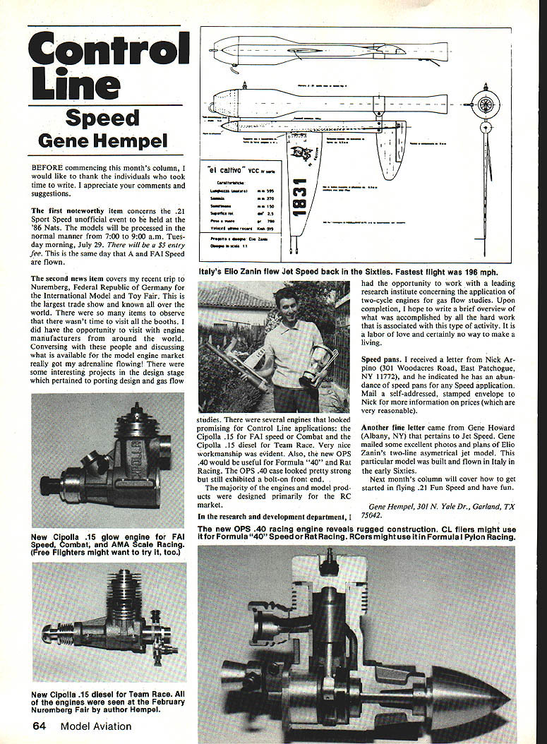 Control Line Speed Gene Hempel BEFORE commencing months column would like thank individuals took time write appreciate comments suggestions first noteworthy item concerns 21 Sport Speed unofficial event held 86 Nats models will processed normal manner 700 900 am Tues day morning July 29 will $5 entry fee same day FAI Speed flown second news item covers recent trip Nuremberg Federal Republic Germany International Model Toy Fair largest trade show known over world items observe wasnt time visit booths did have opportunity visit engine manufacturers around world Conversing people discussing what available model engine market really got adrenaline flowing some interesting projects design stage pertained porting design gas flow 64 Model Aviation Italys Ello Zanin flew Jet Speed back Sixties Fastest flight 196 mph studies several engines looked promising Control Line applications Cipolla 15 FAI speed Combat Cipolla 15 diesel Team Race Very nice workmanship evident Also new OPS 40 would useful Formula 40 Rat Racing OPS 40 case looked pretty strong still exhibited bolt-on front end majority engines model prod ucts designed primarily RC market research development department opportunity work leading research institute concerning application two-cycle engines gas flow studies Upon completion hope write brief overview what accomplished hard work associated type activity labor love certainly no way make living Speed pans received letter Nick Ar pino 301 Woodacres Road East Patchogue NY 11772 indicated has abun dance speed pans Speed application Mail self-addressed stamped envelope Nick information prices very reasonable Another fine letter came Gene HoWard Albany NY pertains Jet Speed Gene mailed some excellent photos plans Elio Zanins two-line asymetrical jet model particular model built flown Italy early Sixties Next months column will cover get started flying 21 Fun Speed have fun Gene Hempel 301 N Yale Dr Garland TX 75042 -SI Caflivo vcc,. Crn LS wI SM sI V4~ Sn New Cipolla 15 glow engine FAI Speed Combat AMA Scale Racing Free Flighters might want try too new OPS 40 racing engine reveals rugged construction CL fliers might use itfor Iormula 40 Speed Rat Racing RCers might use Formula Pylon Racing New Cipolla 15 diesel Team Race engines seen February Nuremberg Fair author Hempel