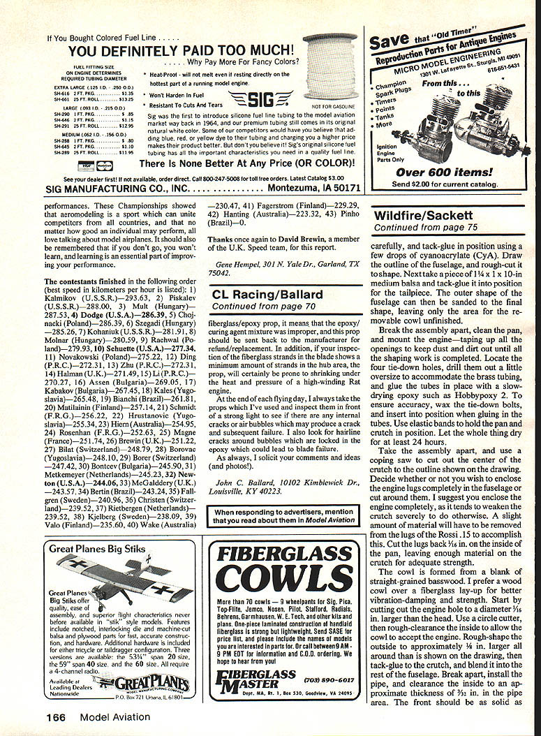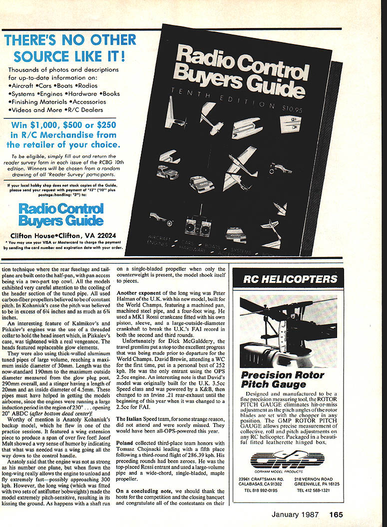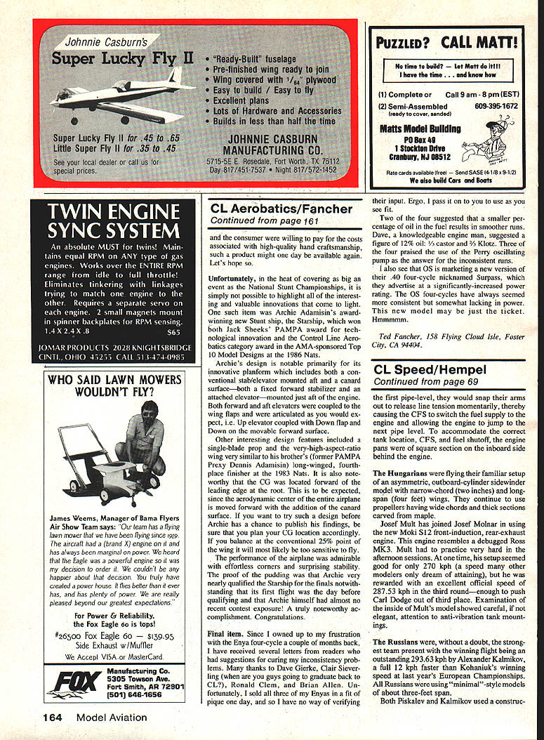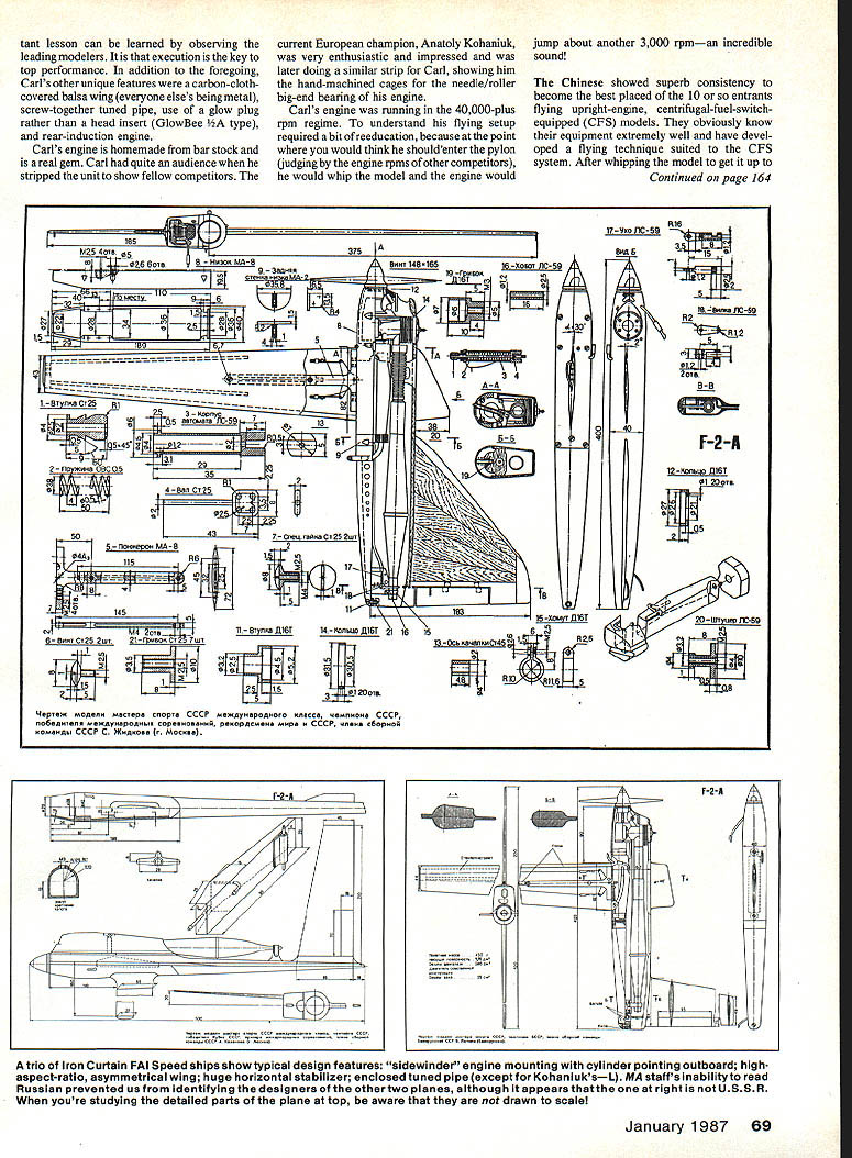 Control Line Speed Gene Hempel LETS LOOK closely Speed portion recent CL World Championships held Pecs Hungary David Brewin member British F2A Speed team gives account 1986 Control Line World Championships hosted Hungary held Pecs goodsized town European standards located rolling hills southern part country Pecs boasts Control Line flying site built express purpose located south end town near residential area has two circles surrounded poplar trees used Aerobatic F2B Team Race F2C competitions F2D Combat held undeveloped factory lot quarter mile east F2A Speed competition interest column newly-resurfaced apartment parking lot 150 yards west As would expected country has three top successful Speed fliers recent times organization execution Speed event excellent man has usually Hungarian Speed team manager relinquished duty favor being contest director timing height-judging officials sensibly located same radial point provided seating ramp couple few criticisms could leveled organiza tion absence three-minute circle clock slightly-underenthusiastic safety-pulling models competition started 800 am morning very few reflights round finished about 100pm allowing circle used practice flying afternoon As often happens flying competi tion particularly level have fly team team members allowed assist others starting duties writer unable observe flight fore rather give blow-by-blow account flight three rounds general over view competition technical observa tions given Australians traveled furthest intentions continue British Nationals after World Championships suffering drastic climatic change Apparently practicing local winter conditions 4080 C now competing consistent weather conditions 3Q0 C higher flying nicely-made asymmetric sidewinder models having suction fuel systems utilizing todays standards short spans wide-chord wings Rossi-powered Robin Hiern used two-bladed carbon-fiber prop record 25495 kph twenty-third place American team used models similarsize extremely short tail moment current FAI standards team-members model varying degrees unique compared other championship entrants used sidewinder type models inboard-pointing cylinders pressure-regulator-valve fuel systems John Newton seemed suffering eternal Speed fliers problem keep model flying fast did home collective head-scratching abilities usual flying buddies John midnight session work engine try improve thirdround performance unfortunately no avail nice thing about attending international event such chance meet talk people have able read about hear about admire afar Such case Chuck Schuette Folklore abounds about fickleness fuel systems highpressure bladder pressure-regulator like contest must sald Carl Dodge showed patience Job keeping Chucks engine run ning long strong enough get model airborne However once airborne Chucks flying style true lesson economy energy putting 277 kph flight good enough tenth place Carl Dodges engine setup ways individual contestants An impor F-2-A 9 K her Russian plane Note stub wing outboard side huge stabilizer Inboard wing spans 615cm root chord7Ocm ii2 68 Model Aviation Anatoly Kohaniuks super-long-wing backup model flown practicebutwas very fast until disaster struck in-flight shaft runs vibration shook pieces two protrusions wings leading edge anti-flutter counterweights Finlands Valo immaculately-prepared upright-engine centri fugal fuel switch CFS-equlpped model Note unlike other models has inboard-mounted stabilizer tant lesson can learned observing leading modelers execution key top performance addition foregoing Carls other unique features carbon-clothcovered balsa wing everyone elses being metal screw-together tuned pipe use glow plug rather head insert GlowBee type rear-induction engine Carls engine homemade bar stock real gem Carl quite audience stripped unit show fellow competitors current European champion Anatoly Kohaniuk very enthusiastic impressed later doing similar strip Carl showing him hand-machined cages needle/roller big-end bearing engine Carls engine running 40000-plus rpm regime understand flying setup required bit reeducation because point would think shouldenter pylon judging engine rpms other competitors would whip model engine would jump about another 3000 rpman incredible sound Chinese showed superb consistency become best placed 10 entrants flying upright-engine centrifugal-fuel-switchequipped CFS models obviously know equipment extremely well have devel oped flying technique suited CFS system After whipping model get up Continued page 164 185 MZ5 4OTsA iltIZ66omLZ2i25iAABAINT 148A 16516toKar I1C-59 12 408.~r14 3u, 154 990 N-~NeAlB 9999599 155L1— -TA A-a- ASA5 1BTynwcT25RI 05 8BTO48T t-59 9 920 5452-Ii ,wa OBC QS 50 ur ra2wi 04A115RGF-A77t~I B~Id17 --j}3JBB 701 145 11 Bryniw fiSt NrIzr4TJ OINII---ff]A eprsm MOJreau Moctepa copr ccc MemAyoapOAAOrO RaGed qewnaRa ccc, flOSeAHYOflR It94yxapo4bAx cOpemRo.HAB pOKOpAdMeRe p cccp ao0 cccp c mHAuOa r Moca. 14- Konbuo fiST 21 16 Jn l-tiI NTM4 2or..UJ fr13T2jW21 ryaeoc CT 25 7urr N 4 15XOMYI fiST 13 - BnS 6 17500 J1C59 18 -Blue It-59 82 2om SB F-2-A 12-Konbuc LUST 01 2Oor 20-Wryuep JE-59 8 9 8 trio Iron Curtain FAI Speed ships show typical design features sidewinder engine mounting cylinder pointing outboard highaspect-ratio asymmetrical wing huge horizontal stabilizer enclosed tuned pipe except KohaniuksL MA staffs Inabilityto read Russian prevented us identifying designers other two planes although appears right USSR youre studying detailed parts plane top aware drawn scaie January 1987 69 F2A F-2-A consumer willing pay costs associated high-quality hand craftsmanship such product might day available again Lets hope Unfortunately heat covering big event National Stunt Championships simply possible highlight interest ing valuable innovations come light such item Archie Adamisins awardwinning new Stunt ship Starship won both Jack Sheeks PAMPA award tech nological innovation Control Line Aero batics category award AMA-sponsored T