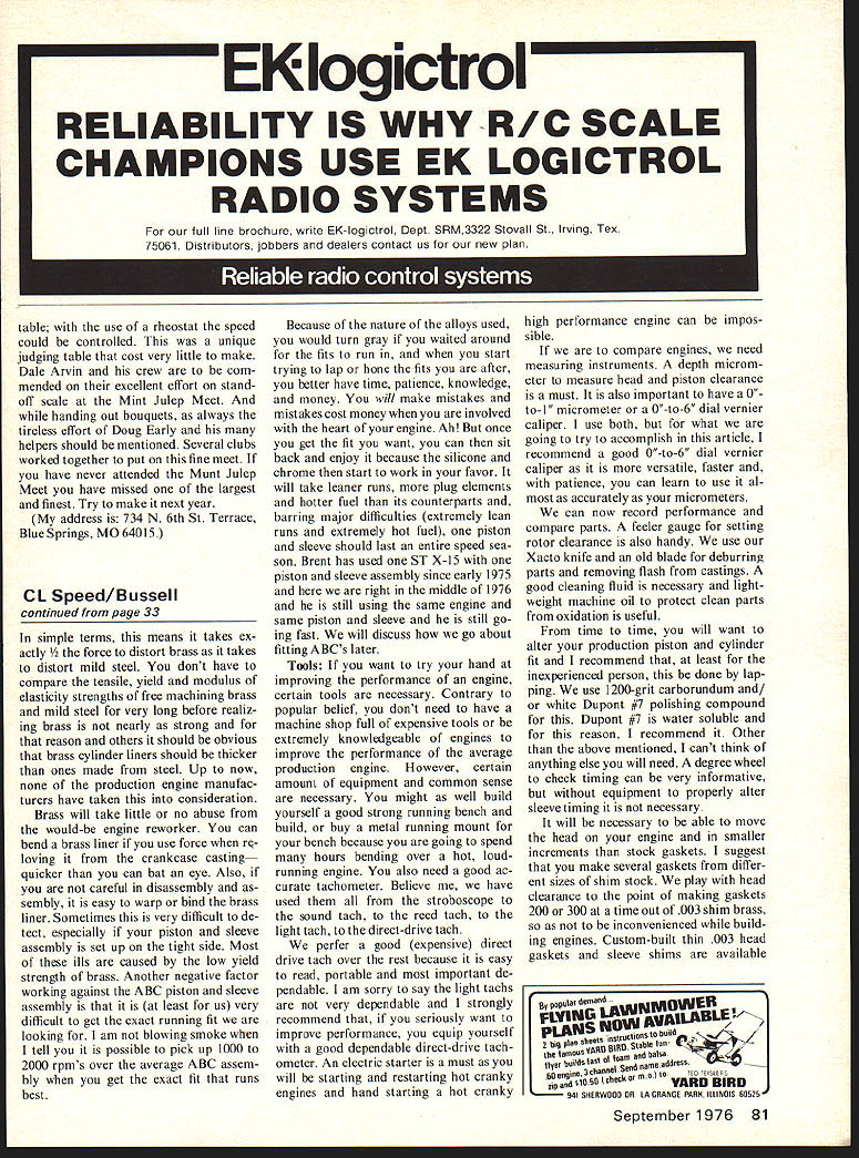 Left Bob Ytuarte displays Stern concentration launches Frank Garzons C ship meet Flushing Meadow Park NV Bill Boss pic Engines performance props fuel start Well said would dis cuss high performance production 40s fuel props goes three production 40s opinion lend themselves well mula4O Speed K&B 65cc ABC 40 Supertigre X-40 OPS 40 three engines have two things com monthey rear exhaust have ABC piston cylinder assem blies other high performance production 40s available rea son another think would well choose engine above three Formula 40 rules allow us run con stant diameter type exhaust extension commonly referred -wave length mini-pipe three chosen engines sport rear exhaust crankcase cast ings designed run mintpipe full tuned pipe need re member mini-pipe can longer 5 measured end pipe centerline engine cylinder cast ing three chosen engines sport ABC piston cylinder assemblies important no other reason wear abuse standpoint dont think high silicone aluminum alloy piston running chromed brass liner faster cast-iron piston steel liner aluminum piston ring cast-iron steel liner know sure wear characteristics sili cone running chrome much better experience commonly used piston sleeve assem blies tells us ABC assembly will take abuse dirt heat fuel anything else have seen Sounds am sold highsilicone aluminum alloy piston chromed brass cylinder assembly doesnt speed am remember have restart racing have restart am sure negative side everything however ABC piston sleeve assembly has pluses its favor brass has coefficient expansion extremely close high-silicone alumi num alloys also has negative charac teristics working against First brass strong steel fact free machine brass has tensile strength 57000 psi yield strength 25000 psi leadloy commonly used mild steel has tensile strength 70000 psi yield strength 60000 psi naval brass has tensile strength 75000 psi yield strength 53000 psi ob viously better suited brass use strength standpoint However naval brass does machine nearly easy free machining brass ob viously production brass liners market today made free machining brass addition wide difference yield tensile strengths free machin ing brass opposed mild steel important differences noted comparing two materials differ ence modulus elasticity eg force required bend elastically modulus elasticity brass V2 mild steel con tinued page 81 September 1976 33 Speed Formula 40 Speeda Natural John Brownlee Columbus Air Force Base MO preparing Rossi 15-powered FAI ship recent Contest Photo Diane Brownlee Below part VHP Team Arlie Fridley launches home-built 65-powered D ship Memphis contest Diane Brownlee pic table use rheostat speed could controlled unique judging table cost very little make Dale Arvin crew com mended excellent effort stand off scale Mint Julep Meet handing out bouquets always tireless effort Doug Early helpers should mentioned Several clubs worked together put fine meet have never attended Munt Julep Meet have missed largest finest Try make next year address 734 N 6th St Terrace Blue Springs MO 64015 CL Speed/Bussell continued page 33 simple terms means takes ex actly e distort brass takes distort mild steel dont have compare tensile yield modulus elasticity strengths free machining brass mild steel very long before realiz ing brass nearly strong reason others should obvious brass cylinder liners should thicker ones made steel Up now production engine manufac turers have taken consideration Brass will take little no abuse would-be engine reworker can bend brass liner use force r loving crankcase casting quicker can bat eye Also careful disassembly sembly easy warp bind brass liner Sometimes very difficult de tect especially piston sleeve assembly set up tight side Most ills caused low yield strength brass Another negative factor working against ABC piston sleeve assembly least us very difficult get exact running fit looking am blowing smoke tell possible pick up 1000 2000 rpms over average ABC assem bly get exact fit runs best Because nature alloys used would turn gray waited around fits run start trying lap hone fits after better have time patience knowledge money will make mistakes mistakes cost money involved heart engine Ah once get fit want can sit back enjoy because silicone chrome start work favor will take leaner runs plug elements hotter fuel its counterparts barring major difficulties extremely lean runs extremely hot fuel piston sleeve should last entire speed sea son Brent has used ST X-15 piston sleeve assembly since early 1975 right middle 1976 still using same engine same piston sleeve still go ing fast will discuss go about fitting ABCs later Tools want try hand improving performance engine certain tools necessary Contrary popular belief dont need have machine shop full expensive tools extremely knowledgeable engines improve performance average production engine However certain amount equipment common sense necessary might well build yourself good strong running bench build buy metal running mount bench because going spend hours bending over hot loudrunning engine also need good ac curate tachometer Believe have used stroboscope sound tach reed tach light tach direct-drive tach perfer good expensive direct drive tach over rest because easy read portable important de pendable am sorry say light tachs very dependable strongly recommend seriously want improve performance equip yourself good dependable direct-drive tach ometer An electric starter must will starting restarting hot cranky engines hand starting hot cranky high performance engine can impos sible compare engines need measuring instruments depth microm eter measure head piston clearance must also important have 0to-l micrometer 0-to-6 dial vernier caliper use both what going try accomplish article recommend good 0-to-6 dial vernier caliper versatile faster patience can learn use al accurately micrometers can now record performance compare parts feeler gauge setting rotor clearance also handy use Xacto knife old 