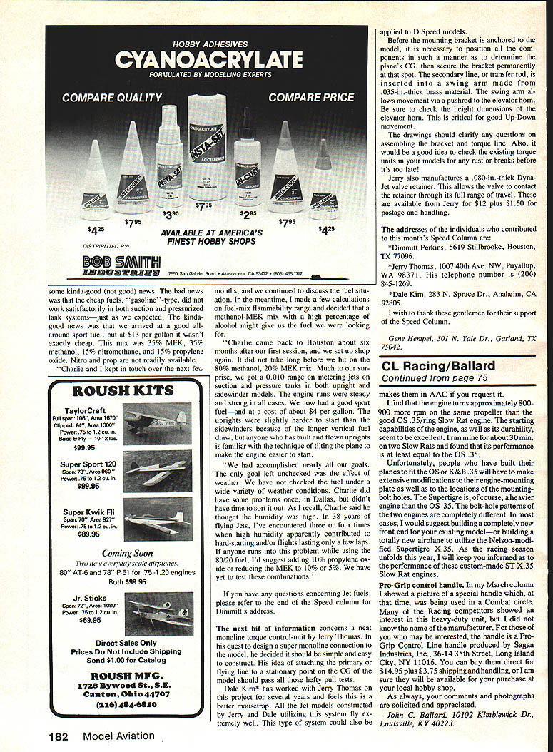 Control Line Speed Gene Hempel JETS AGAIN months column covers two excellent bits information concerning Jet mod els first letter Dimmitt Perkins* Houston TX explaining evolution sport Jet fuel came about latter article ex plains new torque unit designed Jerry Tho mas* Jet D Speed models Heres Dimmitt NASS North American Speed Societyed Banquet asked Charlie Davis came up sport Jet fuel con taining MEK methanol Heres story About year maybe year-and-a-half ago Charlie called ihe idea sport event Jet low-key event promote Jet models Youve run couple articles pro posed rules model plans got discussing fuels agreed several require ments 1 The fuel should easy-starting 2 It should have wide combustion range metering jets would critical also make possible operation pressurized fuel tank upright sidewinder model requirement would also reduce weather effects 3 It would cheap 4 The ingredients should easy obtain common Jet fuel ingredients gasoline certainly cheap flam mability range about 15% 75% volume air can critical respect metering jetsespecially run pressure Nitromethane L-41flt .sP .sa*aL / tAiM eo 040 doe 70 ..n .a/sa r .S4 000 adOAoS S000F0O Nsa I- ~1S 4I-/ 749 12 Li OSS 000 *542 AS0 Fe 004#*O0 49A14 Ji AZSV*70C SWi*M .0Oet frr/ 0057Z0 S00u i _7iI 40 -J 141000 AlMa cit 54 o-na Sn .0 ACJWAO cc 497 ne 420 7090 44f49 12 z4 095 ficOR p9oe5 SlOt VS. ffA7h f Aiwo XT*S0M Lesta iK parts Jerry Thomas one-line control unit Note drawn scaie Good 0 Speed too 74 Model Aviation Joe Kinna new asym metrical sidewinder Jet Speed modei uses Jerry Thomas-designed one-iine torque-operated controi unit Heres Jerry Thomsa new oontroi unit instaiis Jet Speed modei propylene oxide mixtures have good operatingBut methanol itself good Jet fuel characteristics definitely cheap Meth-It lacks range power Hydrocarbons like gaso anol relatively cheap easy obtain withline benzene help Mike Hoyt used run its 67% 365% flammability limits has afuel consisting 4-1-1-1 mix methanolwider flammable range common fuelbenzene-nitromethane-propylene oxide beningredientsContinued page 181 DAVE rke et ROBELEN S 42 span 15- 25 engines Outstanding small field performance novice 8 expert alike om airfoils top perfotmance quality balsa plywood gned 3 channels Precision machine-cat balsa plywood Playmate 3 ch 50 sportfun fly 1 5-25 2 4 cycle fast assembly hand-cut Itit$4995 Pronto 50 span 1 5-25 2 4 cycle 3 ch. hand-cut kit easily converted tp elec excellent beginner also challenges expert $3995 Available dealer order dIrect Add 52 shipping additional $2 COD ASave COD send check money order TIDEWATER HOBBY ENTERPRISES 26 Sapphire Run Deala FL 32672 5 687-2160 904-245-4653 sheet aluminum about tAsin thick us probably have shop scrap box youre up making own quick look through almost hobby catalog will reveal bellcranks usually made nylon will fit mosi needs Youll find belicranks can used operations shown sketch B C well 600900 1200 versions ofBellcrank D generally used change angle pushrod travel little imagination ingenuity can make find bellcranks almost operation Club reports Jack Stolly Dallas TX informs us Dallas Model Aircraft Association CL club has made great membership come back during past five years now has over 40 members several Scale model ers Once again can report success obtaining good CL flying site city Dallas has provided club site contains two paved two grass circles addition site close proximity toilets phones water concessions particular interest Scale readers fact clubs scale activities ther increase CL Sport Scale event will included 1987 contests first contest will held Saturday Sunday June 20-21 second Southwesterns September 19-20 Both contests will Samuel Garland Park Northwest Highway Garlands Road Dallas TX informa tion contact Jack Stolly 11323 Cotillion Dallas TX 75228 Another major CL contest also being held September 19-20 1987 Raider Roundup 87The Washington State CL Championships Boeing Space Center Kent WA wll include Sport Profile Scale events full qontest details write Dave Mullens Skywriter Editor 15559 Palatine Ave N Seattle WA 98133 Scale Model Research has once agaln expanded its inventory Full Color Documentation Foto Paaks Koku-Fan three-views over 600 new additions now have available over 1400 Foto-Paaks 50000 photos inven tory 3 x 5 full-color photos show details landing gear instrumentation hinges flaps paint schemes markings Most Foto-Psaks have three-views available enable Scale modeler have complete documentation project single package new SMR listing Foto-Paaks threeview drawings send self-addressed envelope Scale Model Research 2334 Ticonderoga Costa Mesa CA 92626 Please send correspondenceand espe cially photosrelating CL Scale BillBoss 77-06 269th St New Hyde Park NY 11040 CL Speed/Hempel Continued page 74 zene generally increased laps required didnt want use benzene hard get generally considered carcinogenic wanted avoid nitro prop possible because cost availability remembered back Sixties benzene fuel choice engine/airplane combination would run straight benezene buming valves run 50/50 benzene white gas give up couple mph company working Say0 th8t tksiw14G Over 600 Items Send *200 current catalog benzene MEK methy ethyl ketone day noticed physical properties similar Idea Jet fuel tried it worked So try MEK sport fuel MEK available paint stores now lot things try gasoline kerosene Coleman fuel methanol MEK nitro methane propylene oxide maybe others Charlie came Houston twice loaded up right sidewinder airplanes test stand accessories dusted off old upright grabbed bunch accessories went Melrose Park day testing Wed mix batch fuel check out test stand find both right metering jet range metering jets suction feed pressurized feed found good fuel mix wed put test flight model suction tank model having pressurized tank cases engine stock Dyna-Jet head stock retainer tailpipe fuel tank pressurizing fitting silver-soldered place plugged piece fuel line use flow-jector used either stock g