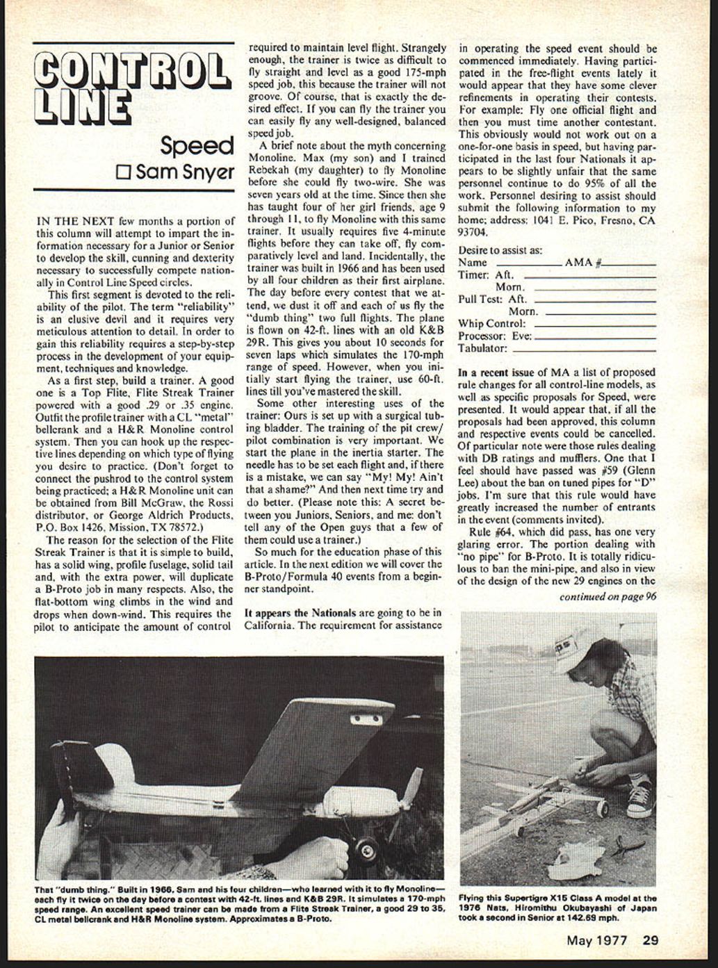 Speed 5 Sam Snyer IN THE NEXT few months portion column will attempt impart formation necessary Junior Senior develop skill cunning dexterity necessary successfully compete nation ally Control Line Speed circles first segment devoted reli ability pilot term reliability elusive devil requires very meticulous attention detail order gain reliability requires step-by-step process development equip ment techniques knowledge As first step build trainer good Top Flite Flite Streak Trainer powered good 29 35 engine Outfit profile trainer CL metal bellcrank H&R Monoline control system can hook up respec tive lines depending type flying desire practice Dont forget connect pushrod control system being practiced H&R Monoline unit can obtained Bill McGraw Rossi distributor George Aldrich Products PO Box 1426 Mission TX 78572 reason selection Flite Streak Trainer simple build has solid wing profile fuselage solid tail extra power will duplicate B-Proto job respects Also flat-bottom wing climbs wind drops down-wind requires pilot anticipate amount control required maintain level flight Strangely enough trainer twice difficult fly straight level good 175-mph speed job because trainer will groove course exactly de sired effect can fly trainer can easily fly well-designed balanced speed job brief note about myth concerning Monoline Max son trained Rebekah daughter fly Monoline before could fly two-wire seven years old time Since has taught four girl friends age 9 through 11 fly Monoline same trainer usually requires five 4-minute flights before can take off fly com paratively level land Incidentally trainer built 1966 has used four children first airplane day before contest tend dust off us fly dumb thing two full flights plane flown 42-ft lines old K&B 29R gives about 10 seconds seven laps simulates 170-mph range speed However ini tially start flying trainer use 60-ft lines till youve mastered skill Some other interesting uses trainer set up surgical tub ing bladder training pit crew/ pilot combination very important start plane inertia starter needle has set flight mistake can say My Aint shame next time try better Please note secret tween Juniors Seniors dont tell Open guys few could use trainer So much education phase article next edition will cover B-Proto/Formula 40 events begin ner standpoint appears Nationals going California requirement assistance operating speed event should commenced immediately Having partici pated free-flight events lately would appear have some clever refinements operating contests example Fly official flight must time another contestant obviously would work out one-for-one basis speed having par ticipated last four Nationals ap pears slightly unfair same personnel continue 95% work Personnel desiring assist should submit following information home address 1041 E Pico Fresno CA 93704 Desire assist NameAMA# Timer Aft __________________________ Mom ______________________ Pull Test Aft ____________________ Morn Whip Control ______________________ Processor Eve ________________________ Tabulator recent issue MA list proposed rule changes control-line models well specific proposals Speed presented would appear proposals approved column respective events could cancelled particular note rules dealing DB ratings mufflers feel should have passed #59 Glenn Lee about ban tuned pipes D jobs Im sure rule would have greatly increased number entrants event comments invited Rule #64 did pass has very glaring error portion dealing no pipe B-Proto totally ridicu lous ban mini-pipe also view design new 29 engines continued page 96 May1977 29 dumb thing Built 1966 Sam four childrenwho learnea fly Monoilne fly twice day before Contest 42-ft lines K&B 29R simulates 170-mph Flying Supertigre Xl 5 Class model speed range An excellent speed trainer can made Flite Streak Trainer good 29 35 1976 Nets Hiromithu Okubayeshi Japan CL metal belicrank H&R Monoline system Approximates 8-Proto took second Senior 14269 mph GOOF PROOF TRIM SHEETS iron-on goof merely re-heat lift re-posi tion 5 x36 red e ow ge aluminum e drab dayglow orange low yellow VERITE 2779 Philmont Ave Huntingdon Valley Pa 19006 Fill tank through feed line means removing tubing needle thats OK since tank will require refueling during course match tank full put tubing back needle pinch tubing off clothes pin etc style tank likes siphon will quickly flood engine helper holding plane remove clip line start motor Now comes strange part style tank needle must set very lean ground lean engine sags almost Just lean out until fingers say Stop lean out bit youll close plane launched go level few laps engine goes bit rich its probably OK far setting concerned plane level flight check sure flying wings level youve got warp Its up whether try maneuvers warped wing best wait until warp removed plane straight go ahead wring out Make mental notes flies turns OK insides kind wide outsides remember adjust linkage suit plane straight will hang out lines very well have way too much control So ad just linkage give more travel until plane bogs down slightly turns back off little give tightest fastest turns possible plane works very well wig gly maneuvers now gaining popularity West Coast So try flying rather jerky fashion doing lots rever sals direction quick succession practice flying try force myself never complete half loop let alone full loop both easy maneuvers someone follow through never lazy 8this maneuver extremely easy follow unless can bottoms foot off ground watching plane case lazy 8s great way suck oppo sition ground first flight also keep track engine runs cuts rich out side loops too rich tank still has fuel 2 oz engine quits engine completely broken well broken-in engine previous ly suggested props tank made per plans pictures 10% 20% fuel right needle setting can expect super runs engine will run con stant speed through maneuver can dream up setting will go lean end tank CL Speed/Snyder continued page 29 market new K&B 29 Super tigre 29X bot
