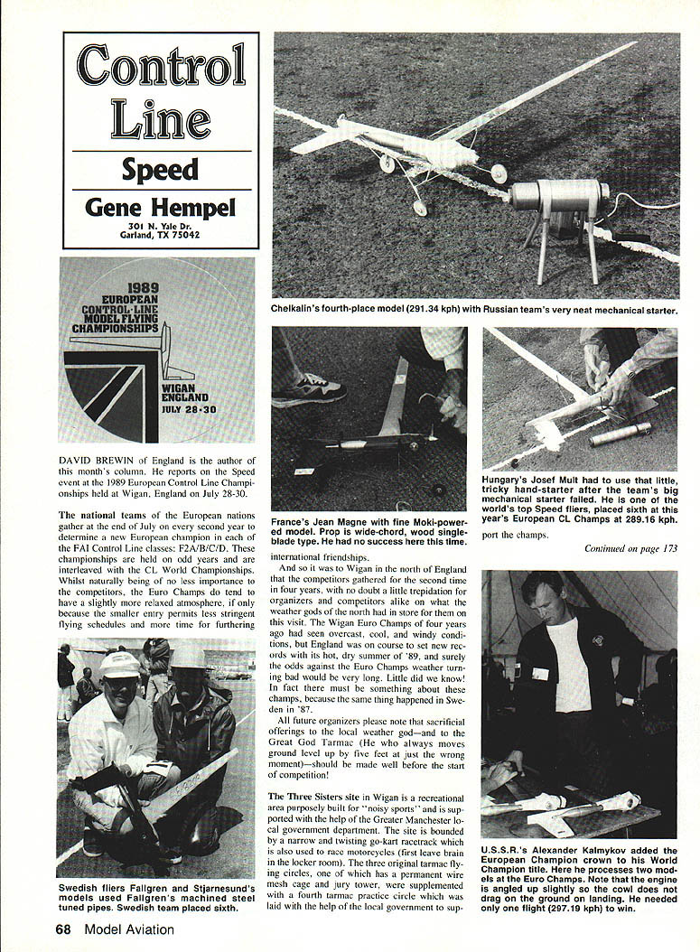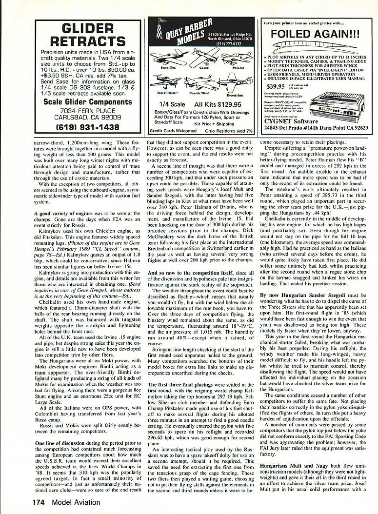 DAVID BREWIN England author months column reports Speed event 1989 European Control Line Champi onships held Wigan England July 28-30 national teams European nations gather end July second year determine new European champion FAT Control Line classes F2A/B/C/D championships held odd years interleaved CL World Championships Whilst naturally being no less importance competitors Euro Champs tend have slightly relaxed atmosphere because smaller entry permits less stringent flying schedules time furthering Frances Jean Magne fine Moki-power ed model Prop wide-chord wood singleblade type no success time international friendships Wigan north England competitors gathered second time four years no doubt little trepidation organizers competitors alike what weather gods north store visit Wigan Euro Champs four years ago seen overcast cool windy condi tions England course set new rec ords its hot dry summer 89 surely odds against Euro Champs weather turn ing bad would very long Little did know fact must something about champs because same thing happened Swe den 87 future organizers please note sacrificial offerings local weather godand Great God Tarmac always moves ground level up five feet just wrong momentshould made well before start competition Three Sisters site Wigan recreational area purposely built noisy sports sup ported help Greater Manchester lo cal government department site bounded narrow twisting go-kart racetrack also used race motorcycles first leave brain locker room three original tarmac fly ing circles has permanent wire mesh cage jury tower supplemented fourth tarmac practice circle laid help local government support champs Continued page 173 68 Model Aviation Control Line Speed Gene Hempel 301 N Yale Dr Garland TX 75042 Chelkalins fourth-place model 29134 kph Russian teams very neat mechanical starter Hungarys Josel Mult flad use little tricky hand-starter after teams big mechanical starter failed worlds top Speed fliers placed sixth years European CL Champs 28916 kph Swedish fliers Faligren Stjarnesunds models used Fallgrens machined steel tuned pipes Swedish team placed sixth USSRs Alexander Kalmykov added European Champion crown World Champion title processes two mod els Euro Champs Note engine angled up slightly cowl does drag ground landing needed flight 29719 kph win FLY GYRO EiF1jz ANDERSON GYROPLANE CONVERSION KIT Easy build & flyIncludes ACE whizard Will hoverkit wheels fuel lank Flies fast slowmotor mount Hangs prophardware complete Performs stunts &instructions vertical landing 3-ch radio 10 approaches engine md $105 Post Paid Send Money Order Anderson Modd Product PO Box 2928041 Dealer Inquiries 1 Davie FL 33329-2804LSerSASEASE 13051 791-6422 preparation before finishing Best Mighty Lite cuts effortlessly X-Acto knife bonds easily Zap other CyAs Mighty Lite cant found local hobby shop can order direct House Balsa 20130 State Rd Cerritos CA 90701 Frank Tiano Enterprises 2460 SW 85th Ter race Davie FL 33324 Next month will back some thoughts ideas control systems Getting Started Sport Scale series Please send ideas contest reports especially photos CL Scale address found very top column CL Navy Carrier/Perry Continued page 67 Navy Carrier Society efforts first glance Mystery Plane month would appear rather easy identify Before question motives including airplane simple Japanese Zero Mystery Plane contest let reassure youit isnt Zero Send entries address shown beginning column Model Aviation editorial offices t will select win ner correctly identify Mys tery Plane Profile Carrier record current AMA na tional record Profile Carrier held Carlos Aloise Irwindale CA first met Carlos 1975 Nats Lake Charles LA Senior time flying Condor design Pro file Carrier along brother Richard Jun ior father Carlos E Open won age categoryCarlos edging out father few hundredths point best Profile score Nats Carlos did fly Carrier came back event came back lot effort design work practice set record October 1988 California Con trol Line Championships San Mateo CA Carlos record-setting performance consisted high speed 9445 mph 1905 seconds low speed 519 mph 346 secondsalmost six minutes stability model ex treme reliability smooth throttle response engine skill pilot excellent weather conditions combined produce ex ceptional low-speed performance 100point landing 10 bonus points final score 3864 points Carlos model powered engine made built Supertigre X40 case similarity original Supertigre engine ends An AAC piston/liner aluminum pis ton chrome-plated aluminum sleeve new head rod throttle fitted along new crankshaft ported left-hand rotation engine displaces 355 cu bore 807 stroke 695 Zinger 9 x 7P turns power thrust engine fed eight-ounce chicken-hopper type fuel tank also handcrafted Carlos model relatively light 40 oz fuel has wingspan 383/u wing area 380 sq drawing developed sketch dimensions provided record application scale provided allow anyone interested determine other major di mensions airfoil 14%-thick symmetrical section tapering 13% tip wing con tains neither flaps nor ailerons model equipped line slider uses three ounces weight outboard wing tip Carlos model carries designation MO-I photograph accompanies column depicts model used Nats Carlos received no bonus points either 1988 1989 Nats some have seen Nats model have questioned award bonus points record flight close comparison drawing photograph will reveal dif ferences wing outline between two Differ ences wing area model weight wingspan point different models being used wise remember award bonus points discretion judge wide variations possible whenever judgment stopwatch determining factor Carlos flight would have record bonus points Any questioning appropriateness bonus point decisions un warranted detraction performance standard truly outstanding achieve ment worthy praise definitely deserving honor national record Well done Carlos CL Speed/Hempel Continued page 68 first day event reserved usual opening ceremony official p