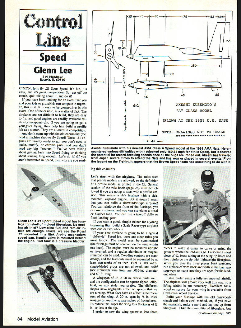 CMON lets fly 21 Sport Speed Its fun its easy its great competition So get off couch quit talking about it have looking event kids grandkids can compete togeth er easy competitive event easiest matter fact airplanes difficult build easy fly good engines readily available rel atively inexpensively going get youngster flying help him build profile job starter allowed competition dont come up old excuse need machine shop fly Speed 21 en gines usually ready go dont need make modift chrome parts dont need big secrets Youve talking about getting back Speed flying thinking about starting long enough Lets arent interested Speed readV0 0 j35 }..ICO 5 - 45 &610 -40K 4 t 4-0 26 AKESHI KUSUMOTOS CLASS MODEL FLOWN AT THE 1989 US NATS NOTE DRAWINGS NOT TO SCALE Akeshi Kusumoto newest AMA Class Speed modei 1989 AMA Nets en countered various difficuitles ciocked oniy 16065 mph 4th Open showed potentiai record-breaking speeds once aii bugs ironed out Akeshi has traveled Japan several times attend Nats has won pieced severai events iegend T-shirt appears Brown Speed team something ing column Lets start airplane rules state profile models allowed definition profile model printed CL General section rule book page 26 must fol lowed going start profile ver sion means slab fuselage sidemounted exposed engine doesn t mean can build sidewinder-type airplane can reinforce front fuselage can use spinner can use either metal bladder tank can use takeoff dolly fixed landing gear want good simple trainer young beginning flier build Scale Racer-type airplane two wheels new airplane going typical old-style Speed job other rules must follow model must symmetrical fuselage must centered wing within inch engine must mounted upright inverted regular aluminum magne sium pan can used Two-line controls man datory lead-outs must separated least two-tenths inch Fuel 10% nitro single-bladed props allowed solid stranded wire lines 016-in diameter 60 ft long wingspan 16 20 works quite well configuration can square-tipped ellip tical style prefer different shapes have negligible effect speeds turning What does have effect thick ness wing 20-in span A-in-thick wing gives five square inches frontal area reduce taper wing thickness /8 less tip prefer saw wing spanwise three pieces make easier carve grind grooves lead-outs go also use short piece %2 brass tubing wing tip holes reinforce tip lightweight fiberglass glue three pieces back together run piece wire back forth line pas sageways make sure open lead out wires also prefer using fully symmetrical airfoil airplane will groove very well way lifting airfoil necessary Excellent bass wood spruce wing available Craftsman Wood Service Build fuselage old basswoodcrutch-and-helmet-cowl method have materials make mold lay up fiberglass like durability fiberglass Continued page 188 84 Model Aviation Control Line Speed Glenn Lee 819 Mandrake Batavia IL 60510 Gienn Lees 21 Sport Speed modei has fuse lage top sheil moided fibergiass No cool ing air inlet Low-nitro fuel ram-air take enough inside see Rossi 21 mounted Nick Arpino magnesium speed pen Needle valve mounted behind engine Fuel tank pressure bladder MINI-ELECTRIC MINI POWER AT ITS BEST LIGHT WEIGHT S $1495 ngage disengage Free ocladed snapo onto motor ISY-lO 7 1 gear ratio Wheeing 19 grams NY-70R Same H'7t bat Disconnects Slide HY-70 as, Kv-42 Improved version HY-48 Apprc QUIET ANT START COST TEMSCHAERIES $2495EFC-599 Props Charge Cord aridLow coot Quick ChargEght Batteries Rs spacers etcl4 D type hattedes Ir $2795 FC-492 Remote Battery HolderIdeal accaratelyry VL Flight Batt0iy sf above add $350Above clrargVL Field box $3295 FLIGHT BATrERIES B-62 IHY-70 2 x 50 mA-Hr..$ 995 tery SJ-5 SwitchB-53 IHY-701 3 ii 50 mA-Hr 95 ractionsB33L lIY-42l 3 x t 10 mA-Hr 12P5 B-341 IHY421 4 ii 110 nJ~Hr 1595 B13L IHY-421 3 e iBO mA-Hr QIAI IUVA9i 155 naifr 45 grams1595 - r640ramo1295 very top column CL Speed/Lee Continued page 84 its lot work make mold Maybe will good item future column sure make stabilizer large enough will affect speed sure helps stabil ity stabs use 9-in span 3-in cen ter chord made out %-in very hard balsa Balsa stiffer basswood doesnt warp like plywood also prefer build V-shaped stab ie dihedral keep tips getting scarfed up landing pretty well covers airplane now lets look engine have modelers area running gas-powered RC cars RC boats go see what using engines several excellent 21s market have seen comparable speeds several different brands can find good-looking good-feeling used engine go ahead try Usually repairs needed new bearings maybe new piston get back condition buy new engine dont overload running big prop modem ABC alu minum piston running chromed brass liner RMcM engines built rev high rpm ,oflhIy fljPnr I 47443 PIPER TRI-PACER 2022 span Plans 5 HD PG Cowl 0 Partial kit 5 Alum bar stock machined wing strut fillings $4000 112 piece seti buy sell build Custom Craft Scale RIC Aircraft TRUE HAPPINESS IS BUILDING AND FLYING PIPER TRI-PACER Send check Carl V MIller 130 Yucca Drive Sedona AZ 86336 282-4810 need break-in will dam aged 10%-nitro fuel insist run ning use 7 x 4 6 x 6 prop still ex perimenting props seems 6- 6-in diameter 6-in pitch works best takes good prop pull two big wires around like fairly wide blade best speeds have 6 x 6 cut down fi berglass copy 7 x 6 Tornado have flown several brands 10%-nitro RC fuel seem run OK Since running low-nitro fuel must raise engines compression ratio right Wrong stock heads fine fact might go faster decrease compression using head gaskets various thicknesses Get few spare head gaskets fly Experiment little should find out what head clearance use dif ferent weather conditions butcher engine attempts porting polishing grinding other secret methods hop-up Fly several times first stock condition doesnt go fast think reasons biggestand almost secret proper sleeve-and-piston fit sleeve bore should round should tapered piston fits loose bottom stroke squeaky tight top best ABC en gi