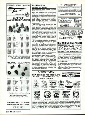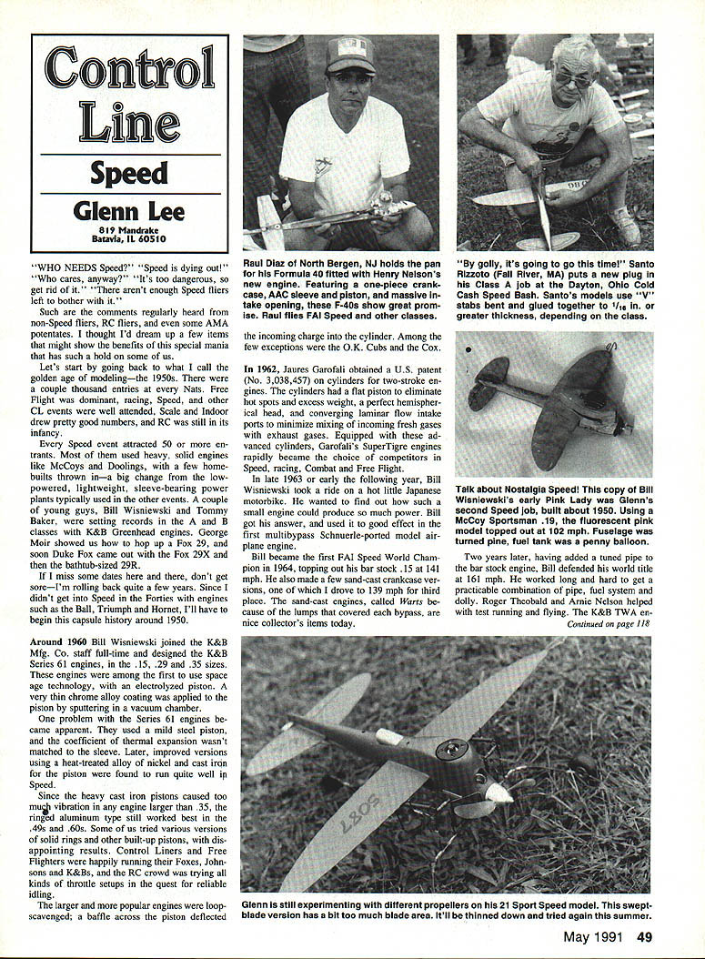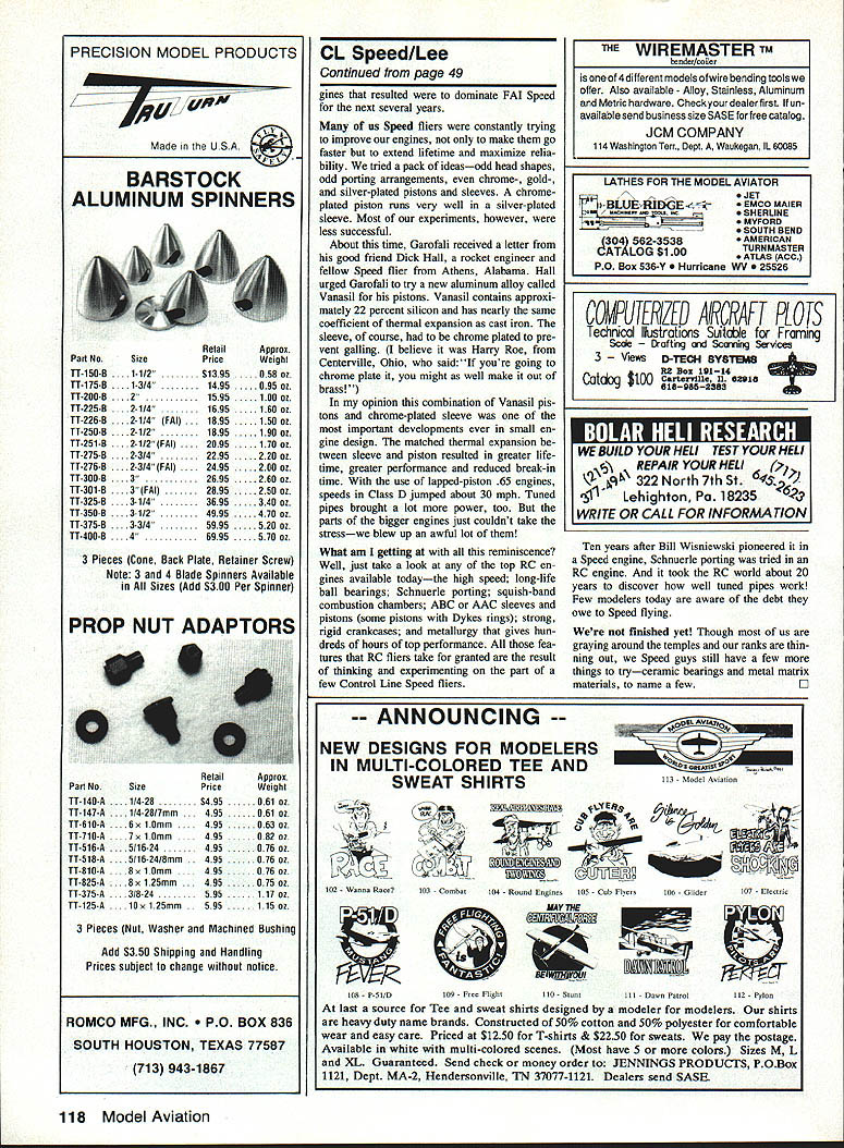 WHO NEEDS Speed Speed dying out cares anyway Its too dangerous get rid arent enough Speed fliers left bother Such comments regularly heard non-Speed fliers RC fliers some AMA potentates thought Id dream up few items might show benefits special mania has such hold some us Lets start going back what call golden age modelingthe 1950s couple thousand entries Nats Free Flight dominant racing Speed other CL events well attended Scale Indoor drew pretty good numbers RC still its infancy Speed event attracted 50 en trants Most used heavy solid engines like McCoys Doolings few home builts thrown ina big change lowpowered lightweight sleeve-bearing power plants typically used other events couple young guys Bill Wisniewski Tommy Baker setting records B classes K&B Greenhead engines George Moir showed us hop up Fox 29 soon Duke Fox came Out Fox 29X bathtub-sized 29R miss some dates dont get soreIm rolling back quite few years Since didnt get Speed Forties engines such Ball Triumph Hornet Ill have begin capsule history around 1950 incoming charge cylinder Among few exceptions OK Cubs Cox 1962 Jaures Garofali obtained US patent No 3038457 cylinders two-stroke en gines cylinders flat piston eliminate hot spots excess weight perfect hemispher ical head converging laminar flow intake ports minimize mixing incoming fresh gases exhaust gases Equipped ad vanced cylinders Garofalis SuperTigre engines rapidly became choice competitors Speed racing Combat Free Flight late 1963 early following year Bill Wisniewski took ride hot little Japanese motorbike wanted find out such small engine could produce much power Bill got answer used good effect first multibypass Schnuerle-ported model air plane engine Bill became first FAI Speed World Cham pion 1964 topping out bar stock 15 141 mph also made few sand-cast crankcase ver sions drove 139 mph third place sand-cast engines called Warts cause lumps covered bypass nice collectors items today Two years later having added tuned pipe bar stock engine Bill defended world title 161 mph worked long hard get practicable combination pipe fuel system dolly Roger Theobald Arnie Nelson helped test running flying K&B TWA enContinued page 118 Around 1960 Bill Wisniewski joined K&B Mfg Co staff full-time designed K&B Series 61 engines 15 29 35 sizes engines among first use space age technology electrolyzed piston very thin chrome alloy coating applied piston sputtering vacuum chamber problem Series 61 engines came apparent used mild steel piston coefficient thermal expansion wasnt matched sleeve Later improved versions using heat-treated alloy nickel cast irn piston found run quite well ip Speed Since heavy cast iron pistons caused too mui vibration engine larger 35 ringed aluminum type still worked best 49s 60s Some us tried various versions solid rings other built-up pistons dis appointing results Control Liners Free Flighters happily running Foxes Johnsons K&Bs RC crowd trying kinds throttle setups quest reliable idling larger popular engines loopscavenged baffle across piston deflected May 1991 49 Confrol Line Speed Glenn Lee 819 Mandrake Batavia IL 60510 Raul Diaz North Bergen NJ holds pan golly its going go time Santo Formula 40 fitted Henry Nelsons Rizzoto Fall River MA puts new plug new engine Featuring one-piece crank- Class job Dayton Ohio Cold case AAC sleeve piston massive in- Cash Speed Bash Santos models use V take opening F-40s show great prom- stabs bent glued together Il~ ise Raul flies FAI Speed other classes greater thickness depending class Talk about Nostalgia Speed copy Bill Wlsnlewskis early Pink Lady Glenns second Speed job built about 1950 Using Mccoy Sportsman 19 fluorescent pink model topped out 102 mph Fuselage turned pine fuel tank penny balloon Glenn still experimenting different propellers 21 Sport Speed model swept blade version has bit too much blade area Itll thinned down tried again summer PRECISION MODEL PRODUCTS fZZIIj Made U S BARSTOCK ALUMINUM SPINNERS Pan NoSize TT-150-B .. 1-1/2 11-175-B .. 1-314 11-200-B 11-225-B .. 2-1/4 11226-B .. 2-114 FAI . 11-250-B .. 2-1/2 11-251-B . 2FAI .. 11-275-B .. 2-3/4 11-276-B 3/4 FAt .. 11-300-B3 11-301-B3 FAt 11-325-B3-114 11-350-B.3-112 . 11-375-B.3-3/4 11-400-B4 RetailApprax PriceWeight $1395058 oz 1495095 ox 1595100 oz 1695160 oz 1895150 ez 1895190 oz 2095170 oz 2295220 oz 2495200 ox 2695260 oz 2895250 oz 3695340 oz 4995470 oz 5995520 oz 6995570 oz 3 Pieces Cone Back Plate Retainer Screw Note 3 4 Blade Spinners Available tn Stzes Add 53 00 Per Sptnner PROP NUT ADAPTORS Pan NoSize TT-140-A 114-28 11-147-A 1/4-28/7mm 11-610-A6x 10mm TT-710-A 0mm IT-SiB-A -24 TI-SiB-A5/16-24/8mm 11-810-AOx 1 0mm TT-825-AOx 1 25mm TT-375-A3/8-24 11-125-AlOx 125mm Retail Approx Price Weight $4 95 oz 495061 oz 495 . 063 az 495 082oz 495076oz 495076oz 495076oz 495 075 ez 595117 oz 595llSoz 3 Pieces Nut Washer arul Machined Bushing Add $350 Shipping Handling Prices subject change notice ROMCO MFG INC OX 836 SOUTH HOUSTON TEXAS 77587 713 943-1867 CL Speed/Lee Continued page 49 gines resutted dominate FAI Speed next several years us Speed fliers constantty trying improve engines make go faster extend lifetime maximize relia bility tried pack ideasodd head shapes odd porting arrangements chrome- gold- silver-plated pistons sleeves chromeplated piston runs very well silver-plated sleeve Most experiments however less successful About time Garofali received letter good friend Dick Hall rocket engineer fellow Speed flier Athens Alabama Hall urged Garofali try new aluminum alloy called Vanasil pistons Vanasil contains approxi mately 22 percent silicon has nearly same coefficient thermal expansion cast iron sleeve course chrome plated pre vent galling believe Harry Roe Centerville Ohio saidIf youre going chrome plate might well make out brass opinion combination Vanasil pis tons chrome-plated sleeve important developments ever small en gine design matched thennal expansion tween sleeve piston resulted greater life time greater performance 