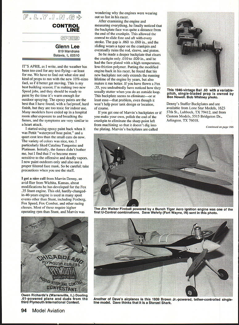 0w0g0ug0c CONTROL LINE LD Glenn Lee 819 Mandrake Batavia IL 60510 IT S APRIL write weather has too cool test-flyingat least have find out what size kind props run new 10%-nitro fuel Id better get moving best building season Im making two new Speed jobs should ready paint time its warm enough outdoor spraying epoxy paints best have found fuelproof hard finish too toxic indoor use modelers have ended up hospital room after exposure breathing fumes symptoms very similar heart attack started using epoxy paint back Pettit waterproof boat paint quart cost less small cans now variety colors nice too particularly liked Catalina Turquoise Platinum Initially fumes didnt bother find Ive become sensitive offensive deadly vapors now paint outdoors also use proper filtered face mask So careful take precautions use stuff got nice call Marvin Denny avid flier Wichita Kansas about modifications has developed Fox 35 Stunt engine old hardly-changed in-40-years engine used sport events other Stunt including Foxberg Fox Speed Fox Combat other racing classes Most require higher operating rpm Stunt Marvin wondering engines wearing out fast racer After examining engine measuring everything finally noticed backplate face quite distance end crankpin allowed conrod slide fore aft stroke gap 060 090 sliding wears taper crankpin eventually ruins rod sleeve piston So made deeper backplate clears crankpin 010 020 face plated high-temperature low-friction polymer Putting modified engine back racer found new backplate extends running lifetime engine years also makes run better have flown Fox 35 undoubtedly have noticed usually stutter outside loop backplate seems eliminateor least easethat problem though wont help poor tank design location course get Marvins backplates make own polish end crankpin eliminate sharp point left machining doesnt dig plating Marvins backplates called Dennys Stuffer Backplates available Lone Star Models 1623 57th St Lubbock TX 79412 Custom Models 5515 Bridgeton Dr Arlington TX 76018 Continued page 166 94 Model Aviation 1946-vintage BaIl 60 variable pitch single-bladed prop owned Ben Nowell Bob Whitney photo .a Jim Walker eball powered Bunch Tiger Aero ignition engine w uiw ui first U-Control combinations Dave Wehrly Fort Wayne IN sent photo Owen chardss Warrenville IL Dooling 61-powered plane duds third Plymouth International Contest Another ot uaves airpianes mis ii drown Jr-powered tether-controlled singleline model Dave thinks Stanzel Shark Its Easy SNl A Safety Starter Safe one-push starting Recommended John Prestons Safety Comes First column Model vat/on Nov 90 Easy assemble battery starter $6495 Accomodates small 12-volt batteiy r sizes available ~1 Add $700 packaging ohlppin IUPS Texas residents add 825% sales tax Allow approsimately two weeks tsr delivery Guardian display Louis Matustik St Louis Missouri sent photos other information Grumman AF-2S Guardian found Pima Air Museum Tucson Arizona venerable Guardian once dominant model aircraft CL Navy Carrier competition because its availability Sterling kit display form acquired retirod Forest Service used fire bomber torpedo bay enlarged slightly accommodate tanks fire retardant its colors battled forest fires submarines Otherwise appears excellent example Guardian has often modeled dont know Guardians still around cant very ani aware either display flying Guardian lovers might want stop give pat during travels through Arizona Pima Air Museum outstanding museum well worth visit anyone area located south Davis Monthan Air Force Base Information may obtained writing calling Tucson Air Museum Foundation 6000 East Valencia Tucson AZ 85706 telephone 605 574-9658 peed/Lee Continued page 94 knew about problem Foxes back 1950s forgotten about best Fox has aluminum backplate made back works just fine plating Dick Adams Adams Actuator fame used make music-wire spring put wrist pin would hold conrod forward tricky difficult assemble new backplate better could bolt glue Micarta nylon washer proper thickness existing Just make sure bolts sealed Formula Fox Speed will flown next Dayton Cold Cash Speed Bash want try low-key Speed event should get work airplane Two modelers wrote about picture Topping all-aluminum Speed job shown January column Jerry Greaves Newtown Connecticut first point out model shown upside down said never flew it gave him electric shocks through aluminum body through spark plug Norman Schehl antique engine airplane collector Lexington Ohio wrote pointed out inverted photo sent copies instructions came kit titled An Instruction Guide Various Engine Installations Topping 100 show methods install DeLong 30 Hornet 60 Forster 29 Ohlsson 23 OK Super 60 Ohlsson 60 Atwood Champion Vivell 35 engines mounted aluminum bracket bolted front body Atwood Ohlsson OK Hornet held top two backplate screws No wonder few airplanes survive vibration variable engine incidence took quite toll music-wire landing gear bolted same engine bracket extended forward Streamlined wheels used front small wheel bolted tip rudder tail support Red plastic wing tips furnished aluminum spinner completed fuselage three bladed prop used dont know diameter pitch spark ignition coil small wet cell used up lot space fuselage much room left fuel tank Some engines small plastic tank mounted rear others used small metal tanks gasoline-oil fuel mixture gave excellent mileage didnt need much fuel airplane must have bear flythe elevator control horn shown plan less It6 long must have bit sensitive airplane always wanted never got McCoy Invader allaluminum job McCoy 19 time 10 bucks werent being sold first engine plain-bearing McCoy 19 neighbor Merwyn Krahn helped start flogged prop several days finally ran few seconds enough seat rings started quite easily after Merwyn brother big engines McCoy 29s 60s flew few contests held South Dakota back used hot fuel Franciscosthe stuff nitrobenzene smelled like shoe polishand mixed super fuel Ohlsson 30 Plus didnt dare use 30 Plus straight