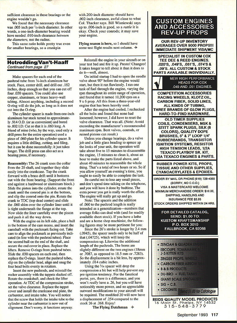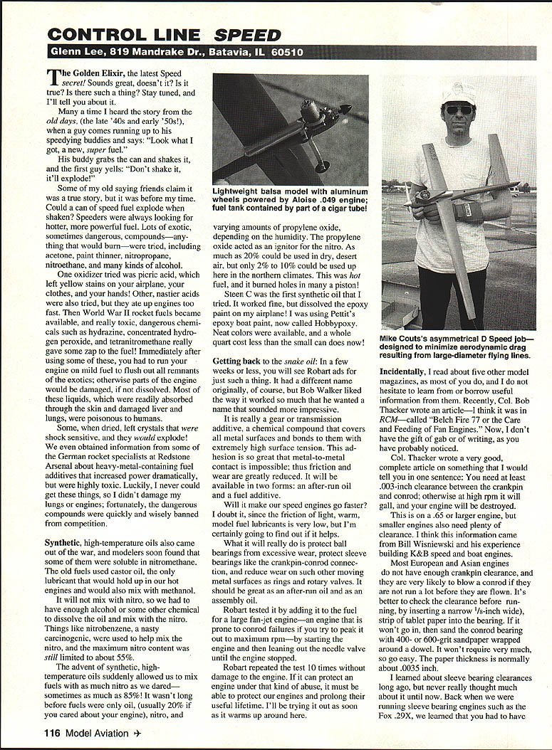 CONTROL LINE SPEED B EI [ Lieu Golden Elixir latest Speed secret Sounds great doesnt it true such thing Stay tuned Ill tell about time heard story old days late 40s early 50s guy comes running up speedying buddies says Look what got new super fuel buddy grabs can shakes first guy yells Dont shake itll explode Some old saying friends claim true story before time Could can speed fuel explode shaken Speeders always looking hotter powerful fuel Lots exotic sometimes dangerous compoundsany thing would bumwere tried including acetone paint thinner nitropropane nitroethane kinds alcohol oxidizer tried picric acid left yellow stains airplane clothes hands Other nastier acids also tried ate up engines too fast World War II rocket fuels became available really toxic dangerous chemi cals such hydrazine concentrated hydro gen peroxide tetranitromethane really gave some zap fuel Immediately after using some run engine mild fuel flush out remnants exotics otherwise parts engine would damaged dissolved Most liquids readily absorbed through skin damaged liver lungs poisonous humans Some dried left crystals shock sensitive would explode obtained information some German rocket specialists Redstone Arsenal about heavy-metal-containing fuel additives increased power dramatically highly toxic Luckily never could get things didnt damage lungs engines fortunately dangerous compounds quickly wisely banned competition Synthetic high-temperature oils also came out war modelers soon found some soluble nitromethane old fuels used castor oil lubricant would hold up hot engines would also mix methanol will mix nitro have enough alcohol some other chemical dissolve oil mix nitro Things like nitrobenzene nasty carcinogenic used help mix nitro maximum nitro content still limited about 55% advent synthetic hightemperature oils suddenly allowed us mix fuels much nitro dared sometimes much 85% wasnt long before fuels oil usually 20% cared about engine nitro varying amounts propylene oxide depending humidity propylene oxide acted ignitor nitro As much 20% could used dry desert air 2% 10% could used up northern climates hot fuel burned holes piston Steen C first synthetic oil tried worked fine dissolved epoxy paint airplane using Pettits epoxy boat paint now called Hobbypoxy Neat colors available whole quart cost less small can does now Getting back snake oil few weeks less will see Robart ads just such thing different name originally course Bob Walker liked way worked much wanted name sounded impressive really gear transmission additive chemical compound covers metal surfaces bonds extremely high surface tension ad hesion great metal-to-metal contact impossible thus friction wear greatly reduced will available two forms after-run oil fuel additive Will make speed engines go faster doubt since friction light warm model fuel lubricants very low Im certainly going find out helps What will really protect bail bearings excessive wear protect sleeve bearings like crankpin-conrod connec tion reduce wear such other moving metal surfaces rings rotary valves should great after-run oil assembly oil Robart tested adding fuel large fan-jet enginean engine prone conrod failures try peak out maximum rpmby starting engine leaning out needle valve until engine stopped Robart repeated test 10 times damage engine can protect engine under kind abuse must able protect engines prolong useful lifetime Ill trying out soon warms up around Incidentally read about five other model magazines hesitate leam borrow useful information Recently Col Bob Thacker wrote articleI think RCMcalled Belch Fire 77 Care Feeding Fan Engines Now dont have gift gab writing have probably noticed Col Thacker wrote very good complete article something would tell sentence need least 003-inch clearance between crankpin conrod otherwise high rpm will gail engine will destroyed 65 larger engine smaller engines also need plenty clearance think information came Bill Wisniewski experience building K&B speed boat engines Most European Asian engines have enough crankpin clearance very likely blow conrod run lot before flown Its better check clearance before run ning inserting narrow 1/8-inch wide strip tablet paper bearing wont go sand conrod bearing 400- 600-grit sandpaper wrapped around dowel wont require very much go easy paper thickness normally about 003 5 inch learned about sleeve bearing clearances long ago never really thought much about until now Back running sleeve bearing engines such Fox 29X learned have 116 Model Aviation weignt oaisa model aluminum wheels powered Aloise 049 engine fuel tank contained part cigar tube Mike Coutss asymmetrical D Speed job designed minimize aerodynamic drag resulting large-diameter flying lines suffcient clearance bearings engine wouldnt go found necessary clearance 005 inch per /2-inch diameter other words one-inch-diameter bearing would have needed 010-inch clearance between diameters radius same ratio holds pretty true smaller bearings crankpin HotroddinglVantHaaff Continued page 27 Make spacers end pushrod tube -inch aluminum bar stock Face center drill drill out 182 inches deep enough can cut off four 030 spacers could also use copper aluminum brass heavy-wall tubing Almost anything including second 0-ring will job long does cut 0-ring cylinder spacer made one-inch aluminum bar stock turned approximate ly 914 0D convenient bored 802 ID Cut 060 long friend way used drill press entire operation used piece 060 plate cylinder spacer requires little drilling cutting filing can done successfully just takes longer drill press can also act bearing press necessary Reassembly The 26 crank uses collar 20 shaft together slide easily crankcase Tap crank forward brass drift until bottoms out front bearing Support front end against hardwood aluminum block Slide piston cylinder rotate crank until conrod pin bottom slip conrod onto pin Rotate crank TDC top dead center slide 060 shim over cylinder liner until tight underneath flange top Now slide line