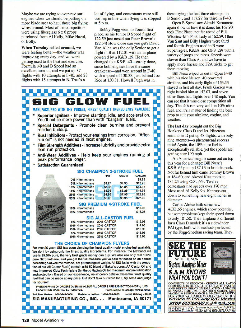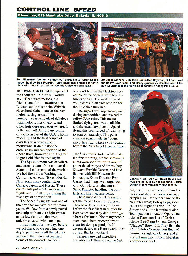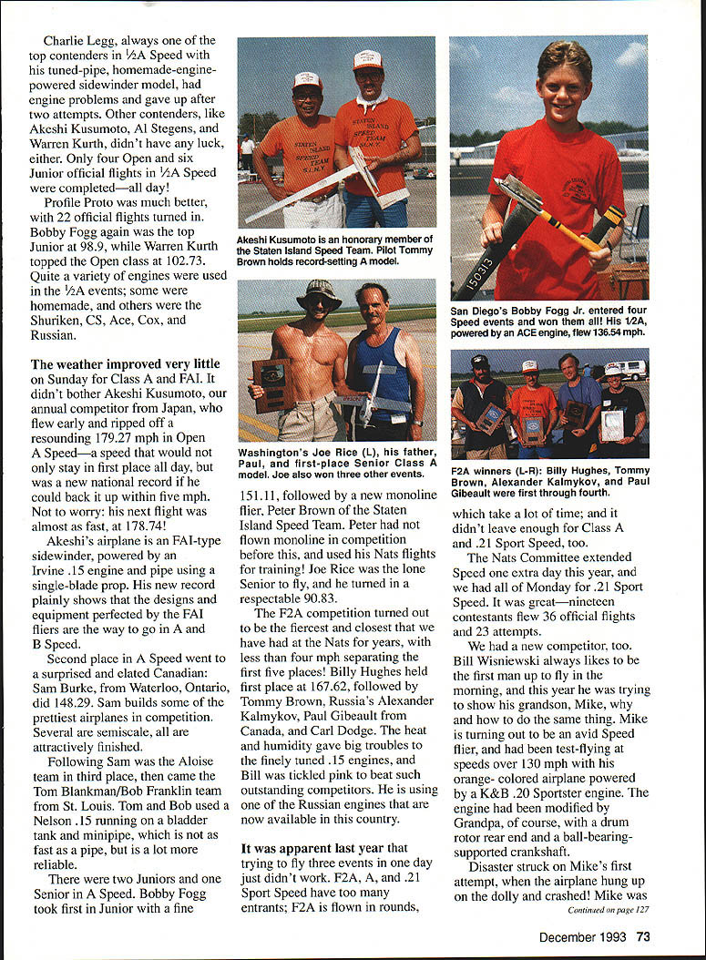 CONTROL LINE SPEED IF WAS ASKED what impressed about 1993 Nats would say Heat watermelons old friends fun airfield Lawrenceville sits Wabash river flood plain best melon-raising areas countryso truckloads delicious watermelons muskmelons other fruit seen everywhere flat hot Almost central southern part US hot mid-July first couple days year almost meltdowns didnt stop enthusiasm camaraderie Speed fliers however its great greet old friends once again Speed turnout excellent entrants came over States other parts world fliers Washington California Arizona Texas Florida New York central states Canada Japan Russia contestants put 231 successful flights 112 attempts during five days competition Speed flying site best have years flew newly paved taxi strip slight crown few tiedowns quickly covered duct tape rained two days before got day pump water off pit area erect nylon net barriers Some concrete anchors wouldnt hold blacktop couple corners held trucks cars work crew volunteers did excellent job little time airport kept active during competition follow FAA rules meant limited flying area available extra day given Speed flying year forced official flying start Saturday put crimp some modelers plans since take extra vacation before Nats get time 1/2A events started little late first morning screaming mites soon whizzing around under alert eyes timers Roy Stewart Frankie Garzon Bud Brown Bill Nusz binoculars Event Director Fran Garzon things well organized Gail Nusz tabulator Santo Rizzotto handling pulltests line measurements unpaid volunteers rarely get recognition deserve have job before first flight until after last sometimes dont get break lunch people thank compliment doing good job anyone deserves Hero award So thanks workers Temperature incredible humidity took toll 1/2A engines 90s humidity about 98% everyone dripping wet Modelers came fly no matter what Bobby Fogg soon fine flight 13654 1/2A Junior little later Aloise Team put 14602 Open Aloise Team consists Carlos Aloise Bob Fogg Sr George Slugger Brown III flew ACE Aloise Competition Engine running single-blade prop straight minipipe fiberglass sidewinder model 72 Model Aviation Blankman Vernon Connecticut starts 21 Sport Speed Jet Speed winners L-R Mike Couts Bob Heywood Bill Nusz model held Bob Franklin Team Blankman finished tenth Bailey-Davis team Earl Bailey generously donated place 12749 mph Winner Connie Aloise turned 1 52 new jet engines fourth-place winner happy Mike Couts Connie Aloise won 21 Sport Speed ACE engine built husband Carlos Winning flight new AMA record Charlie Legg always top contenders 1/2A Speed tuned-pipe homemade-enginepowered sidewinder model engine problems gave up after two attempts Other contenders like Akeshi Kusumoto Al Stegens Warren Kurth didnt have luck either Only four Open six Junior official flights 1/2A Speed completedall day Profile Proto much better 22 official flights turned Bobby Fogg again top Junior 989 Warren Kurth topped Open class 10273 Quite variety engines used 1/2A events some homemade others Shuriken CS Ace Cox Russian weather improved very little Sunday Class FAI didnt bother Akeshi Kusumoto annual competitor Japan flew early ripped off resounding 17927 mph Open Speeda speed would stay first place day new national record could back up within five mph worry next flight almost fast 17874 Akeshis airplane FAI-type sidewinder powered Irvine 15 engine pipe using single-blade prop new record plainly shows designs equipment perfected FAI fliers way go B Speed Second place Speed went surprised elated Canadian Sam Burke Waterloo Ontario did 14829 Sam builds some prettiest airplanes competition Several semiscale attractively finished Following Sam Aloise team third place came Tom BlankmanlBob Franklin team St Louis Tom Bob used Nelson 15 running bladder tank minipipe fast pipe lot reliable two Juniors Senior Speed Bobby Fogg took first Junior fine 15111 followed new monoline flier Peter Brown Staten Island Speed Team Peter flown monoline competition before used Nats flights training Joe Rice lone Senior fly turned respectable 9083 F2A competition turned out fiercest closest have Nats years less four mph separating first five places Billy Hughes held first place 16762 followed Tommy Brown Russias Alexander Kalmykov Paul Gibeault Canada Carl Dodge heat humidity gave big troubles finely tuned 15 engines Bill tickled pink beat such outstanding competitors using Russian engines now available country apparent last year trying fly three events day just didnt work F2A 21 Sport Speed have too entrants F2A flown rounds take lot time didnt leave enough Class 21 Sport Speed too Nats Committee extended Speed extra day year Monday 21 Sport Speed greatnineteen contestants flew 36 official flights 23 attempts new competitor too Bill Wisniewski always likes first man up fly morning year trying show grandson Mike same thing Mike turning out avid Speed flier test-flying speeds over 130 mph orange- colored airplane powered K&B 20 Sportster engine engine modified Grandpa course drum rotor rear end ball-bearingsupported crankshaft Disaster struck Mikes first attempt airplane hung up dolly crashed Mike Continued page 127 December 1993 73 Akeshi Kusumoto honorary member Staten Island Speed Team Pilot Tommy Brown holds record-setting model San Diegos Bobby Fogg Jr entered four Speed events won 12A powered ACE engine flew 13654 mph Washingtons Joe Rice L father Paul first-place Senior Class model Joe also won three other events F2A winners L-R Billy Hughes Tommy Brown Alexander Kalmykov Paul Gibeault first through fourth 5 I Join Giants Help Promote iLJEfNon-CompetitiveI EUIJ _______ InIrpIonaI MoaIu.J*nca11 AccaIon IMAA membership includes quarterly magazine High Flight IMEMBERSHIP APPLICATiON IJ NEW RENEWAL Date19I Yearly Dues $1500 USA $2000 US Canada & Mexico $3000 US Elsewhere I Make CHECK MONEY ORDER Payable INTERNATIONAL MINIAlURE AIRCRAFT ASSOCIATION INC I Name ______________________________________ Ph ____