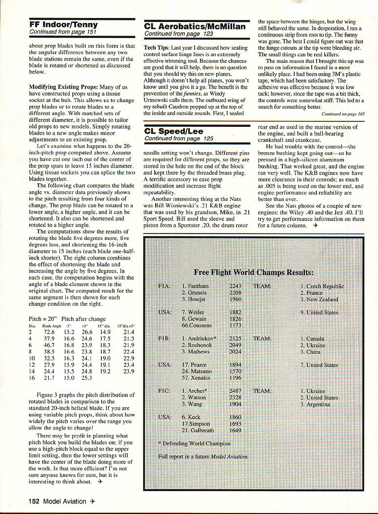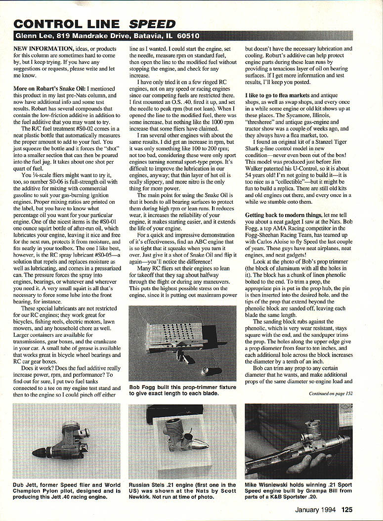 CONTROL LINE SPEED NEW INFORMATION ideas products column sometimes hard come keep trying have suggestions requests please write let know Robarts Snake Oil mentioned product last pre-Nats column now have additional info some test results Robart has several compounds contain low-friction additive addition fuel additive may want try RIC fuel treatment #50-02 comes neat plastic bottle automatically measures proper amount add fuel just squeeze bottle forces shot smaller section can poured fuel jug takes about shot per quart fuel -scale fliers might want try too number 50-06 full-strength oil additive mixing commercial gasoline suit gas-burning ignition engines Proper mixing ratios printed label have know what percentage oil want particular engine nicest items #50-01 ounce squirt bottle after-mn oil lubricates engine leaving nice free next run protects moisture fits neatly toolbox like best however RC spray lubricant #50-05a solution repels replaces moisture well lubricating comes pressurized can pressure forces spray engines bearings whatever wherever need very small squirt thats necessary force some lube front bearing instance special lubricants restricted RC engines work great bicycles fishing reels electric motors lawn mowers household chore well Larger containers available transmissions gear boxes crankcase car small tube grease available works great bicycle wheel bearings RC car gear boxes Does work Does fuel additive really increase power rpm performance find out sure put two fuel tanks connected tee engine test stand engine could pinch off either line wanted could start engine set needle measure rpm standard fuel open line modified fuel stopping engine check increase have tried few ringed RC engines speed racing engines since competing fuels restricted first mounted OS 40 fired up set needle peak rpm lean opened line modified fuel some increase nothing like 1000 rpm increase some fliers have claimed ran several other engines about same results did get increase rpm something like 100 200 rpm too bad considering sport engines turning normal sport-type props Its difficult improve lubrication engines anyway thin layer hot oil really slippery intro thing power main point using Snake Oil bonds bearing surfaces protect during high rpm lean runs reduces wear increases reliability engine makes starting easier extends life engine quick impressive demonstration its effectiveness find ABC engine tight squeaks tura over Just give shot Snake Oil flip againyoull notice difference RC fliers set engines lean takeoff sag about halfway through flight during maneuvers puts highest possible stress engine since putting out maximum power doesnt have necessary lubrication cooling Robarts additive can help protect engine parts during lean runs providing tenacious layer oil bearing surfaces get information test results Ill keep posted like go flea markets antique shops well swap shops once some engine old kit shows up places Sycamore Illinois thresheree antique gas-engine tractor show couple weeks ago always have flea market too found original kit Stanzel Tiger Shark g-line control model new conditionnever out box model produced just before Jim Walker patented U-Control about 54 years old Im going build itit too nice coliectiblebut might fun build replica still old kits old engines out once stumble onto Getting back modem things let tell about neat gadget saw Nats Bob Fogg top AIvIA Racing competitor Fogg-Sheehan Racing Team has teamed up Carlos Aloise fly Speed last couple years guys have neat airplanes neat engines neat gadgets Look photo Bobs prop trimmer block aluminum holes block has chunk linen phenolic bolted end trim prop appropriate pin put prop hub pin inserted desired hole tips prop extend beyond phenolic block sanded off leaving blade same length sanding block rubs against phenolic very wear resistant stays square end sandpaper trims prop holes along upper edge give prop diameter four ten inches additional hole across block increases diameter tenth inch Bob can trim prop certain diameter wants make additional props same diameter engine load January1994 125 Bob Fogg built prop-trimmer fixture give exact length blade Continued page 1S2 Dub Jett former Speed flier World Champion Pylon pilot designed producing Jett 40 racing engine Russian Stels 21 engine first US shown Nats Scott Newkirk run time photo Mike Wisniewski holds winning 21 Sport Speed engine built Grampa Bill parts K&B Sportster 20 FF Indoor/Tenny Continued page 151 about prop blades built form angular difference between two blade stations remain same blade rotated shortened discussed below Modifying Existing Props us have constructed props using tissue socket hub allows us change prop blades rotate blades different angle matched sets different diameter possible tailor old props new models Simply rotating blades new angle makes minor adjustments existing prop Lets examine what happens 20inch-pitch prop computed above Assume have cut inch out center prop spars leave 15 inches diameter Using tissue sockets can splice two blades together following chart compares blade angle vs diameter data previously shown pitch resulting four kinds change prop blade can rotated lower angle higher angle can shortened also can shortened rotated higher angle computations show results rotating blade five degrees five degrees less shortening 16-inch diameter 15 inches blade one-halfinch shorter right column combines effect shortening blade increasing angle five degrees case computation begins angle blade element shown original chart computed result same segment shown change condition right CL AerobaticslMcMillan Continued page 123 Tech Tips Last year discussed sealing control surface hinge lines extremely effective trimming tool Because chances good will help no question should try new planes Although doesnt help planes wont know until give go benefit prevention funnies Windy Urtnowski calls outboard wing rebuilt Caudron popped up top inside outside rounds First 