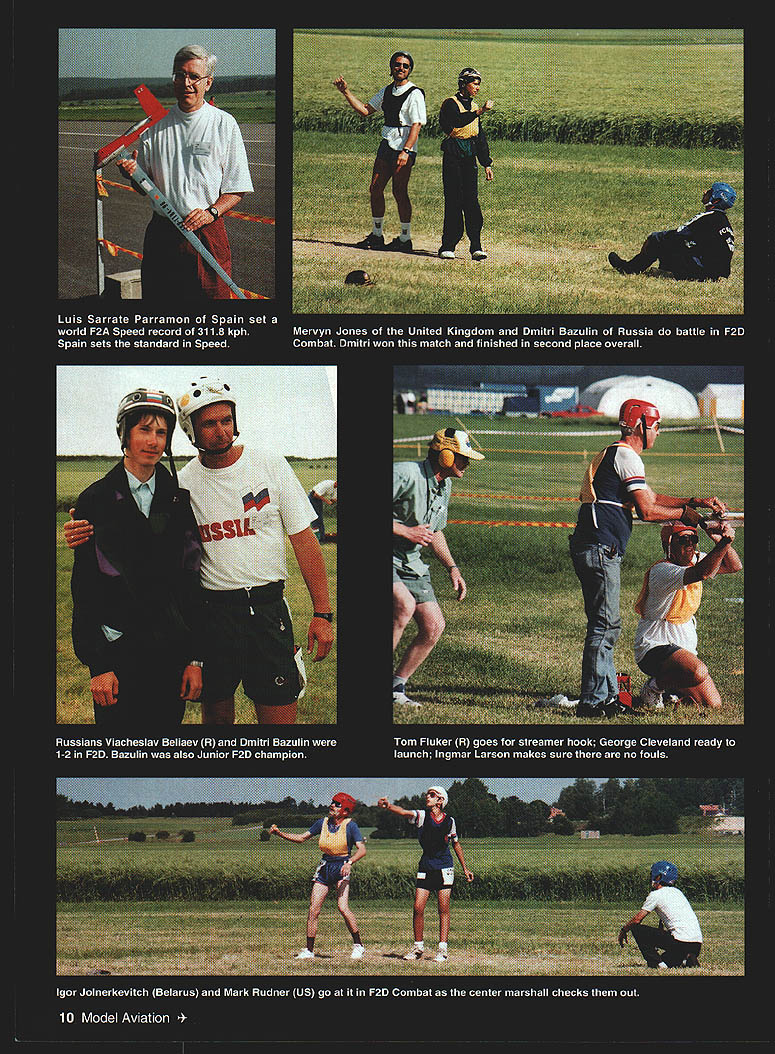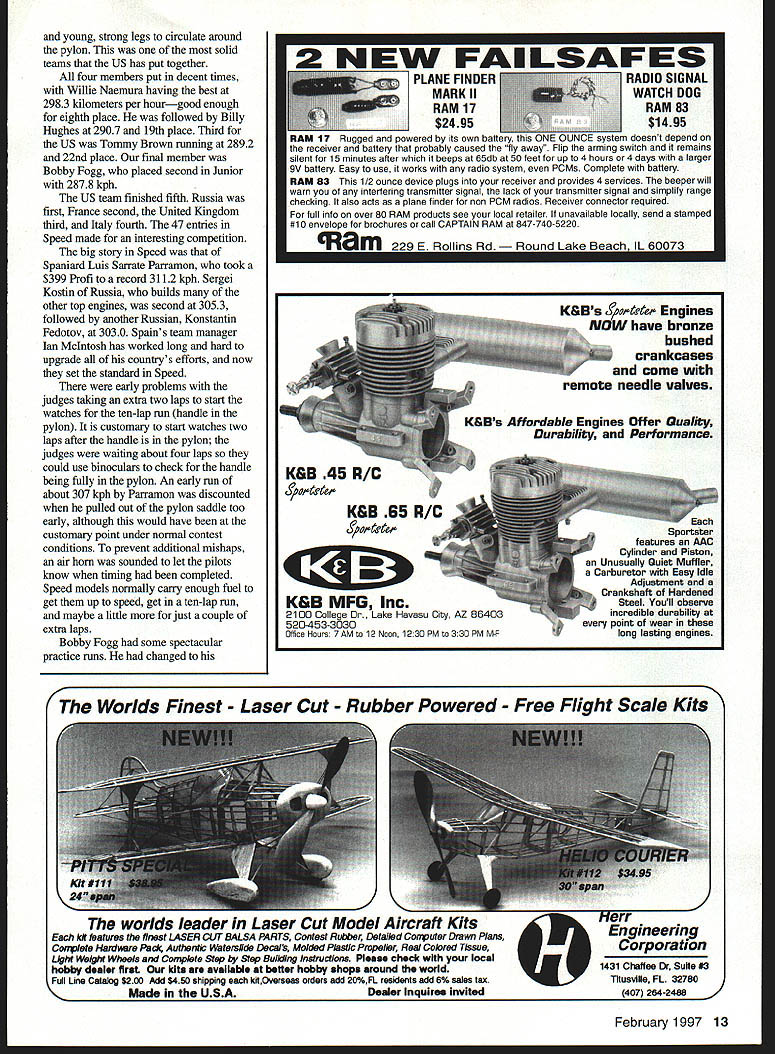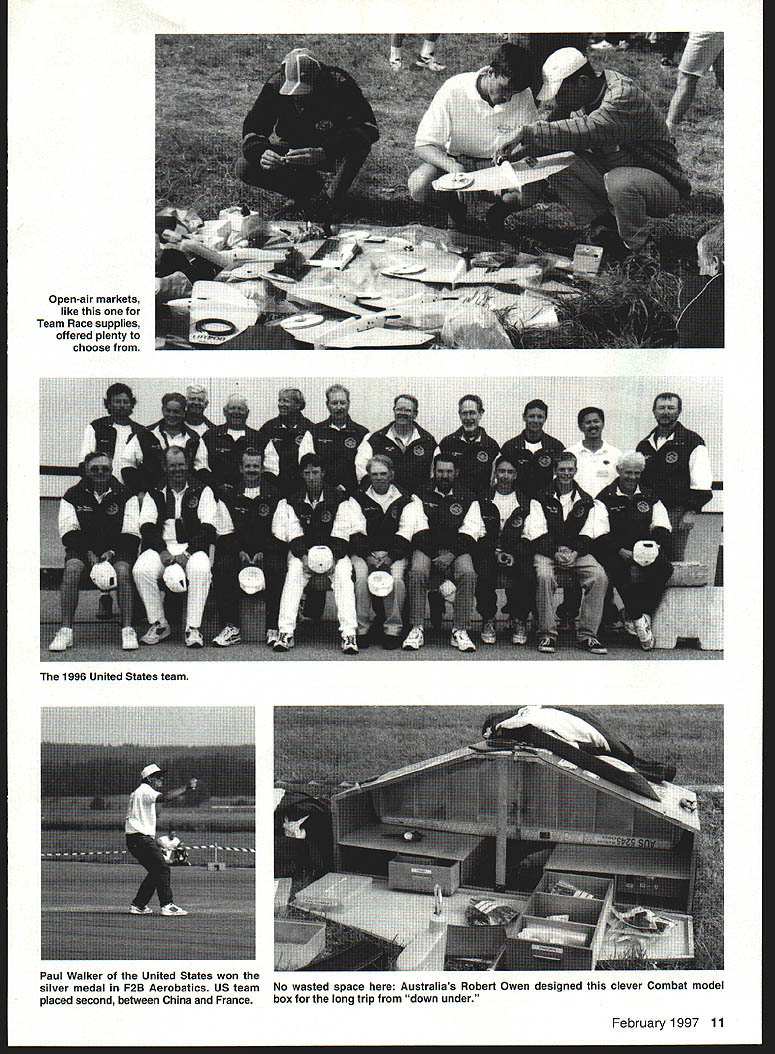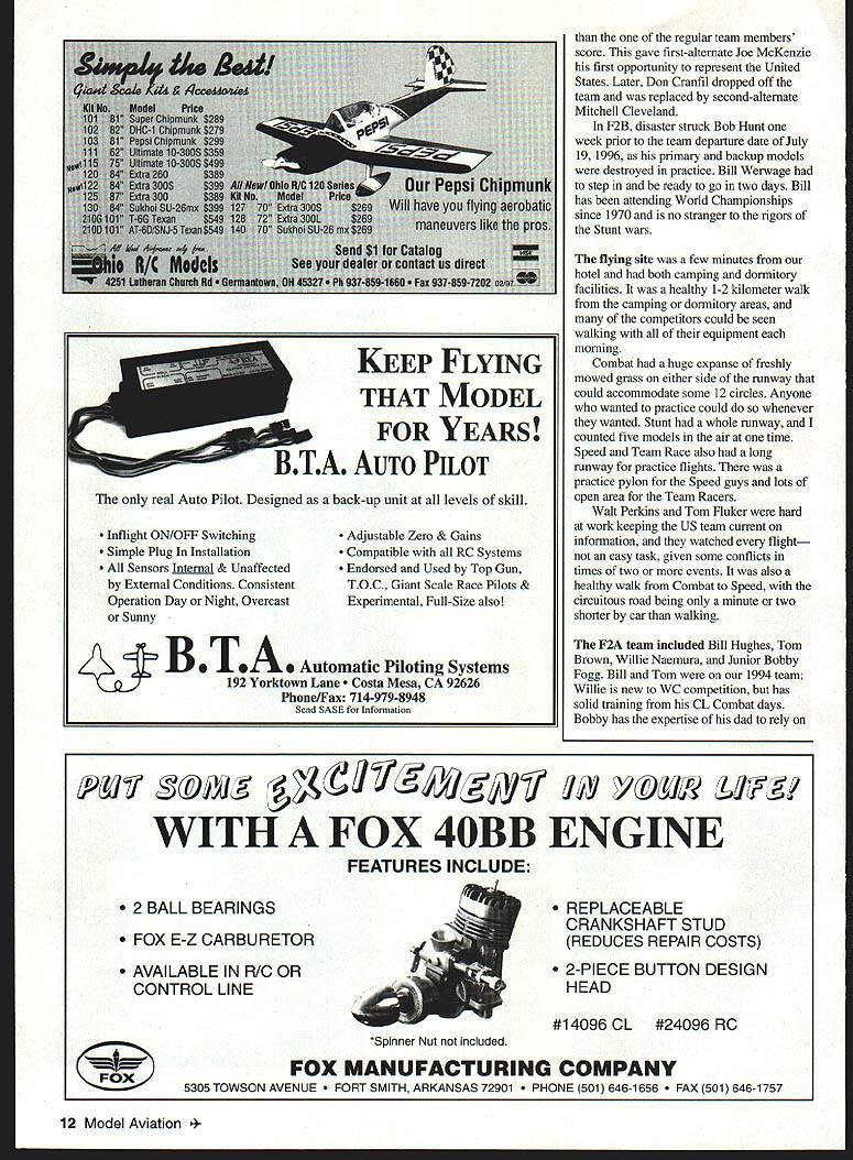 NO OCR TEXT NO OCR TEXT NO OCR TEXT Open-air markets like Team Race supplies offered plenty choose February 1997 11 1996 United States team Paul Walker United States won silver medal F2B Aerobatics US team No wasted space Australias Robert Owen designed clever Combat model placed second between China France box long trip down under THAT MODEL FOR YEARS TA AUTO PILOT oniy real Auto Pilot Designed back-up unit levels skill Inflight ON/OFF Switching Simple Plug Installation Sensors Internal & Unaffected External Conditions Consistent Operation Day Night Overcast Sunny Adjustable Zero & Gains Compatible RC Systems Endorsed Used Top Gun TOC Giant Scale Race Pilots & Experimental Full-Size also Automatic Piloting Systems 192 Yorktown Lane a Mesa CA 92626 Phone/Fax 714-979-8948 Send SASE Information the regular team members score gave first-alternate Joe McKenzie first opportunity represent United States Later Don Cranfil dropped off team replaced second-alternate Mitchell Cleveland F2B disaster struck Bob Hunt week prior team departure date July 19 1996 primary backup models destroyed practice Bill Werwage step ready go two days Bill has attending World Championships since 1970 no stranger rigors Stunt wars flying site few minutes hotel both camping dormitory facilities healthy 1-2 kilometer walk camping dormitory areas competitors could seen walking equipment morning Combat huge expanse freshly mowed grass either side runway could accommodate some 12 circles Anyone wanted practice could whenever wanted Stunt whole runway counted five models air time Speed Team Race also long runway practice flights practice pylon Speed guys lots open area Team Racers Walt Perkins Tom Fluker hard work keeping US team current information watched flight easy task given some conflicts times two events also healthy walk Combat Speed circuitous road being minute two shorter car walking F2A team included Bill Hughes Tom Brown Willie Naemura Junior Bobby Fogg Bill Tom 1994 team Willie new WC competition has solid training CL Combat days Bobby has expertise dad rely WITH FOX 4OBB ENGINE 2 BALL BEARINGS FOX E-Z CARBURETOR AVAILABLE IN RIO OR CONTROL LINE REPLACEABLE CRANKSHAFT STUD REDUCES REPAIR COSTS 2-PIECE BUTTON DESIGN HEAD #14096 CL #24096RC *Splnner Nut included FOX MANUFACTURING COMPANY 0 FOX 53O5TOWSON AVENUE SMITH ARKANSAS 72901 E 501 646-1656 501 646-1757 12 Model Aviation FLYING FEATURES INCLUDE young strong legs circulate around pylon solid teams US has put together four members put decent times Willie Naemura having best 2983 kilometers per hourgood enough eighth place followed Billy Hughes 2907 19th place Third US Tommy Brown running 2892 22nd place final member Bobby Fogg placed second Junior 2878 kph US team finished fifth Russia first France second United Kingdom third Italy fourth 47 entries Speed made interesting competition big story Speed Spaniard Luis Sarrate Parramon took $399 Profi record 3112 kph Sergei Kostin Russia builds other top engines second 3053 followed another Russian Konstantin Fedotov 3030 Spains team manager Ian McIntosh has worked long hard upgrade countrys efforts now set standard Speed early problems judges taking extra two laps start watches ten-lap run handle pylon customary start watches two laps after handle pylon judges waiting about four laps could use binoculars check handle being fully pylon An early run about 307 kph Parramon discounted pulled out pylon saddle too early although would have customary point under normal contest conditions prevent additional mishaps air horn sounded let pilots know timing completed Speed models normally carry enough fuel get up speed get ten-lap run maybe little just couple extra laps Bobby Fogg some spectacular practice runs changed February 1997 13 K&Bsei Engines NOW have bronze bushed crankcases come remote needle valves K&Rs Affordable Engines Offer Gualfty DurabiliCy Performance Sportater features AAC Cylinder Piston Unusually Quiet Muffler Carburetor Easy Idle Adjustment Crankshaft Hardened Steel Youll observe incredible durability paint wear long lasting engines K&B 45 A/C K&B 65 A/C K&B MFG Inc 2100 College Lake Havesu City AZ 86403 520-453-3030 Office Hours 7AM 12 Noon 1230 PM 330 PM M-F K Worlds Finest Laser Cut Rubber Powered Free Flight Scale Kits K_ worlds leader Laser Cut Model Aircraft Kits kIt features finest LASER CUT BALSA PARTS Contest Rubber Detailed Computer Drawn Plans Con plete Hantieare Pack AuthentIc Waterallde DecaI MO/dod PlastIc Propeller Real Colored TIssue Light Weight Wheels Complete Step Step Bulkilng InstructIons Please check wIth local hobby dealer first kits avaIlable better hobby shops around world Full Line Catalog $200 Add $450 shipping kitOverseas orders add 20%FL residents add 6% sales tax KMade USADealer Inquire invited 2 Designed Rich Uravitcn um rermen canopy cowl ine & die-cut parto Wingspan 52 th 52 Wing Area 533 Sq In- Engine 2 20-25 Radio required $9999 Combo witb 2 Thander Tiger 25GF $19999 OR 2 Geared 05 Electric $17499 Mini Sukhoi enigned Nick Ziroli Sr 41 wood conotruction machine & die cat parto teusive hardwood package Wingopas 34 th Engine 040-010 h Mini Radio & Servos required $3299 Kit Sakboi Combs Thunder Tiger 10GP $89 99 FRET SAW sim Sotuty stroke redeces risk ot injary Sturdy die cant construction y blade positiosiug rubber feet dampen vibration cuts plastic up 1/4 non-ferrous metal sp lit Hordwood yr ply up 1/2 $12995 M6490 HIGH TORQUE DRILL High torque drill pencil grip hi-etticioucy tau cooled motor ligbtweigbt koyless chuck Hi speed extendible cable 4 $3496 MBl5O CIRCULAR SAW Die cast table tsr greater accuracy rip fence precise straigbt cuts miter-guide 0-90 coutrelled cuttiug see tbru added ted scale comes tws m cuts wend op rlastic upto 1/16 $6995 MB41O JIG SAW Perfect cutting intricate ubapes small radii & scroll work comes witb 2 blades $5995 M8552 Note All MINICRAFT tools DC powered require use power supply below MB730VAR SP Transtormer$3495 MB750UNV SF TRANSFORMER$71 9