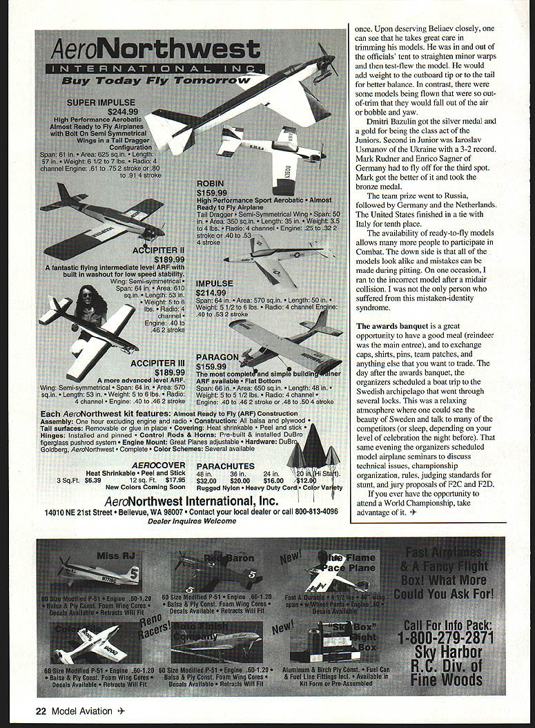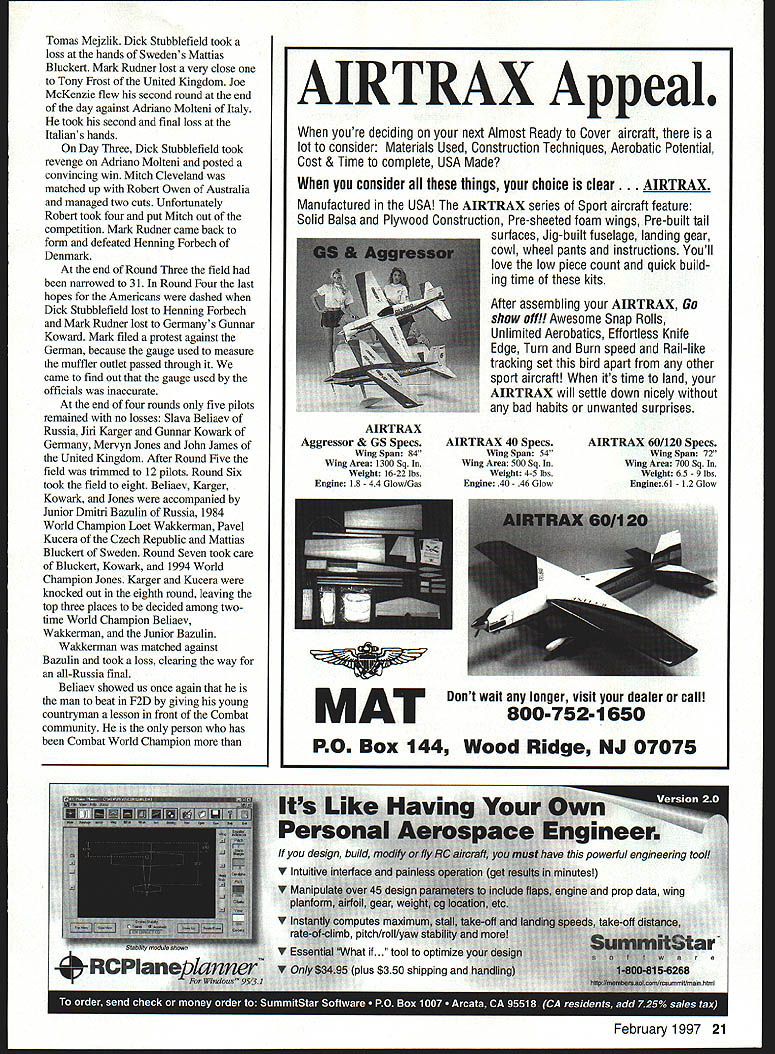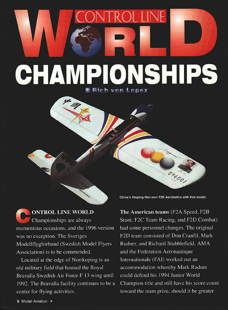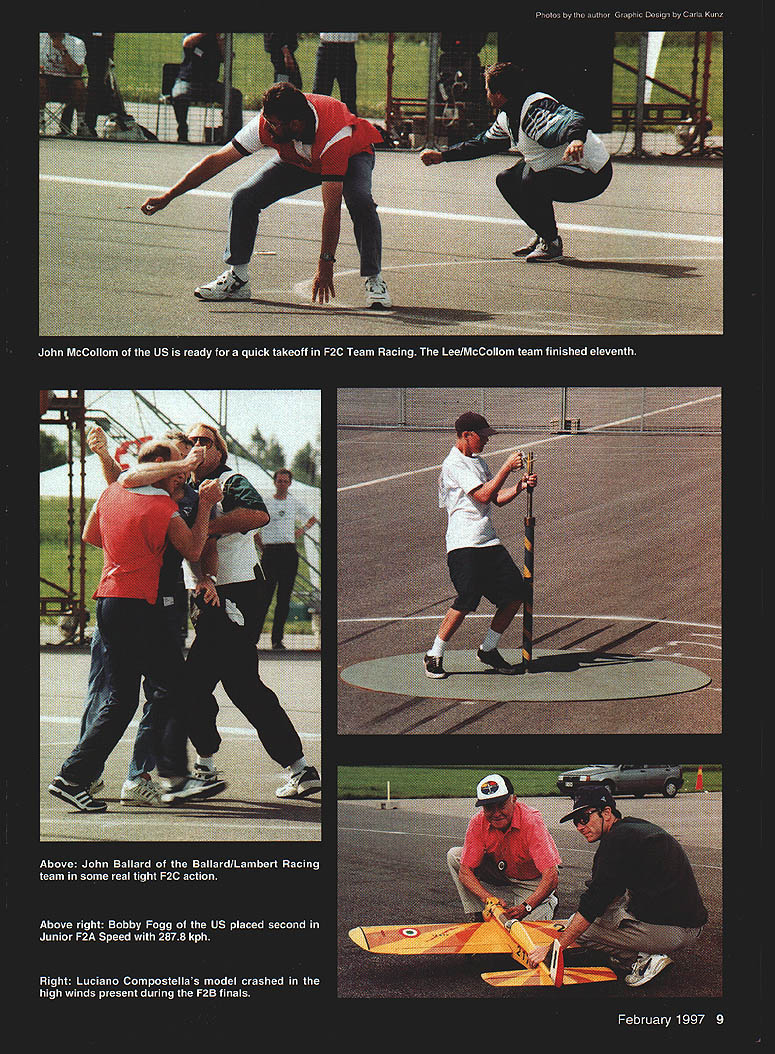 NO OCR TEXT NO OCR TEXT NO OCR TEXT Open-air markets like Team Race supplies offered plenty choose February 1997 11 1996 United States team Paul Walker United States won silver medal F2B Aerobatics US team No wasted space Australias Robert Owen designed clever Combat model placed second between China France box long trip down under THAT MODEL FOR YEARS TA AUTO PILOT oniy real Auto Pilot Designed back-up unit levels skill Inflight ON/OFF Switching Simple Plug Installation Sensors Internal & Unaffected External Conditions Consistent Operation Day Night Overcast Sunny Adjustable Zero & Gains Compatible RC Systems Endorsed Used Top Gun TOC Giant Scale Race Pilots & Experimental Full-Size also Automatic Piloting Systems 192 Yorktown Lane a Mesa CA 92626 Phone/Fax 714-979-8948 Send SASE Information the regular team members score gave first-alternate Joe McKenzie first opportunity represent United States Later Don Cranfil dropped off team replaced second-alternate Mitchell Cleveland F2B disaster struck Bob Hunt week prior team departure date July 19 1996 primary backup models destroyed practice Bill Werwage step ready go two days Bill has attending World Championships since 1970 no stranger rigors Stunt wars flying site few minutes hotel both camping dormitory facilities healthy 1-2 kilometer walk camping dormitory areas competitors could seen walking equipment morning Combat huge expanse freshly mowed grass either side runway could accommodate some 12 circles Anyone wanted practice could whenever wanted Stunt whole runway counted five models air time Speed Team Race also long runway practice flights practice pylon Speed guys lots open area Team Racers Walt Perkins Tom Fluker hard work keeping US team current information watched flight easy task given some conflicts times two events also healthy walk Combat Speed circuitous road being minute two shorter car walking F2A team included Bill Hughes Tom Brown Willie Naemura Junior Bobby Fogg Bill Tom 1994 team Willie new WC competition has solid training CL Combat days Bobby has expertise dad rely WITH FOX 4OBB ENGINE 2 BALL BEARINGS FOX E-Z CARBURETOR AVAILABLE IN RIO OR CONTROL LINE REPLACEABLE CRANKSHAFT STUD REDUCES REPAIR COSTS 2-PIECE BUTTON DESIGN HEAD #14096 CL #24096RC *Splnner Nut included FOX MANUFACTURING COMPANY 0 FOX 53O5TOWSON AVENUE SMITH ARKANSAS 72901 E 501 646-1656 501 646-1757 12 Model Aviation FLYING FEATURES INCLUDE young strong legs circulate around pylon solid teams US has put together four members put decent times Willie Naemura having best 2983 kilometers per hourgood enough eighth place followed Billy Hughes 2907 19th place Third US Tommy Brown running 2892 22nd place final member Bobby Fogg placed second Junior 2878 kph US team finished fifth Russia first France second United Kingdom third Italy fourth 47 entries Speed made interesting competition big story Speed Spaniard Luis Sarrate Parramon took $399 Profi record 3112 kph Sergei Kostin Russia builds other top engines second 3053 followed another Russian Konstantin Fedotov 3030 Spains team manager Ian McIntosh has worked long hard upgrade countrys efforts now set standard Speed early problems judges taking extra two laps start watches ten-lap run handle pylon customary start watches two laps after handle pylon judges waiting about four laps could use binoculars check handle being fully pylon An early run about 307 kph Parramon discounted pulled out pylon saddle too early although would have customary point under normal contest conditions prevent additional mishaps air horn sounded let pilots know timing completed Speed models normally carry enough fuel get up speed get ten-lap run maybe little just couple extra laps Bobby Fogg some spectacular practice runs changed February 1997 13 K&Bsei Engines NOW have bronze bushed crankcases come remote needle valves K&Rs Affordable Engines Offer Gualfty DurabiliCy Performance Sportater features AAC Cylinder Piston Unusually Quiet Muffler Carburetor Easy Idle Adjustment Crankshaft Hardened Steel Youll observe incredible durability paint wear long lasting engines K&B 45 A/C K&B 65 A/C K&B MFG Inc 2100 College Lake Havesu City AZ 86403 520-453-3030 Office Hours 7AM 12 Noon 1230 PM 330 PM M-F K Worlds Finest Laser Cut Rubber Powered Free Flight Scale Kits K_ worlds leader Laser Cut Model Aircraft Kits kIt features finest LASER CUT BALSA PARTS Contest Rubber Detailed Computer Drawn Plans Con plete Hantieare Pack AuthentIc Waterallde DecaI MO/dod PlastIc Propeller Real Colored TIssue Light Weight Wheels Complete Step Step Bulkilng InstructIons Please check wIth local hobby dealer first kits avaIlable better hobby shops around world Full Line Catalog $200 Add $450 shipping kitOverseas orders add 20%FL residents add 6% sales tax KMade USADealer Inquire invited 2 Designed Rich Uravitcn um rermen canopy cowl ine & die-cut parto Wingspan 52 th 52 Wing Area 533 Sq In- Engine 2 20-25 Radio required $9999 Combo witb 2 Thander Tiger 25GF $19999 OR 2 Geared 05 Electric $17499 Mini Sukhoi enigned Nick Ziroli Sr 41 wood conotruction machine & die cat parto teusive hardwood package Wingopas 34 th Engine 040-010 h Mini Radio & Servos required $3299 Kit Sakboi Combs Thunder Tiger 10GP $89 99 FRET SAW sim Sotuty stroke redeces risk ot injary Sturdy die cant construction y blade positiosiug rubber feet dampen vibration cuts plastic up 1/4 non-ferrous metal sp lit Hordwood yr ply up 1/2 $12995 M6490 HIGH TORQUE DRILL High torque drill pencil grip hi-etticioucy tau cooled motor ligbtweigbt koyless chuck Hi speed extendible cable 4 $3496 MBl5O CIRCULAR SAW Die cast table tsr greater accuracy rip fence precise straigbt cuts miter-guide 0-90 coutrelled cuttiug see tbru added ted scale comes tws m cuts wend op rlastic upto 1/16 $6995 MB41O JIG SAW Perfect cutting intricate ubapes small radii & scroll work comes witb 2 blades $5995 M8552 Note All MINICRAFT tools DC powered require use power supply below MB730VAR SP Transtormer$3495 MB750UNV SF TRANSFORMER$71 9