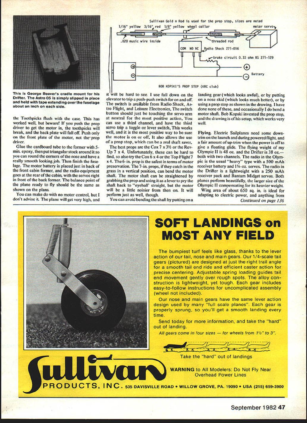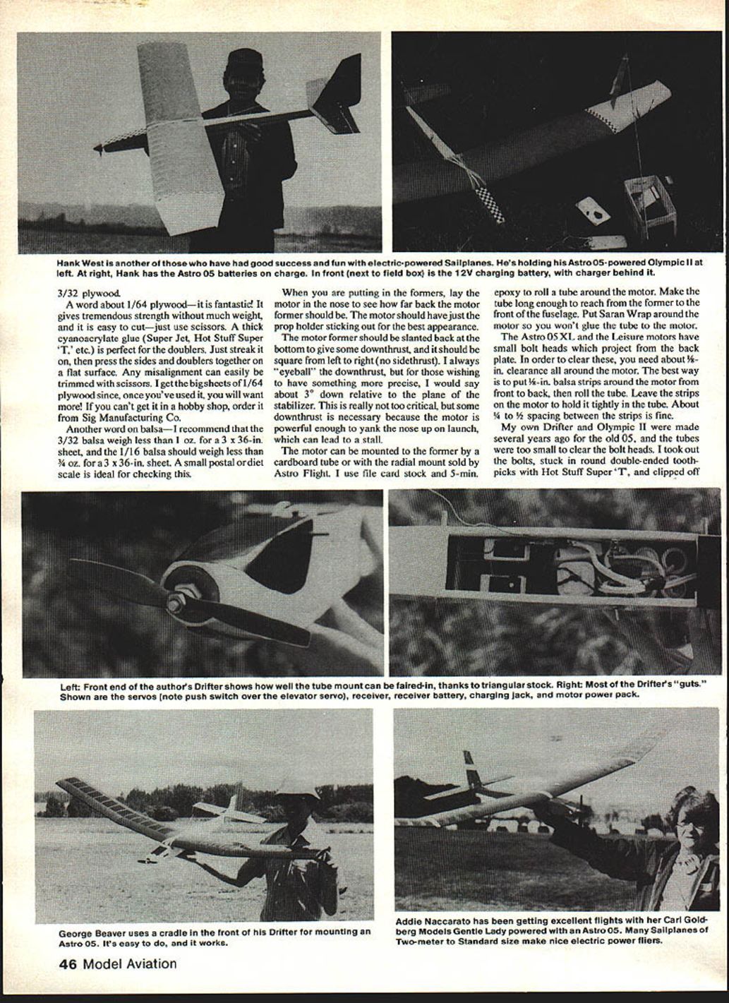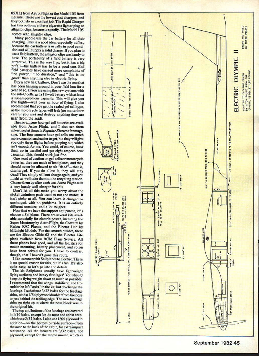 Authois electric-powered Olympic II Astro O5XL weighs 48 oz excellent flier two channels Wing/stab regular kit items thinner stock has substituted fuselage Text drawings show make modifications install electric motor Get hankering electric-powered RC Sailplane dont know start several kits especially made electric motors author likes instead modify fuselages regular Sailplane kits tells us same time gives us some tips electric power general Mitch Poling THERE HAS BEEN revolution recently electric power units 05-size planes Astro O5XL Leisure Electronics 05 Electric Sajlplanes have always fun practical power units put whole new light things use six-cell sub-C packs put out about 15% power regular 05 have durationabout 50% sport planes nearly twice Sailplanes flew electric-powered Drifter few week ends ago no-thermal day up 15 minutes no problems using power alone Leisure unit Due solid power units climb can easily get plane 600-700 feet altitude can cruise around six seven minutes motor off turn over again charge takes 15 minutes have two battery packs can fly continu ously until totally exhausted have confession revolution has strictly airplanes 1/12-scale cars have using units years 1/12scale car competitions have perfected airplane types owe debt gratitude car racers have given us extra bonusthe motors battery packs readily available everywhere want extra battery pack its easy get Now have extra power extra duration easy access parts what other advantages electric-powered Sailplanes beginner advantages enormous Elec tric Sailplanes fly themselves beginner can learn ownwith lots time recover mistakes also does have learn keep giow engine running get started Just flip switch away go expert advantage extra fun will have Any field available electric silence golden fact will find general public really likes model air planeswithout noise have always friendly fascinated spectators including policeman beat no complaints problems alL sight beautiful Sailplane soaring overhead like eagle enough make anybody enthusiastic other advantage electric-powered Sailplanes no high-start have flown park high-starts allowed constantly problem people children horses dogs getting tangied long lines invisible grass fact have move whole thing wind shift makes awkward Its much easier just turn switch let go get started First get 05 Astro Flight Leisure older model Astro 05 fine Astro 05 XL Leisure 05 offer duration power recommend Get charger same time Both Astro Flight Leisure offer excellent chargers ammeter show much charge going Order charger same company order power pack plugs different recommend Rapid Charger sure specify six cells order Astro 44 Model Aviation Another Sailplane makes good electric power flier Drifter behind Oly II both wings removed Drifter has Leisure Electronics 05 motor has 6-ft wing vs Oly Ils 8-ft what see take wing off Olympic II front left motor batteries receiver servos electric power original Sailplane balance point should maintained 05 XL Astro Flight Model 105 Leisure lowest cost chargers both excellent job Rapid Charger has two options either cigarette lighter plug alligator clips sure specify Model 105 comes alligator clips people use car battery charging good idea especially first because car battery usually good condi tion will supply solid charge plan use afield battery alligator clips handy have portability field battery very attractive way go has big pitfallthe battery has good Bad field batteries have caused complaints no power no duration no good anything else electric flying Buy new field battery Dont use has hanging around field box year using new systems sub-C cells get 12-volt battery least six-ampere-hour capacity will give five flightswell over hour flying also recommend get sealed gel-cell type motorcycle types will leak no matter careful destroy anything near acid six-ampere-hour gel-cell batteries avall able Astro Flight also see advertised attimes inPopularElectronicsmaga zine four-ampere-hour gel-cells much common easier get will give three flights before pooping out isnt enough could course hook up parallel get eight-ampere-hour capacity should work just fine word caution gel-cells motorcycle batteries made lead plates should never allowed sit deadthat discharged allow will stay dead simply will charge again might well take recycling station Charge up after use Astro Flight sells very handy wall charger Dont let make worry about nickel-cadmium pack used run motor isnt picky alL can leave charged uncharged no problems entirely different creature lot tougher Now have support equipment lets choose Sailplane several kits avail able especially electric power including Super Monterey Astro Flight Corvette Parker H/C Planes Electra Lite Midnight Models scratch builder Electra Glide 62 Electra Lite plans available RCM Plans Service planes look good logistics motor mounting battery placement have solved have confess though havent gone route like convert kit Saiplanes electric no special reason its fun Its also quite easy lets go details kit Sailplanes usually have lightweight flying surfaces heavy fuselages should keep flying weight down much possible recommend wings stabilizer finrudder leftas kit change fuselage substitute 3/32 balsa fuselage sides 1/64 plywood doubler nose just behind trailing edge new fuselage sides go right up nose block original kit top bottom fuselage covered 1/16 balsa except forthe nose cabin ares use 3/32 balsa also use 1/64 plywood additionon bottom outside surfacefrom nose back cabin extra impact resistance formers 3/32 balsa plywood except motor mount T N WE N 0L i 20 02 F1 2 II~jI IfN\I lbU 2I s 040 Ooooo 2 .5 ZE 77 AiI 0 22 Li ID U -J 0 U U LU -J LU K I-1 0I 01 00 I0 September 1982 45 00 Jr So Zr 4 0 0 IJ U Z 0 00 j 22 002 00 000 0 C 4 Hank West another have good success fun electric-powered Sailpianes Hes holding Astroo5-powered Olympic II left right Hank has Astro 05 batteries charge front next field box 1 2V charging battery charger