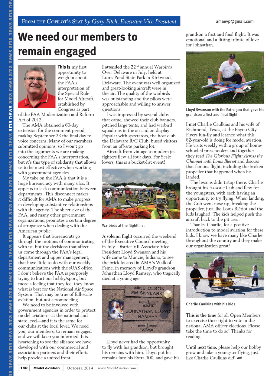 We need to be involved with governmental agencies in order to protect model aviation, at the national and state level, and it is the same for our clubs at the local level. We need you, our members, to remain engaged while we will keep you informed. It is heartening to see the alliance we have developed with our commercial and association partners and their efforts help provide a united front.