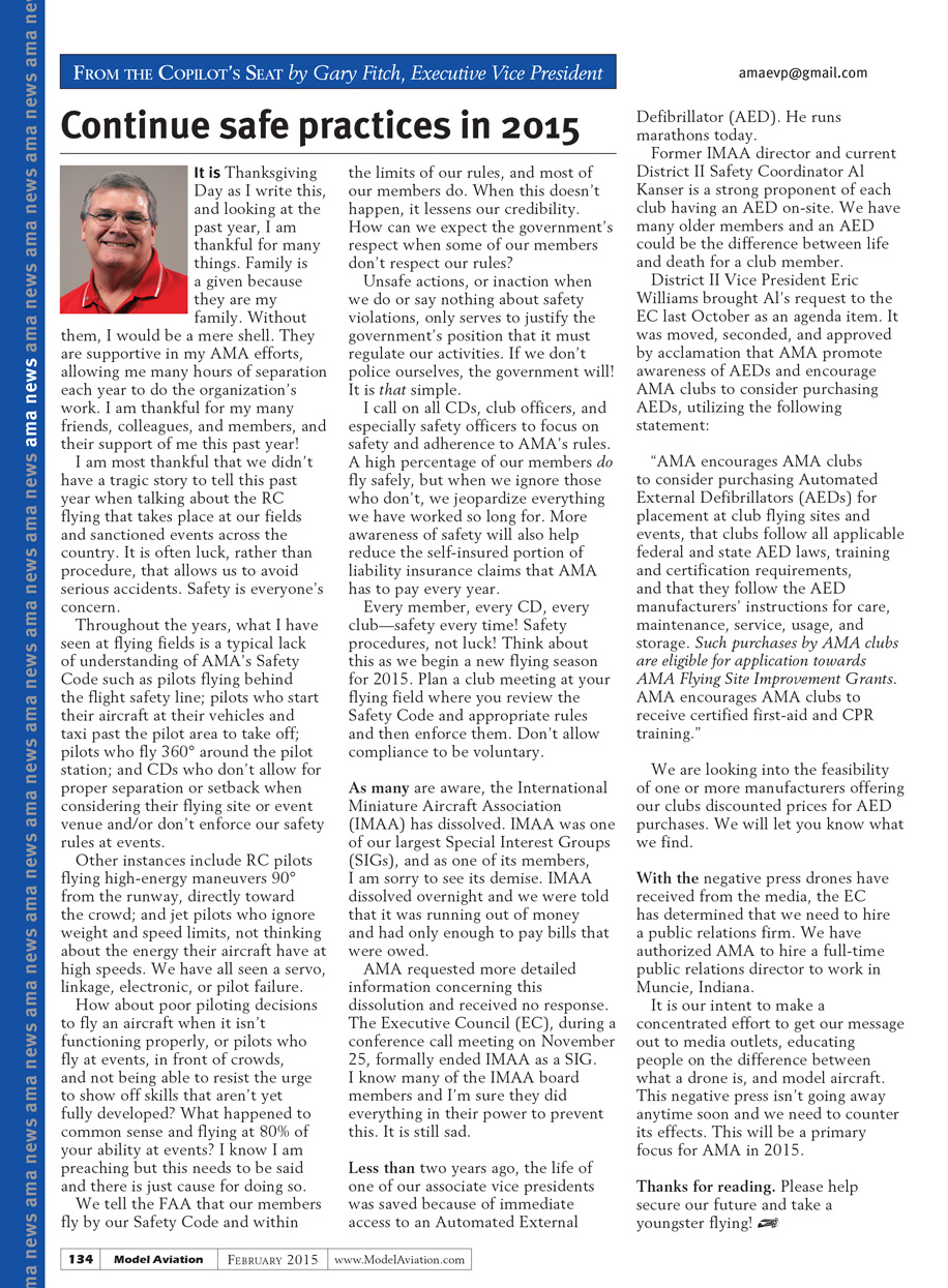 It is our intent to make a concentrated effort to get our message out to all media outlets, educating them between the difference of what a drone is, and what model aircraft are. This negative press isn’t going away anytime soon and we need to counter its effects. This will take several months to get into gear but will be a primary focus for AMA in 2015.