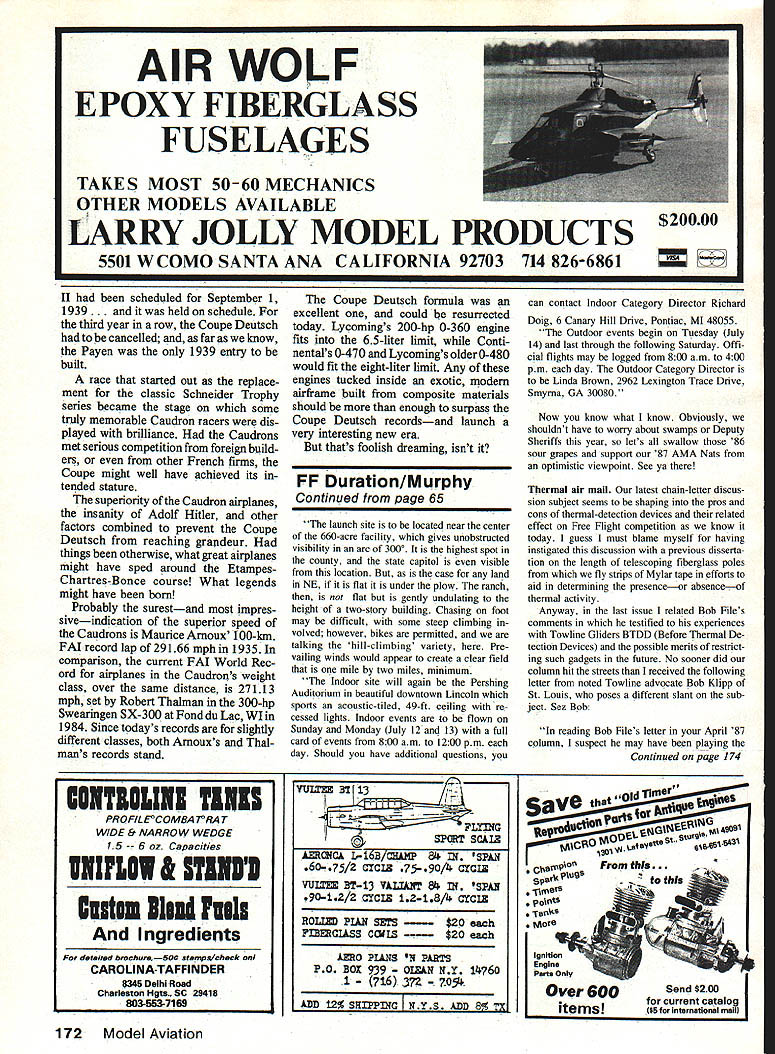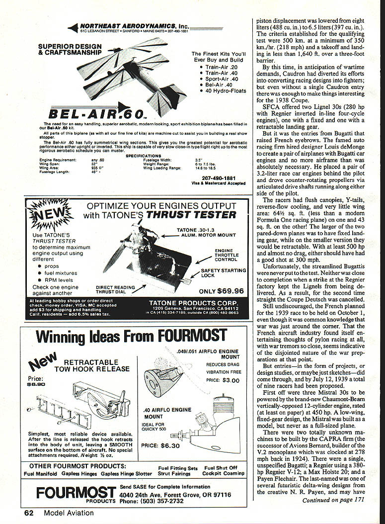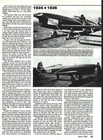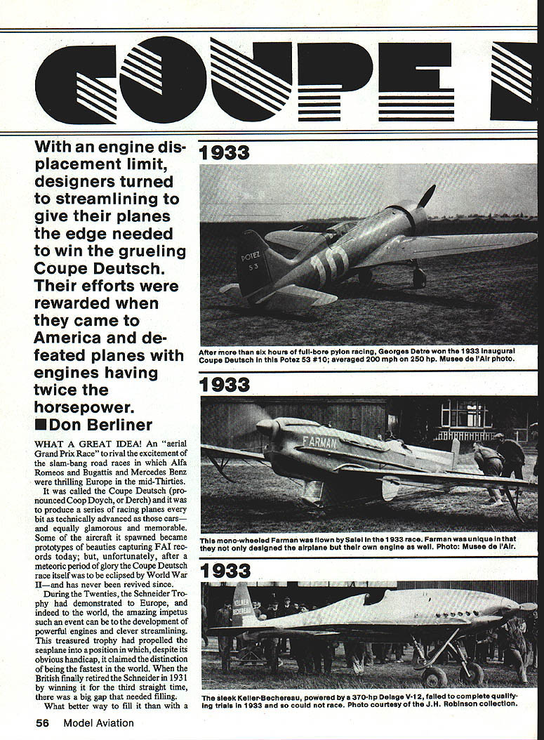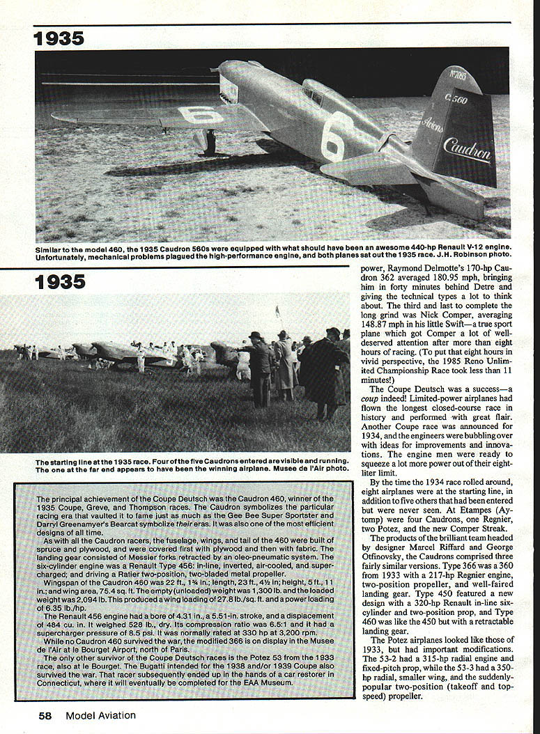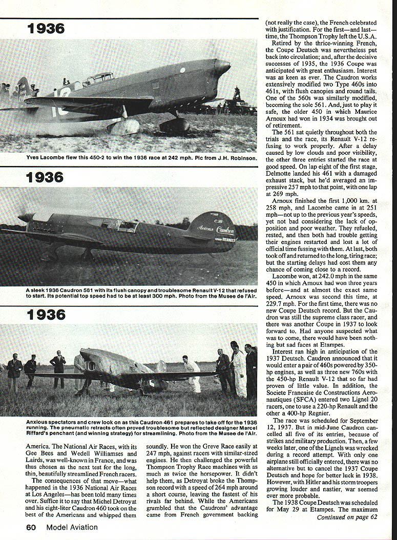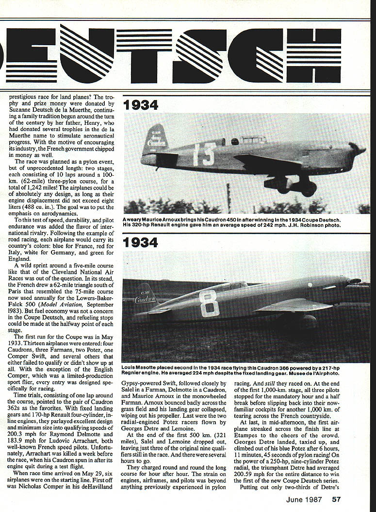 With engine dis- 1933 placement limit designers turned streamlining give planes edge needed win grueling Coupe Deutsch efforts rewarded came America de feated planes engines having twice horsepower EDon Berliner WHAT GREAT IDEA An aerial Grand Prix Race rival excitement slam-bang road races Alfa Romeos Bugattis Mercedes Benz thrilling Europe mid-Thirties called Coupe Deutsch pro nounced Coop Doych Derch produce series racing planes bit technically advanced cars equally glamorous memorable Some aircraft spawned became prototypes beauties capturing FAI rec ords today unfortunately after meteoric period glory Coupe Deutsch race itself eclipsed World War Hand has never revived since During Twenties Schneider Tro phy demonstrated Europe indeed world amazing impetus such event can development powerful engines clever streamlining treasured trophy propelled seaplane position despite its obvious handicap claimed distinction being fastest world British finally retired Schneider 1931 winning third straight time big gap needed filling What better way fill 56 Model Aviation ----I 1933 After six hours full-bore pylon racing Georges Detre won Coupe Deutach Potez 53 #10 averaged 200 mph 250 hp Musee de lAlr 1933 mono-wheeled Parman flown Salel 1933 race Farman unique inst designed airplane own engine well Photo Muses de lAir sleek Keller-Bechereau powered bye 370-hp Delage V-12 failed complete qualIfy ing trials 1933 could race Photo courtesy JH Robinson collection prestigious race land planes tro phy prize money donated Suzanne Deutsch de la Muerthe continu ing family tradition begun around turn century father Henry donated several trophies de la Muerthe name stimulate aeronautical progress motive encouraging its industry French government chipped money well race planned pylon event unprecedented length two stages consisting 10 laps around 100km 62-mile three-pylon course total 1242 miles airplanes could absolutely design long engine displacement did exceed eight liters 488 cu goal put emphasis aerodynamics test speed durability pilot endurance added flavor inter national rivalry Following example road racing airplane would carry its countrys colors blue France red Italy white Germany green England wild sprint around five-mile course like Cleveland National Air Races out question its stead French drew 62-mile triangle south Paris resembled 75-mile course now used annually Lowers-Baker Falck 500 Model Aviation September 1983 fuel economy concern Coupe Deutsch refueling stops could made halfway point stage first run Coupe May 1933 Thirteen airplanes entered four Caudrons three Farmans two Potez Comper Swift several others either failed qualify didnt show up exception English Comper limited-production sport flier entry designed spe cifically racing Time trials consisting lap around course pointed pair Caudron 362s favorites fixed landing gears 170-hp Renault four-cylinder line engines parlayed excellent design minimum size qualifying speeds 2003 mph Raymond Delmotte 1839 mph Ludovic Arrachart both well-known French speed pilots Unfortu nately Arrachart killed week before race Caudron spun after its engine quit during test flight race time arrived May 29 six airplanes starting line First off Nicholas Comper deHavilland Gypsy-powered Swift followed closely Salel Farman Delmotte Caudron Maurice Arnoux monowheeled Farman Arnoux bounced badly across grass field landing gear collapsed wiping out propeller Last two radial-engined Potez racers flown Georges Detre Lemoine end first 500 km 321 miles Salel Lemoine dropped out leaving just three original nine quali fiers still race several hours go charged round round long course hour after hour strain engines airframes pilots beyond anything previously experienced pylon racing still raced end first 1000-km stage three pilots stopped mandatory hour half break before slipping back nowfamiliar cockpits another 1000 km tearing across French countryside last mid-afternoon first air plane streaked across finish line Etampes cheers crowd Georges Detre landed taxied up climbed out blue Potez after 6 hours 11 minutes 45 seconds pylon racing power 250-hp nine-cylinder Potez radial triumphant Detre averaged 20059 mph entire distance win first new Coupe Deutsch series Putting out two-thirds Detres June1987 57 AwearyMauriceArnoux brings hisCaudron 450 afterwinning 1 934Coupe Deutsch 320-hp Renault engine gave him average speed 242 mph JH Robinson photo 1934 Louis Masotte piaced second 1934 race fiving Caudron 366 powered 217-hp Regnier engine averaged 224 mph despite fixed landing gear Musee de lAir photo 1935 4 power Raymond Delmottes 170-hp Cau dron 362 averaged 18095 mph bringing him forty minutes behind Detre giving technical types lot think about third last complete long grind Nick Comper averaging 14887 mph little Swifta true sport plane got Comper lot welldeserved attention after eight hours racing put eight hours vivid perspective 1985 Reno Unlim ited Championship Race took less 11 minutes Coupe Deutsch successa coup indeed Limited-power airplanes flown longest closed-course race history performed great flair Another Coupe race announced 1934 engineers bubbling over ideas improvements innova tions engine men ready squeeze lot power out eightliter limit time 1934 race rolled around eight airplanes starting line addition five others entered never seen Etampes Ay tomp four Caudrons Regnier two Potez new Comper Streak products brilliant team headed designer Marcel Riffard George Otfmovsky Caudrons comprised three fairly similar versions Type 366 360 1933 217-hp Regnier engine two-position propeller well-faired landing gear Type 450 featured new design 320-hp Renault in-line sixcylinder two-position prop Type 460 like 450 retractable landing gear Potez airplanes looked like 1933 important modifications 53-2 315-hp radial engine fixed-pitch prop 53-3 350hp radial smaller wing suddenlypopular two-position takeoff topspeed propeller 58 Model Aviation similar model 460 1935 Caudr
