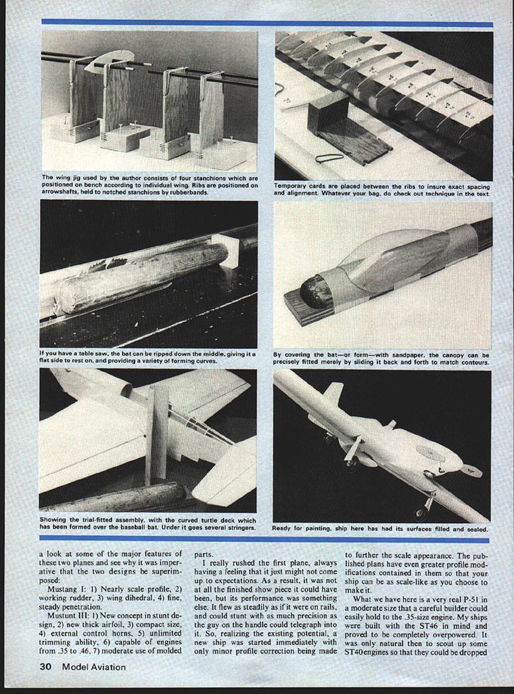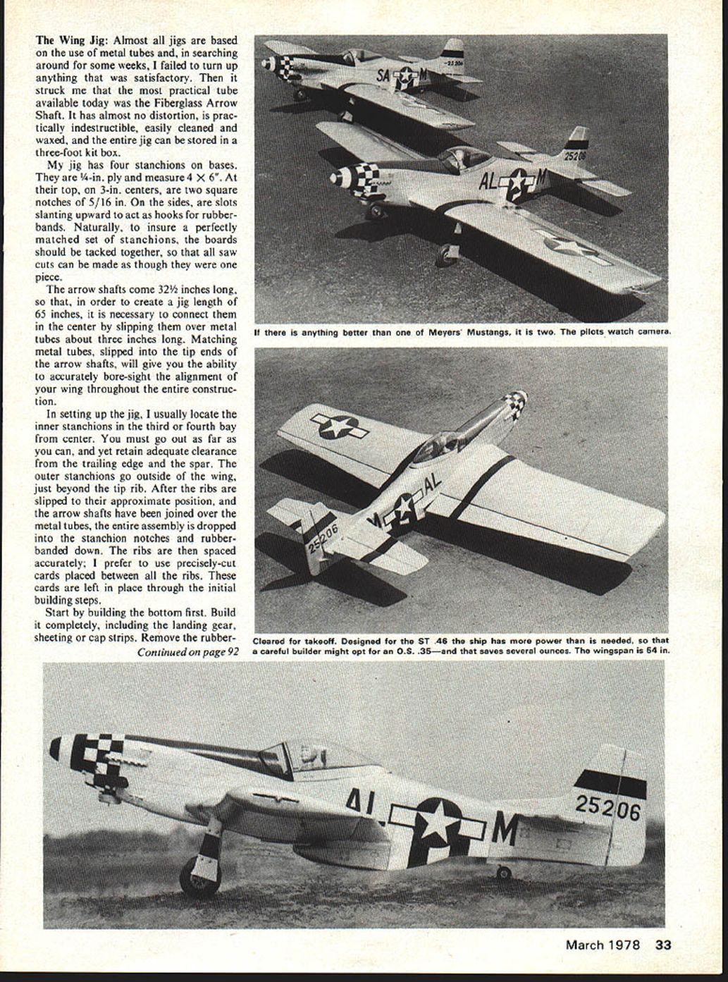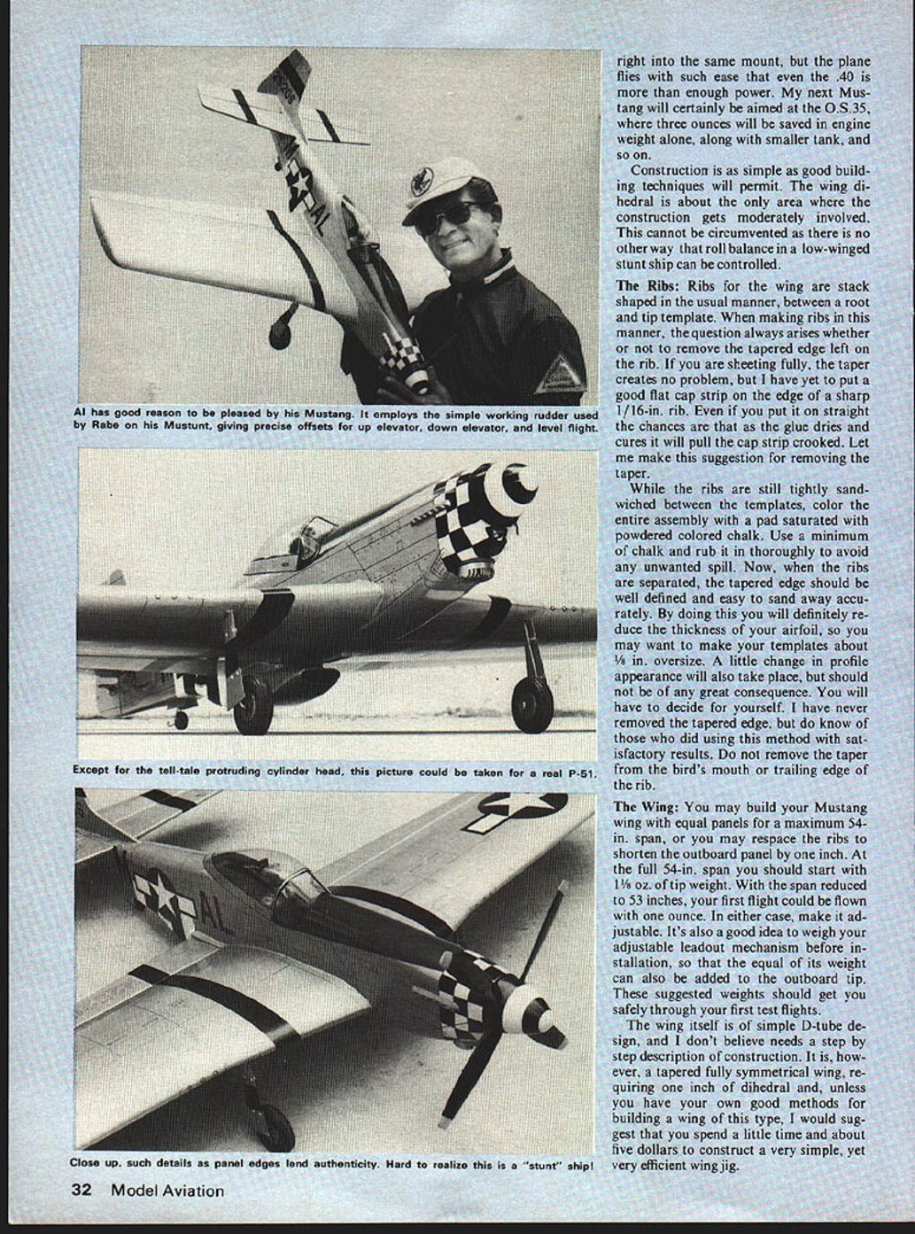 A yen WWII ou desired nt has las 1-11 NTROL HORNS 11SIG WW2 COCKPIT CANOPY 1 CI AA t/8PLYW FIREWALL BUL I/8PLYWOOO NOSE N Model Aviation ELEVATOR AND RUDDER 1 I/16X 1/4 HARD BALSA STRINGER JOHS DECK AND SiDES / SLOT FC V4 BALSA SHEET ALL TAt SURFACES 4 3/16 SQ BALSA LOWER STRINGER / X V4 FRAMES IN AFT BOQY ONLY 7/8 VECO TAJLWHEEL ON 3/3~ WIRE BRASS WIRE WRAPS THRU OOD SOUD BALSA BLOCKS 6 NVOWEST ROCKER HORN 1/4 BALSA / FLAPS WING CARRIES THROUGH 3/32 BALSA TE SHEETS TOPAND BOTTOM 7 1/8 BALSA T E CAP STRIP 1/16 BALSA RIBS HOLES SHOWN SOLID BALSA BLOCK TIPS / LEAD IN SLOTS 1/4 SQ HARD BALSA UPPER AND LOWER SPAR 1/16 BALSA SHEET TOP AM BOTTOM SKIN / I/4N SQ BALSA LEADING EDGE 7 -- A / NYLON SCREW BLOCK March 1978 29 7 look some major features two planes see imper ative two designs superim posed Mustang 1 Nearly scale profile 2 working rudder 3 wing dihedral 4 fine steady penetration Mustunt III 1 New concept stunt de sign 2 new thick airfoil 3 compact size 4 external control horns 5 unlimited trimming ability 6 capable engines 35 46 7 moderate use molded parts really rushed first plane always having feeling just might come up expectations As result finished show piece could have its performance something else flew steadily rails could stunt much precision guy handle could telegraph So realizing existing potential new ship started immediately minor profile correction being made further scale appearance pub lished plans have greater profile mod ifications contained ship can scale-like choose make What have very real p-s 1 moderate size careful builder could easily hold 35-size engine ships built ST46 mind proved completely overpowered natural scout up some ST4O engines could dropped 30 Model Aviation *04W4 X1 NORTDRC Mtiit Olin AS TO S NC-. I-* __________________________________ I- IIKrL..L S / __ __ _______ __ __ __ / II*______ ___ 4 N41 IODRINICR OmNA flCmO 4m Jc visw a -I 1 WI 5&CTD4 CC DR * ECTOS4 A-A 4. 0 NO DRRO AT iAATAWR0NKN DARN LICOT ~AT CA AD vAu RONNiE ID DRAWN 0 OlAARM i-N flinflDRJ ffiqffi C DM1 AU PASNIAWN Rflflfl AONOOWY ACt AWA fin OR Win NCA Win Ti-i IJII NPUN DIR 4 iiMn-/* NCiW-Lj..A4 DR OfiDRiT RIONjfl idISCYS OCIRA WDORffl&NWD nWTDG CCNA RUt 4 flNfl APR in4 DaiNC COCOOn CDRAnfl aP0 / 4 ODISOOCC rnDnL OTARS flO nIt WTIN $ACTOAL OiSSN& Cit CII *CNIT1DRICI 4 WA.. tANNin INASOORS 4 *5*5 CSDRUR OP WIW 5 NIWIWAN WARN OA inSfin 5rOintO NND S NIt SISNSAU SUCTIODI 0-0 ICCON Nil SInIADRDDAiiN UWDCS700 Ro4J4 UlARn III 14AOJNi FRODRRVPA WY FULL-SIZE PLANS AVAILABLESEE PAGE 104 & DRnflN- 45T NCDNA-t/ 4NflCO& UN WY 0 -a Co 0 -b ROOT N-S TnnAR DRO ThDRU4Dt Rn iWIfi tin ys simple wort tor down elevator same mo such ease th enough pou ill certainly three ounces will alone along trctiofl sin hniques will pet about ruction gets mode annot circumven roll can controlle Ribs th n usual m emolate Whi ve tne shi Close up such 32 Model Aviation picture could taken inticity Hard realize st. wing u spend construct Wing Jig Almost jigs based use metal tubes searching around some weeks failed turn up anything satisfactory struck practical tube available today Fiberglass Arrow Shaft has almost no distortion prac tically indestructible easily cleaned waxed entire jig can stored three-foot kit box jig has four stanchions bases /4-in ply measure 4 X 6 top 3-in centers two square notches 5/16 sides slots slanting upward act hooks rubberbands Naturally insure perfectly matched set stanchions boards should tacked together saw cuts can made though piece arrow shafts come 32 inches long order create jig length 65 inches necessary connect center slipping over metal tubes about three inches long Matching metal tubes slipped tip ends arrow shafts will give ability accurately bore-sight alignment wing throughout entire construc tion setting up jig usually locate inner stanchions third fourth bay center must go out far can yet retain adequate clearance trailing edge spar outer stanchions go outside wing just beyond tip rib After ribs slipped approximate position arrow shafts have joined over metal tubes entire assembly dropped stanchion notches rubberbanded down ribs spaced accurately prefer use precisely-cut cards placed between ribs cards left place through initial building steps Start building bottom first Build completely including landing gear sheeting cap strips Remove rubberMarch1978 33 anything better Meyers Mustangs two pilots watch camera Cleared takeoff Designed ST 46 ship has power needed Continued vae 92 careful builder might opt OS 35and saves several ounces wingspan 54 DU-BRO KWIK- PUMP GPINNER Convert Kwiku Fill Fuel Pump Electric Starter Operation $295 Pump fuel faster easier ever before new Kwik-Pump spinner Simply remove handle screw aluminum spinner Lock place nut youre ready pump fuel electric starter de-fuel change polarity starter wind handle back de-fuel manually Its easy thatll DU-BRO PRODUCTS INCORPORATED 480 Banner Road Wauconda IllInois 60064 USA ponent installations engine would have stock out box unit non-Schnuerle front-rotor design 45 cubic inch propellers would non-racing configuration probably sup plied hosting sponsoring organ ization holding contest Fuel would also fall category As can see am trying promote event would guy would like race necessarily want get specialized cant fly plane fun other non-racing event might like compete picked 600 sq size reason size airplane reason ably easy transport fly ing field non-Schnuerle front-rotor engines expensive pro hibitive price mild fuel stock props should last season dont crash sure beats launch ing engine race heat As stated before Jack Stafford Mod els considering 800 sq Brown B-3 would 60 class racing similar Class CB Enterprises has started 800 sq Formula type aircraft aircraft will de signed want AMA scale bird can put detail hearts content basic outline will full scale Jack will probably offer kit same manner offers Quarter Midget foam wing build-up wing whichever turns Kick around suggestion above mentioned ~fun type racing cl
