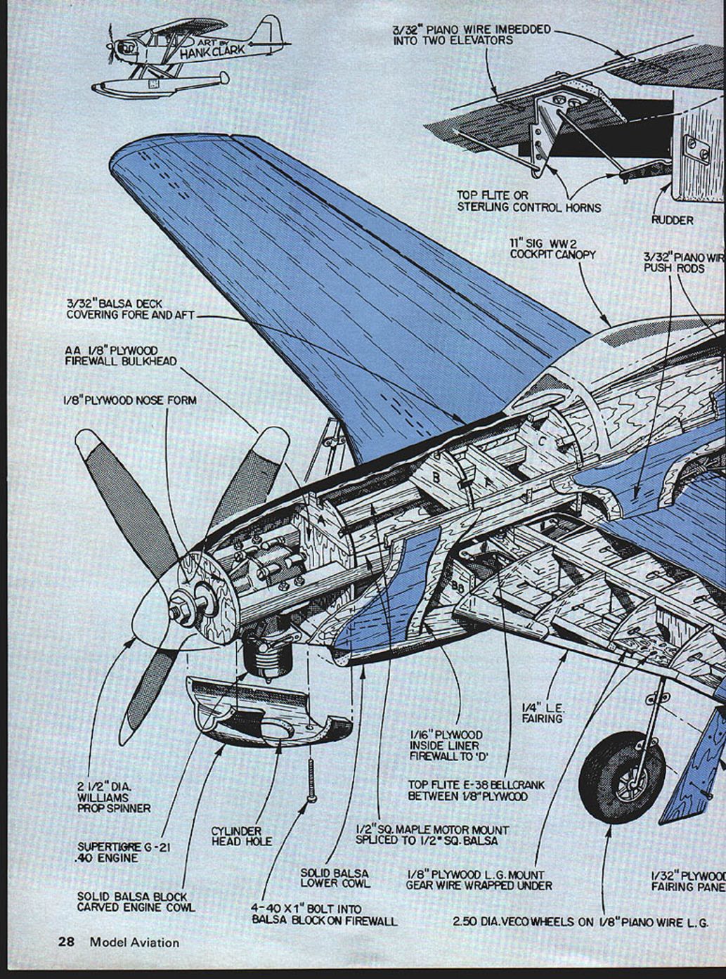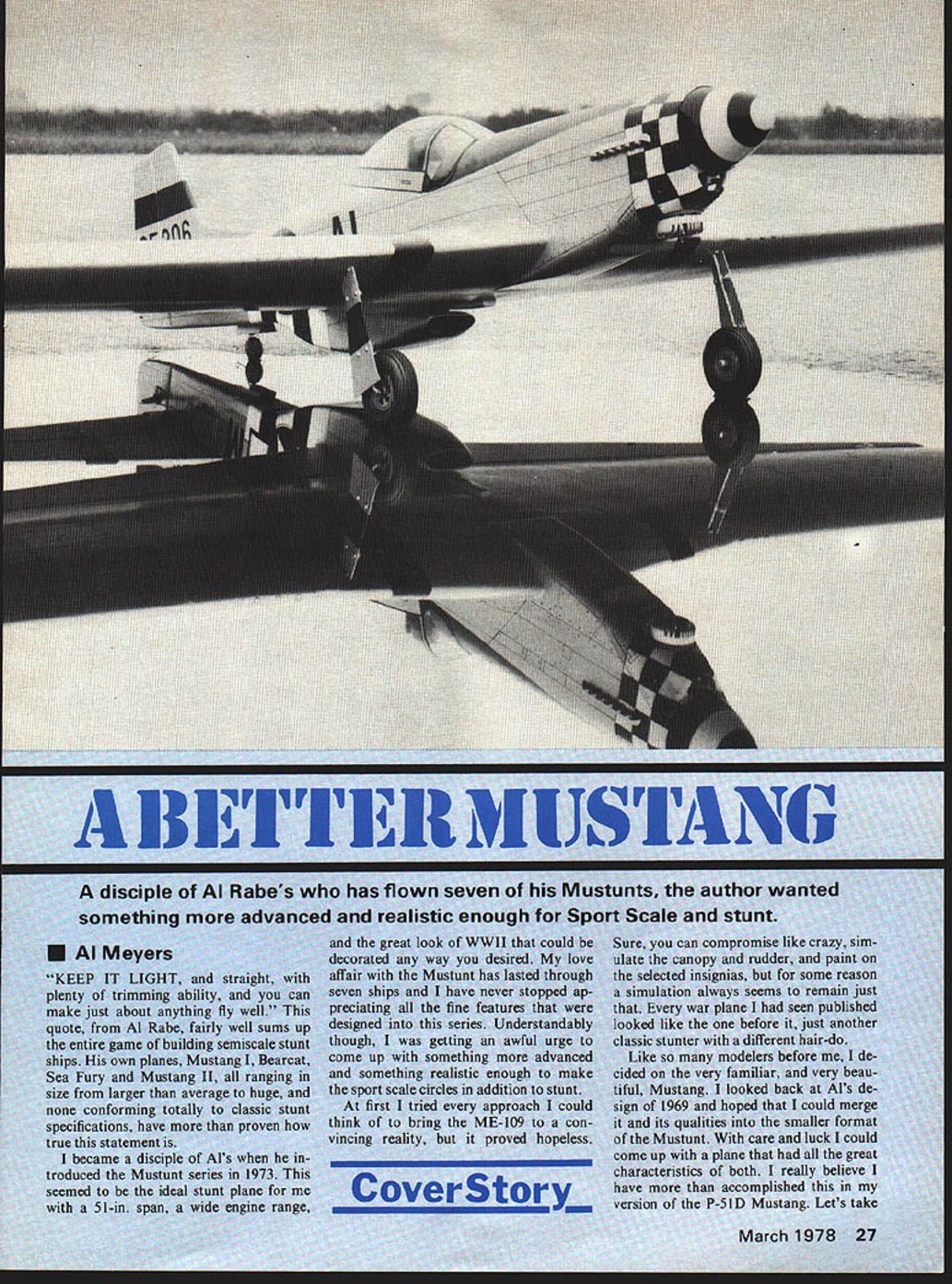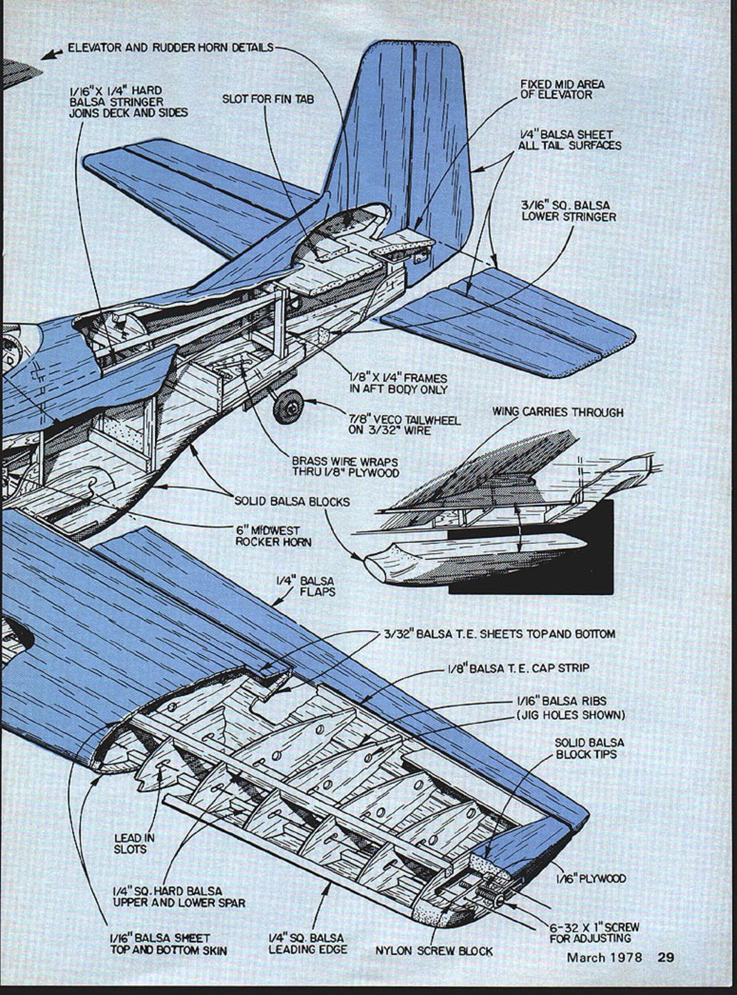 A yen WWII ou desired nt has las 1-11 NTROL HORNS 11SIG WW2 COCKPIT CANOPY 1 CI AA t/8PLYW FIREWALL BUL I/8PLYWOOO NOSE N Model Aviation ELEVATOR AND RUDDER 1 I/16X 1/4 HARD BALSA STRINGER JOHS DECK AND SiDES / SLOT FC V4 BALSA SHEET ALL TAt SURFACES 4 3/16 SQ BALSA LOWER STRINGER / X V4 FRAMES IN AFT BOQY ONLY 7/8 VECO TAJLWHEEL ON 3/3~ WIRE BRASS WIRE WRAPS THRU OOD SOUD BALSA BLOCKS 6 NVOWEST ROCKER HORN 1/4 BALSA / FLAPS WING CARRIES THROUGH 3/32 BALSA TE SHEETS TOPAND BOTTOM 7 1/8 BALSA T E CAP STRIP 1/16 BALSA RIBS HOLES SHOWN SOLID BALSA BLOCK TIPS / LEAD IN SLOTS 1/4 SQ HARD BALSA UPPER AND LOWER SPAR 1/16 BALSA SHEET TOP AM BOTTOM SKIN / I/4N SQ BALSA LEADING EDGE 7 -- A / NYLON SCREW BLOCK March 1978 29 7 look some major features two planes see imper ative two designs superim posed Mustang 1 Nearly scale profile 2 working rudder 3 wing dihedral 4 fine steady penetration Mustunt III 1 New concept stunt de sign 2 new thick airfoil 3 compact size 4 external control horns 5 unlimited trimming ability 6 capable engines 35 46 7 moderate use molded parts really rushed first plane always having feeling just might come up expectations As result finished show piece could have its performance something else flew steadily rails could stunt much precision guy handle could telegraph So realizing existing potential new ship started immediately minor profile correction being made further scale appearance pub lished plans have greater profile mod ifications contained ship can scale-like choose make What have very real p-s 1 moderate size careful builder could easily hold 35-size engine ships built ST46 mind proved completely overpowered natural scout up some ST4O engines could dropped 30 Model Aviation *04W4 X1 NORTDRC Mtiit Olin AS TO S NC-. I-* __________________________________ I- IIKrL..L S / __ __ _______ __ __ __ / II*______ ___ 4 N41 IODRINICR OmNA flCmO 4m Jc visw a -I 1 WI 5&CTD4 CC DR * ECTOS4 A-A 4. 0 NO DRRO AT iAATAWR0NKN DARN LICOT ~AT CA AD vAu RONNiE ID DRAWN 0 OlAARM i-N flinflDRJ ffiqffi C DM1 AU PASNIAWN Rflflfl AONOOWY ACt AWA fin OR Win NCA Win Ti-i IJII NPUN DIR 4 iiMn-/* NCiW-Lj..A4 DR OfiDRiT RIONjfl idISCYS OCIRA WDORffl&NWD nWTDG CCNA RUt 4 flNfl APR in4 DaiNC COCOOn CDRAnfl aP0 / 4 ODISOOCC rnDnL OTARS flO nIt WTIN $ACTOAL OiSSN& Cit CII *CNIT1DRICI 4 WA.. tANNin INASOORS 4 *5*5 CSDRUR OP WIW 5 NIWIWAN WARN OA inSfin 5rOintO NND S NIt SISNSAU SUCTIODI 0-0 ICCON Nil SInIADRDDAiiN UWDCS700 Ro4J4 UlARn III 14AOJNi FRODRRVPA WY FULL-SIZE PLANS AVAILABLESEE PAGE 104 & DRnflN- 45T NCDNA-t/ 4NflCO& UN WY 0 -a Co 0 -b ROOT N-S TnnAR DRO ThDRU4Dt Rn iWIfi tin ys simple wort tor down elevator same mo such ease th enough pou ill certainly three ounces will alone along trctiofl sin hniques will pet about ruction gets mode annot circumven roll can controlle Ribs th n usual m emolate Whi ve tne shi Close up such 32 Model Aviation picture could taken inticity Hard realize st. wing u spend construct Wing Jig Almost jigs based use metal tubes searching around some weeks failed turn up anything satisfactory struck practical tube available today Fiberglass Arrow Shaft has almost no distortion prac tically indestructible easily cleaned waxed entire jig can stored three-foot kit box jig has four stanchions bases /4-in ply measure 4 X 6 top 3-in centers two square notches 5/16 sides slots slanting upward act hooks rubberbands Naturally insure perfectly matched set stanchions boards should tacked together saw cuts can made though piece arrow shafts come 32 inches long order create jig length 65 inches necessary connect center slipping over metal tubes about three inches long Matching metal tubes slipped tip ends arrow shafts will give ability accurately bore-sight alignment wing throughout entire construc tion setting up jig usually locate inner stanchions third fourth bay center must go out far can yet retain adequate clearance trailing edge spar outer stanchions go outside wing just beyond tip rib After ribs slipped approximate position arrow shafts have joined over metal tubes entire assembly dropped stanchion notches rubberbanded down ribs spaced accurately prefer use precisely-cut cards placed between ribs cards left place through initial building steps Start building bottom first Build completely including landing gear sheeting cap strips Remove rubberMarch1978 33 anything better Meyers Mustangs two pilots watch camera Cleared takeoff Designed ST 46 ship has power needed Continued vae 92 careful builder might opt OS 35and saves several ounces wingspan 54 DU-BRO KWIK- PUMP GPINNER Convert Kwiku Fill Fuel Pump Electric Starter Operation $295 Pump fuel faster easier ever before new Kwik-Pump spinner Simply remove handle screw aluminum spinner Lock place nut youre ready pump fuel electric starter de-fuel change polarity starter wind handle back de-fuel manually Its easy thatll DU-BRO PRODUCTS INCORPORATED 480 Banner Road Wauconda IllInois 60064 USA ponent installations engine would have stock out box unit non-Schnuerle front-rotor design 45 cubic inch propellers would non-racing configuration probably sup plied hosting sponsoring organ ization holding contest Fuel would also fall category As can see am trying promote event would guy would like race necessarily want get specialized cant fly plane fun other non-racing event might like compete picked 600 sq size reason size airplane reason ably easy transport fly ing field non-Schnuerle front-rotor engines expensive pro hibitive price mild fuel stock props should last season dont crash sure beats launch ing engine race heat As stated before Jack Stafford Mod els considering 800 sq Brown B-3 would 60 class racing similar Class CB Enterprises has started 800 sq Formula type aircraft aircraft will de signed want AMA scale bird can put detail hearts content basic outline will full scale Jack will probably offer kit same manner offers Quarter Midget foam wing build-up wing whichever turns Kick around suggestion above mentioned ~fun type racing cl