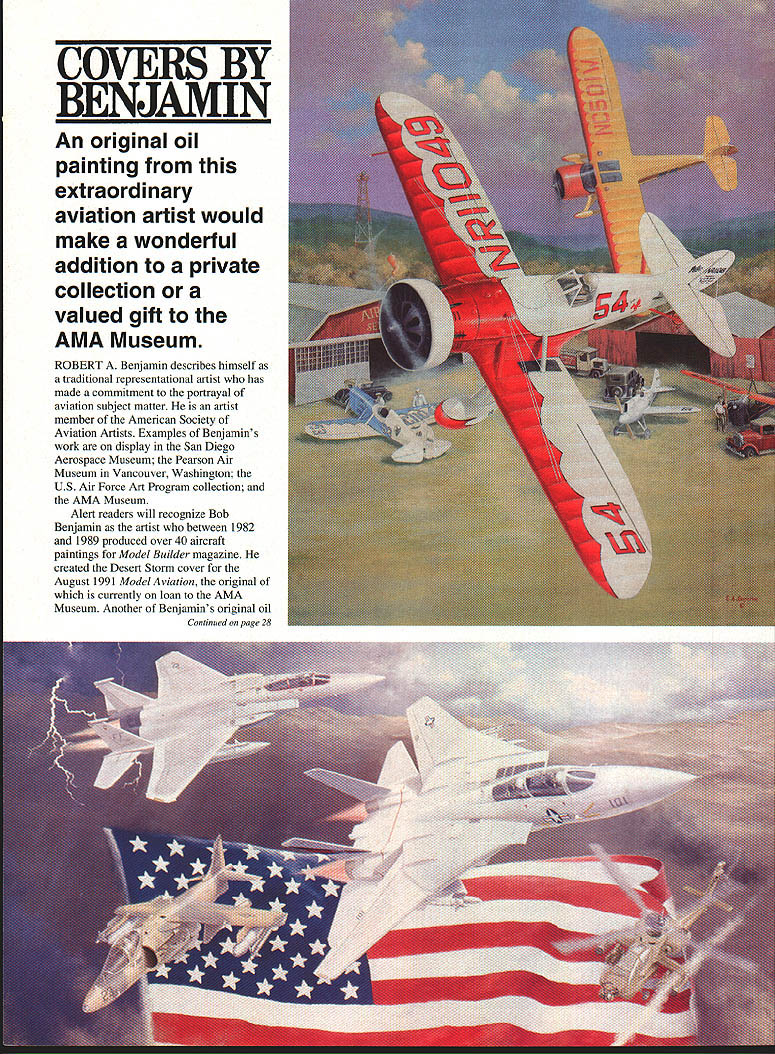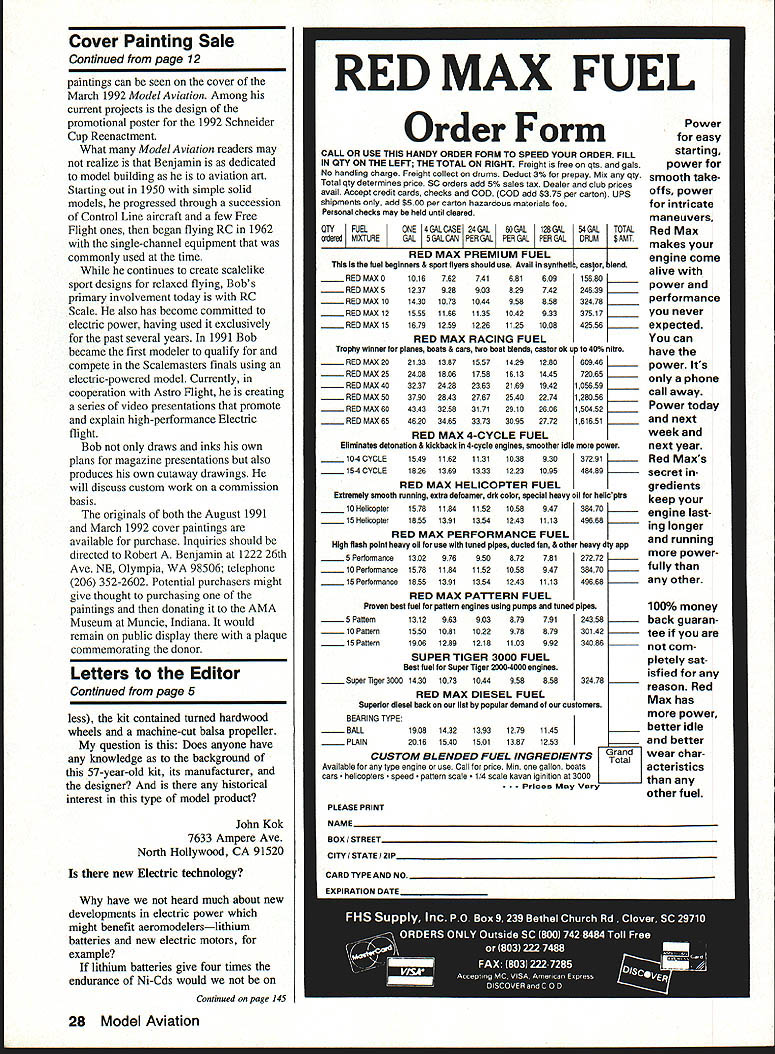COVERS BY BENJAMIN An original oil painting extraordinary aviation artist would make wonderful addition private collection valued gift AMA Museum ROBERT Benjamin describes himself traditional representational artist has made commitment portrayal aviation subject matter artist member American Society Aviation Artists Examples Benjamins work display San Diego Aerospace Museum Pearson Air Museum Vancouver Washington US Air Force Art Program collection AMA Museum Alert readers will recognize Bob Benjamin artist between 1982 1989 produced over 40 aircraft paintings Model Builder magazine created Desert Storm cover August 1991 Model Aviation original currently loan AMA Museum Another Benjamins original oil Continued poge 28 Cover Painting Sale Continued page 12 paintings can seen cover March 1992 Model Aviation Among current projects design promotional poster 1992 Schneider Cup Reenactment What Model Aviation readers may realize Benjamin dedicated model building aviation art Starting out 1950 simple solid models progressed through succession Control Line aircraft few Free Flight ones began flying RC 1962 single-channel equipment commonly used time continues create scalelike sport designs relaxed flying Bobs primary involvement today RC Scale also has become committed electric power having used exclusively past several years 1991 Bob became first modeler qualify compete Scalemasters finals using electric-powered model Currently cooperation Astro Flight creating series video presentations promote explain high-performance Electric flight Bob draws inks own plans magazine presentations also produces own cutaway drawings will discuss custom work commission basis originals both August 1991 March 1992 cover paintings available purchase Inquiries should directed Robert Benjamin 1222 26th Ave NE Olympia WA 98506 telephone 206 352-2602 Potential purchasers might give thought purchasing paintings donating AMA Museum Muncie Indiana would remain public display plaque commemorating donor Letters Editor Continued page 5 less kit contained turned hardwood wheels machine-cut balsa propeller question Does anyone have knowledge background 57-year-old kit its manufacturer designer historical interest type model product John Kok 7633 Ampere Ave North Hollywood CA 91520 new Electric technology have heard much about new developments electric power might benefit aeromodelerslithium batteries new electric motors example lithium batteries give four times endurance Ni-Cds would .....,.RED MAX 0101676274168160915680 RED MAX 5123792890382974224639 -...RED MAX 10 1430 1073 1044 958 858 32478 RED MAX 12 1555 1166 1135 1042 933 37517 RED MAX 15 1679 1259 1226 1125 1008 42556 RED MAX RACING FUEL Trophy winner planes boats & cars two boat blends castor ok up 40% nhtro RED MAX 2021 33138715571429128060946 _____ RED MAX 252408180617581613144572065 RED MAX 40 3237 2428 2363 2169 1942 105659 RED MAX 50 3790 2843 2767 2540 2274 128056 RED MAX 60 4343 3258 3171 2910 2606 150452 .......RED MAX 6546203465337330952772161651 RED MAX 4-CYCLE FUEL Eliminates detonation & kickback 4-cycle engines smoother idle power 10-4CYCLE154911621131103893037291 15-4 CYCLE1826136913331223109548489 RED MAX HELICOPTER FUEL Extremely smooth running extra defosmer drk color special heavy oil helloplrs lOHelicopter157811841152105894738470 15 HeOcopter1855139113541243111349668 RED MAX PERFORMANCE FUEL High flash point heavy oil tor use tuned pipes ducted fan & other heavy dty app easy starting power smooth take offs power intricate maneuvers TOTAL Red Max $AJlT makes engine come alive power performance never expected can have power Its phone call away Power today next week next year ___Red Maxs secret gredients keep engine last ing longer running 78127272more power 94738470fully ____111349668any other 100% money back guaran tee com pletely sat isfied ______32478 reason Red Max has power _____19081432139312791145better idle 20161540150113871253and better CUSTOM BLENDED FUEL INGREDIENTS charAvailable type engine use Call price Mm gallon boats acteristics cars helicopters speed pattern scale scale kavan iginition 3000 . Prices May Vary other fuel 28 Model Aviation 1302976950872 1578118411521058 1855139113541243 RED MAX PATTERN FUEL Proven best fuel paltem engines using pumps tuned pipes 5 Paoem131296390387979124358 10 Pattern15501081102297887930142 iSPattem190612891218110399234086 SUPER TIGER 3000 FUEL Best fuel tor Super Tiger 2000-4000 engInes _____ Saperflger3000 143010731044958858 RED MAX DIESEL FUEL Superior diesel back list popular demand customers BEARING TYPE ______ BALL .PLAIN Order Form CALL OR USE THIS HANDY ORDER FORM TO SPEED YOUR ORDER FILL IN OTY ON THE LEFT THE TOTAL ON RIGHT Freight free qts gala No handling charge Freight collect drums Deduct 3% prepay Mix qty Total qty determines price SC orders add 5% sales tax Dealer club pricex avail Accept credit cards checks COD COD add $375 per carton UPS shipments add $500 per carton hazardous materials fee Personal checks may held until cleared OTYPuaONE4GALCASE 24GALtOGAL128GAL orderedMIXTUREGAL5 GAL CAN PER GALPER GALPER GAL Power 54 GAL DRUM caaor tiend RED MAX PREMIUM FUEL lathe fuel beginners & sport flyers should use Avail syntheti RED MAX FUEL Continued page 145 Performance 10 Performance 15 Performance PLEASE PRINT NAME CiTy CTArC IO EXPIRATION DATE________