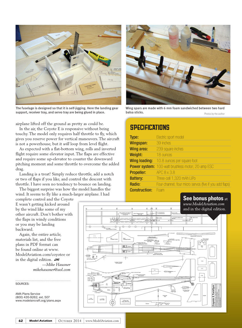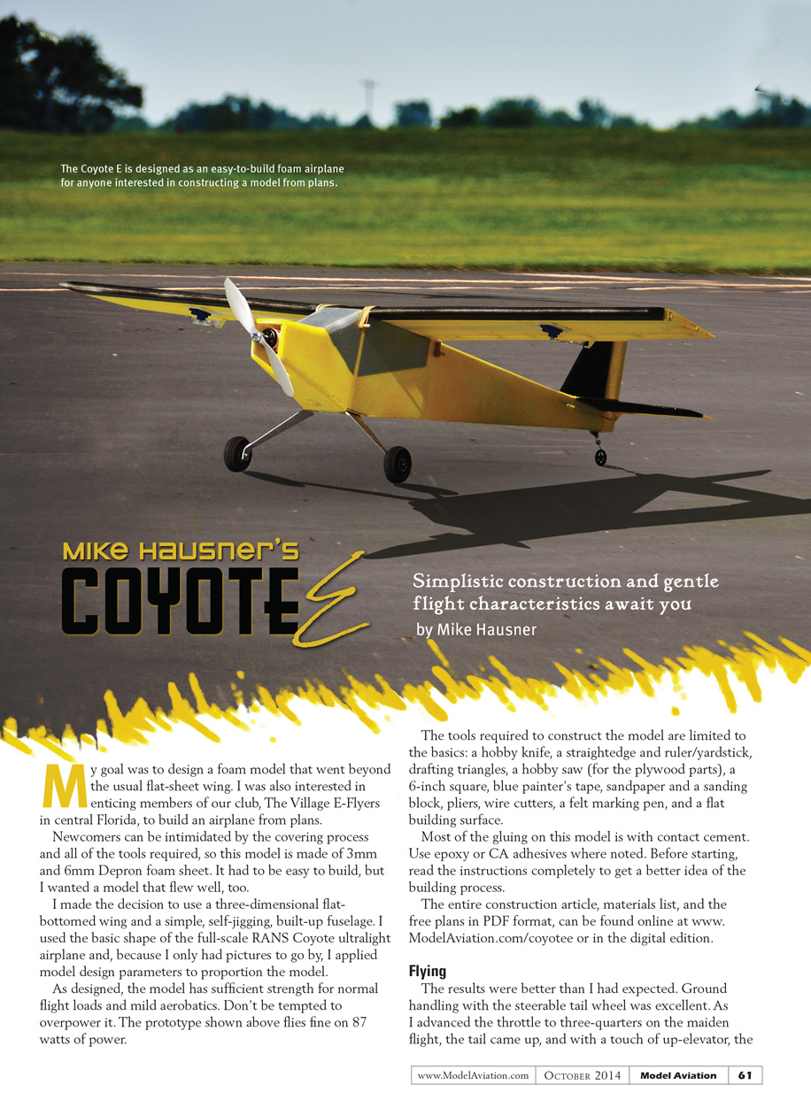 The entire construction article, materials list, and the free plans in PDF format can be found online at www.ModelAviation.com/coyotee or in the digital edition.